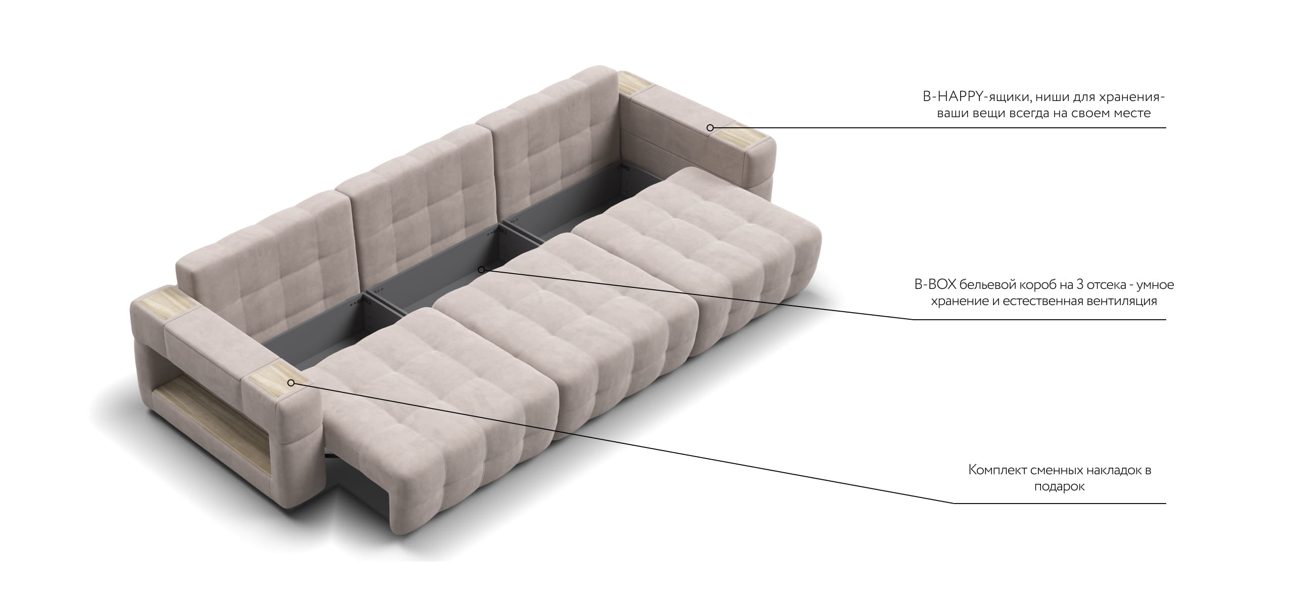 Покупая диван BOSS.XO MAX вы становитесь обладателем уникальных подарков: быстрая зарядка для смартфона, 2 стильных кружки, 2 удобных столика для ноутбука, 2 подушки, комплект запасных накладок на подлокотники B-HAPPY®️, экоручки и средство для чистки BOSS Clean.