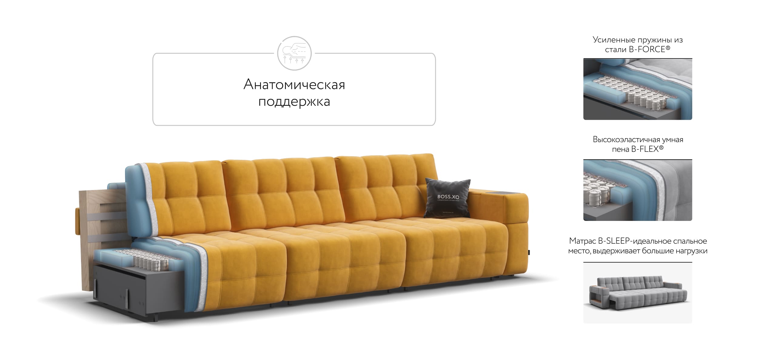 BOSS.XO MAX по своим характеристикам лучше многих диванов с ценой от 300 тысяч рублей.