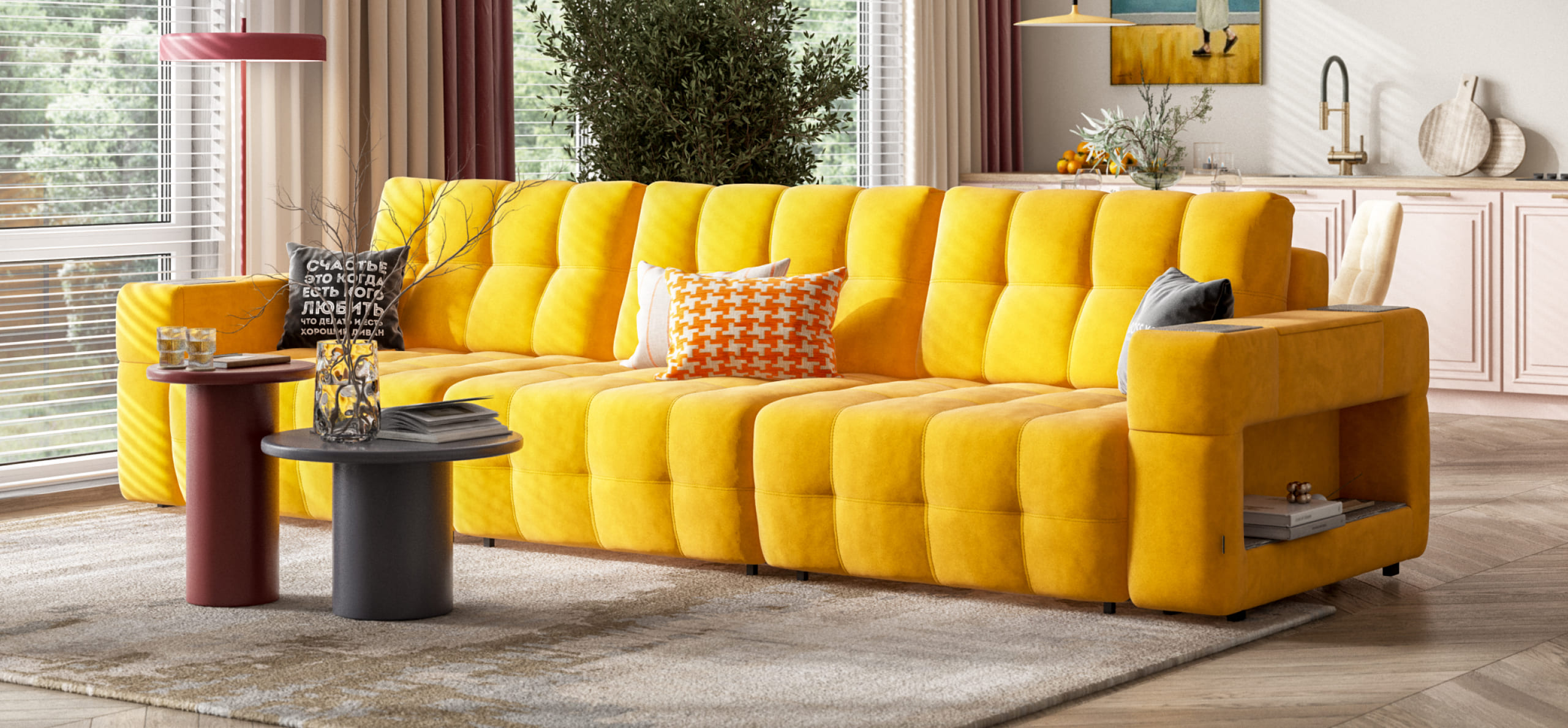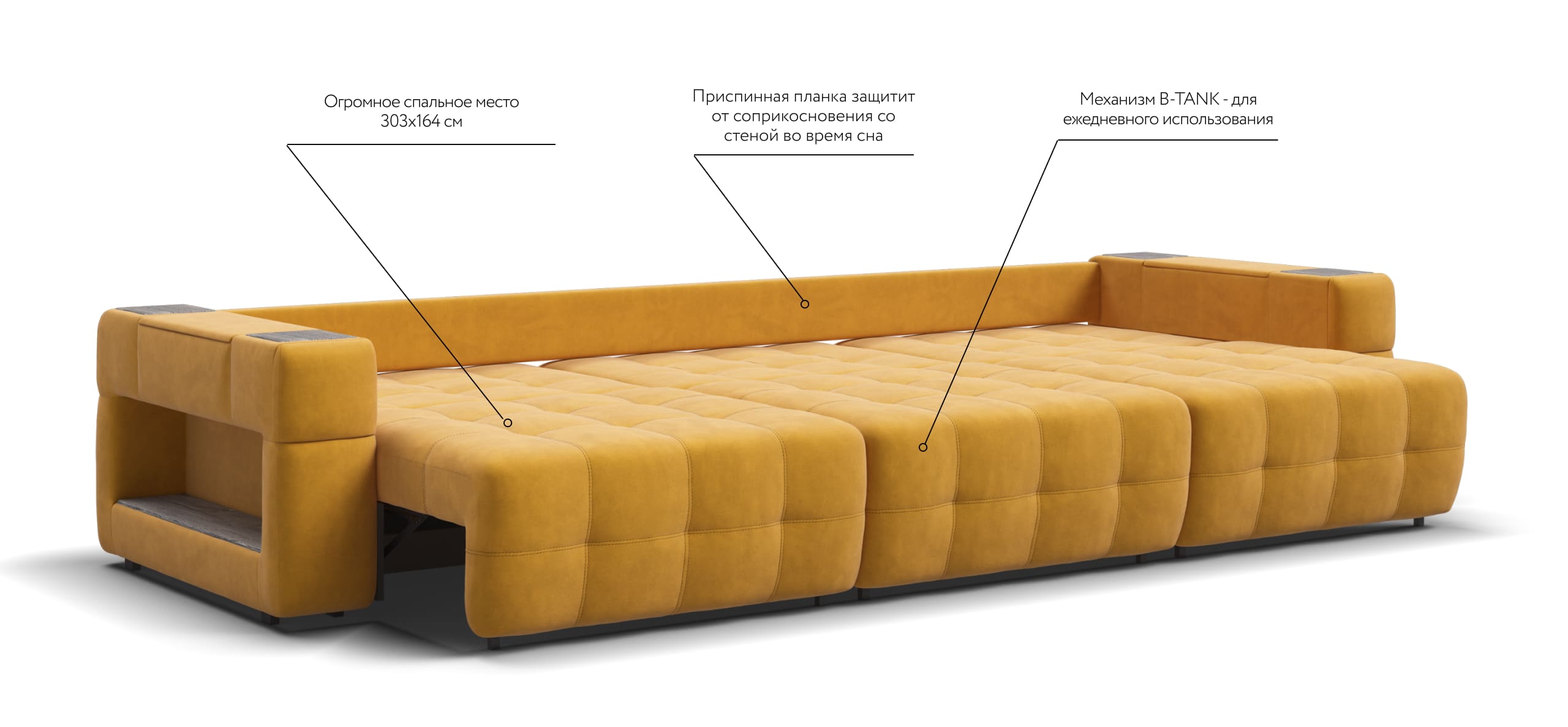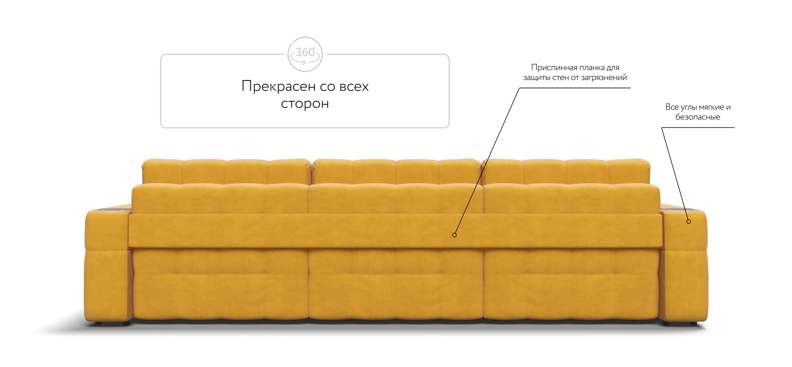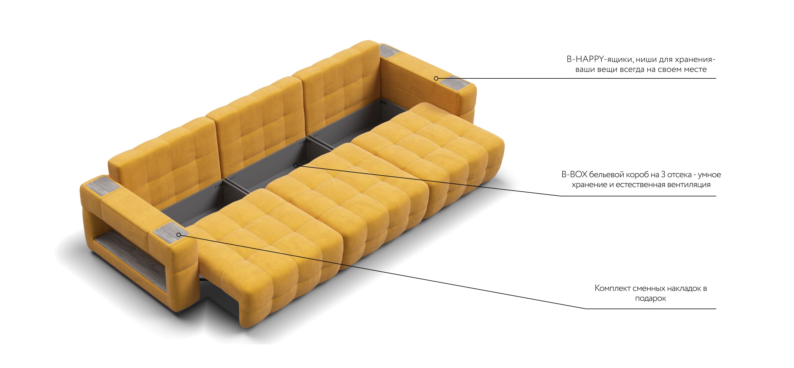 Покупая диван BOSS.XO MAX вы становитесь обладателем уникальных подарков: быстрая зарядка для смартфона, 2 стильных кружки, 2 удобных столика для ноутбука, 2 подушки, комплект запасных накладок на подлокотники B-HAPPY®️, экоручки и средство для чистки BOSS Clean.