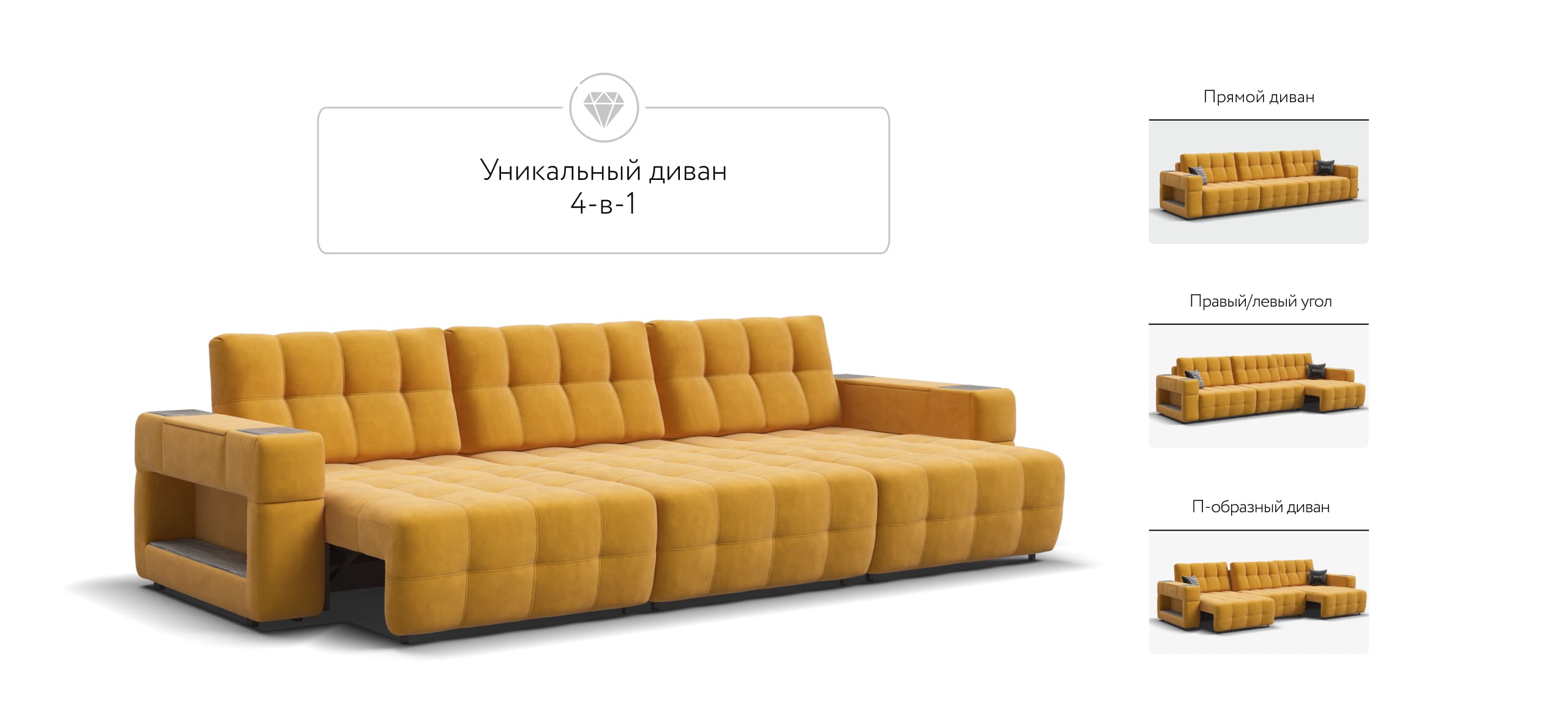 BOSS.XO MAX - это и прямой, угловой и П-образный диван сразу, за 10 секунд вы можете превратить его в правый или левый угол, а также в П-образный.