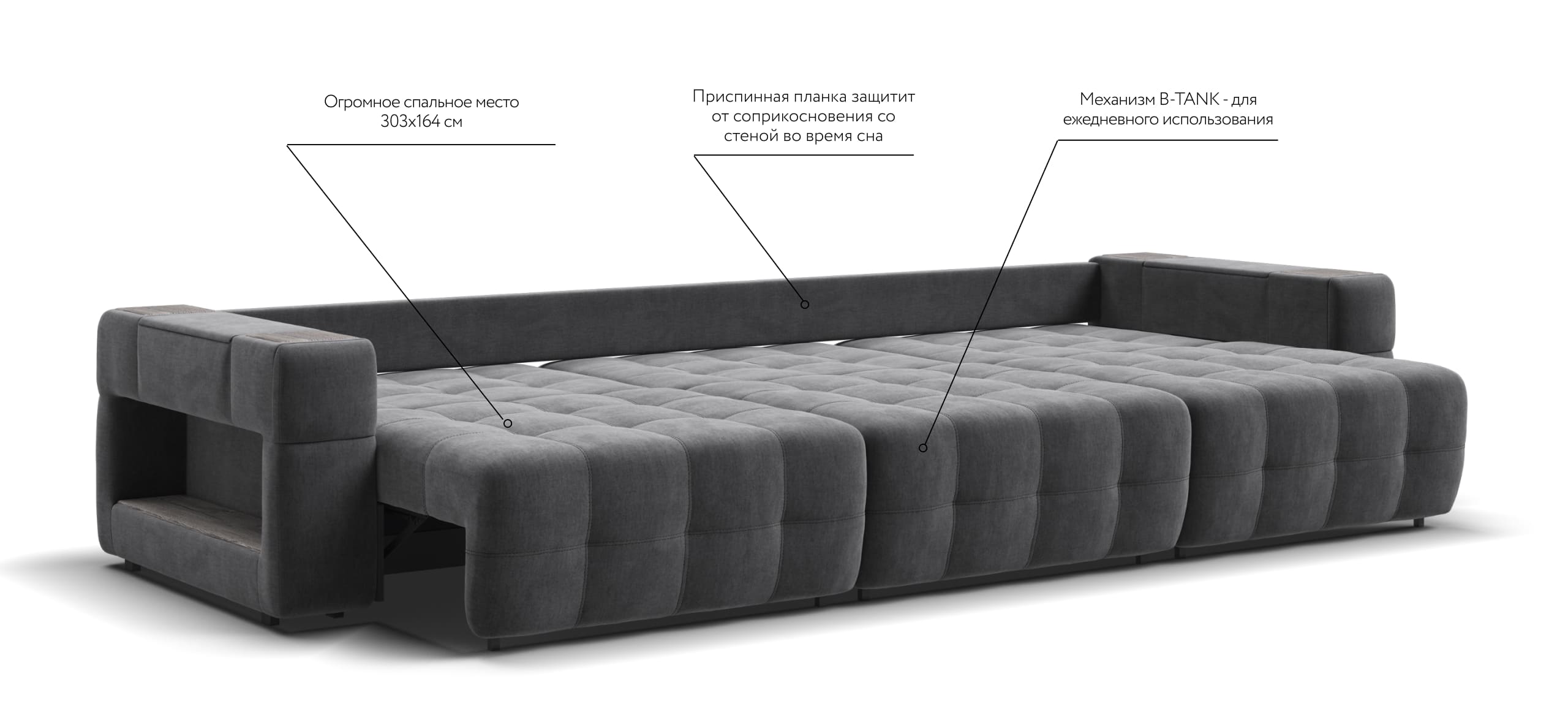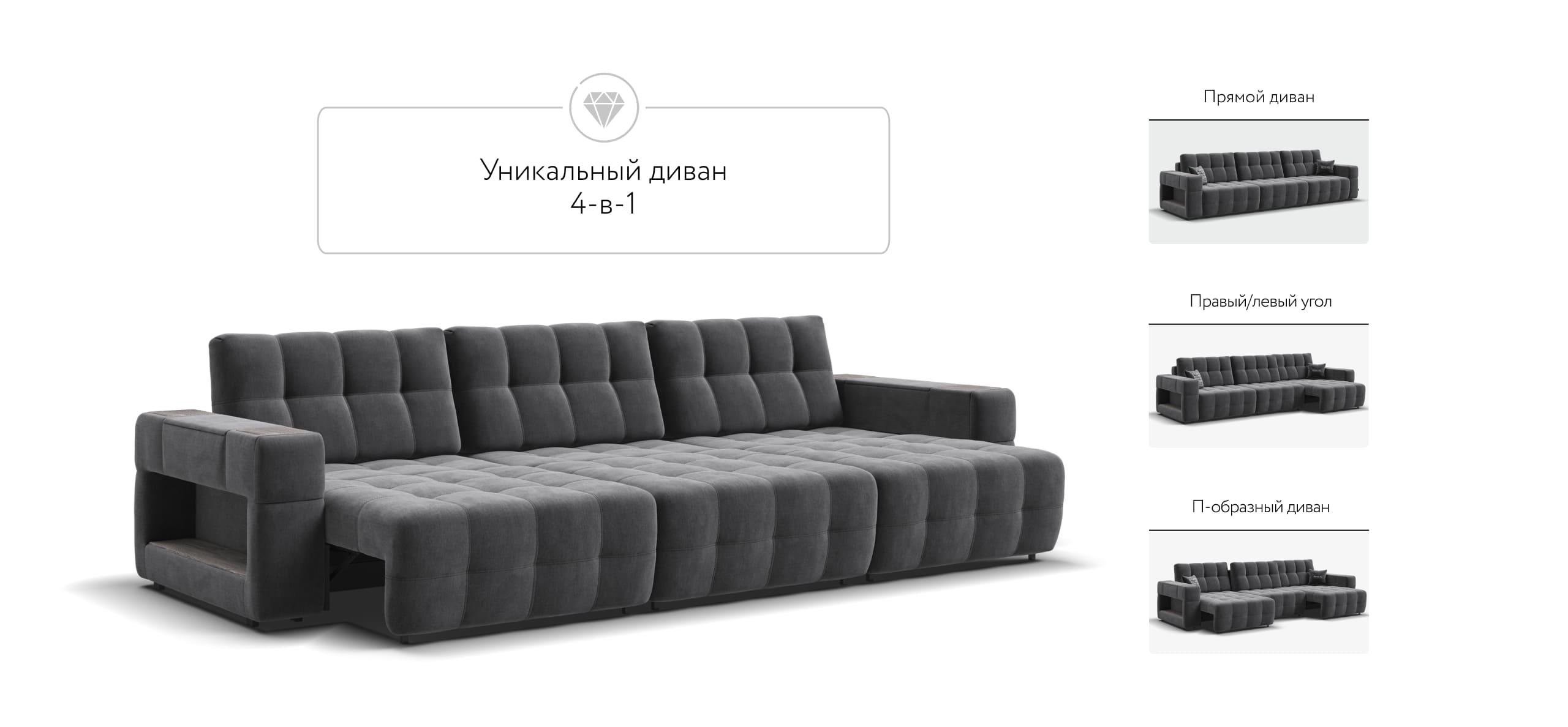 BOSS.XO MAX - это и прямой, угловой и П-образный диван сразу, за 10 секунд вы можете превратить его в правый или левый угол, а также в П-образный.
