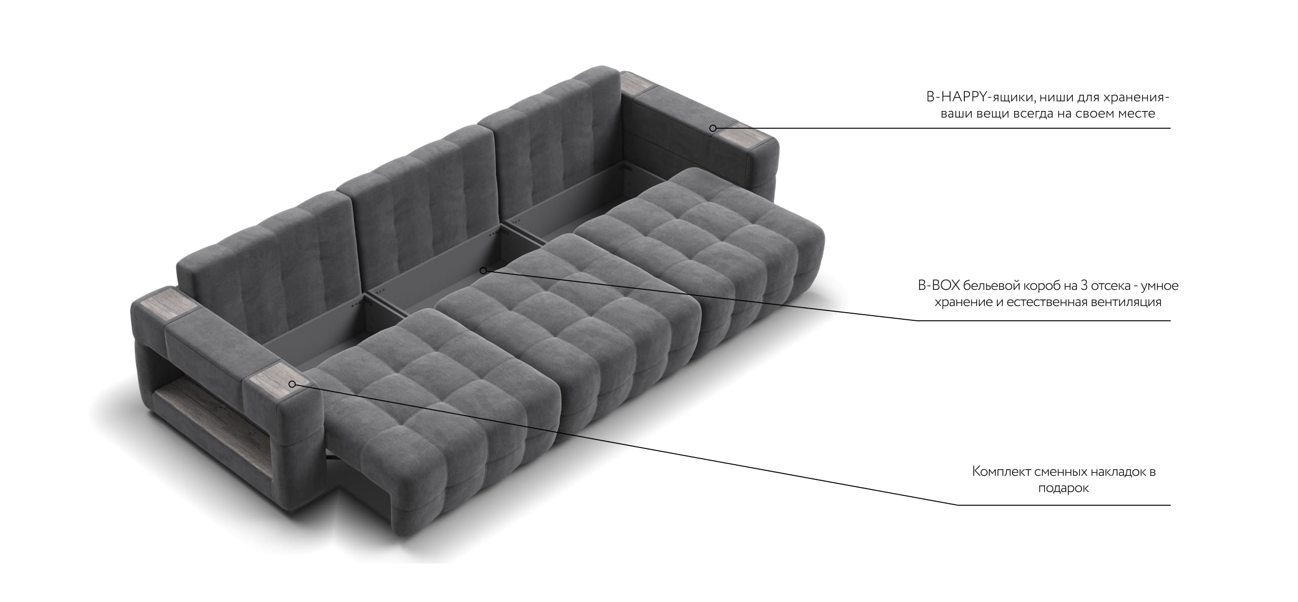 Покупая диван BOSS.XO MAX вы становитесь обладателем уникальных подарков: быстрая зарядка для смартфона, 2 стильных кружки, 2 удобных столика для ноутбука, 2 подушки, комплект запасных накладок на подлокотники B-HAPPY®️, экоручки и средство для чистки BOSS Clean.