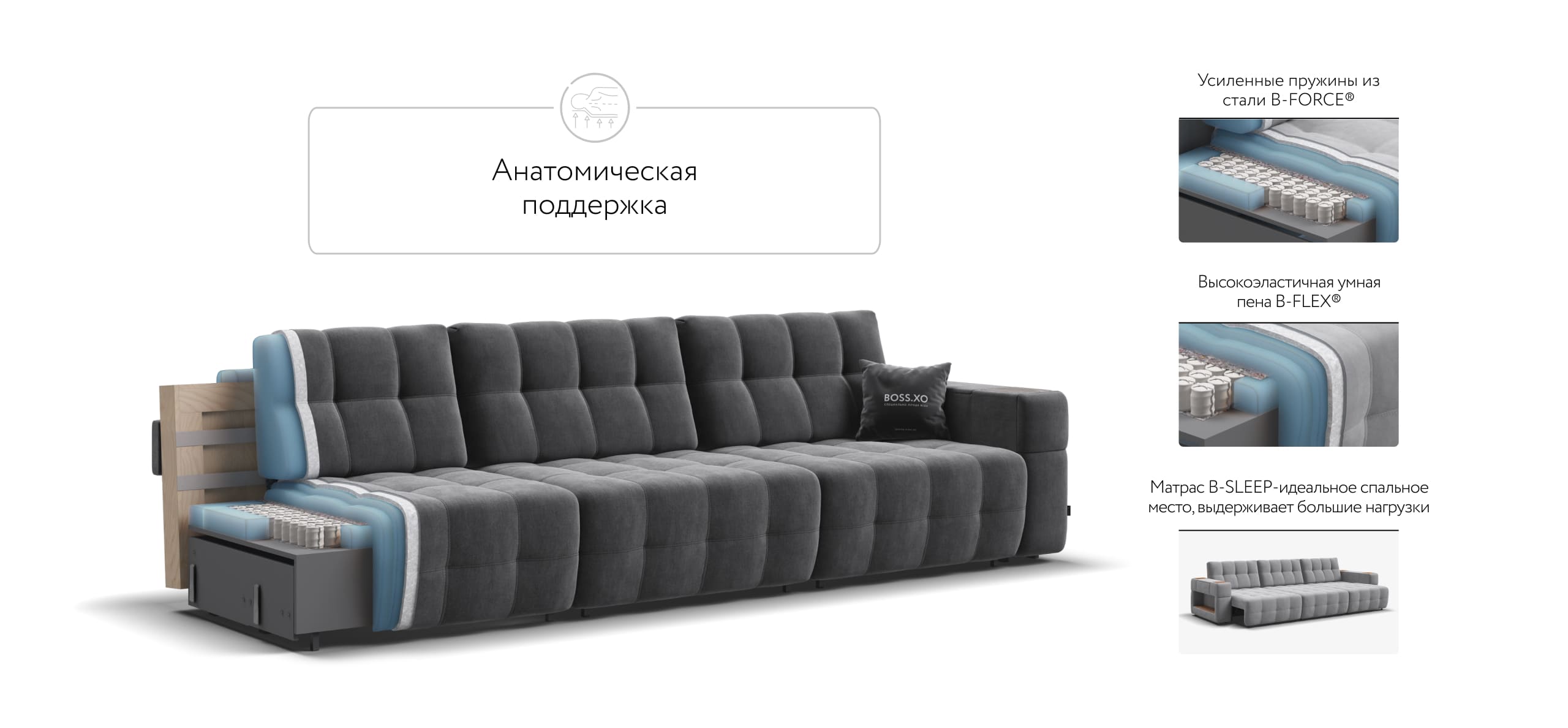 BOSS.XO MAX по своим характеристикам лучше многих диванов с ценой от 300 тысяч рублей.