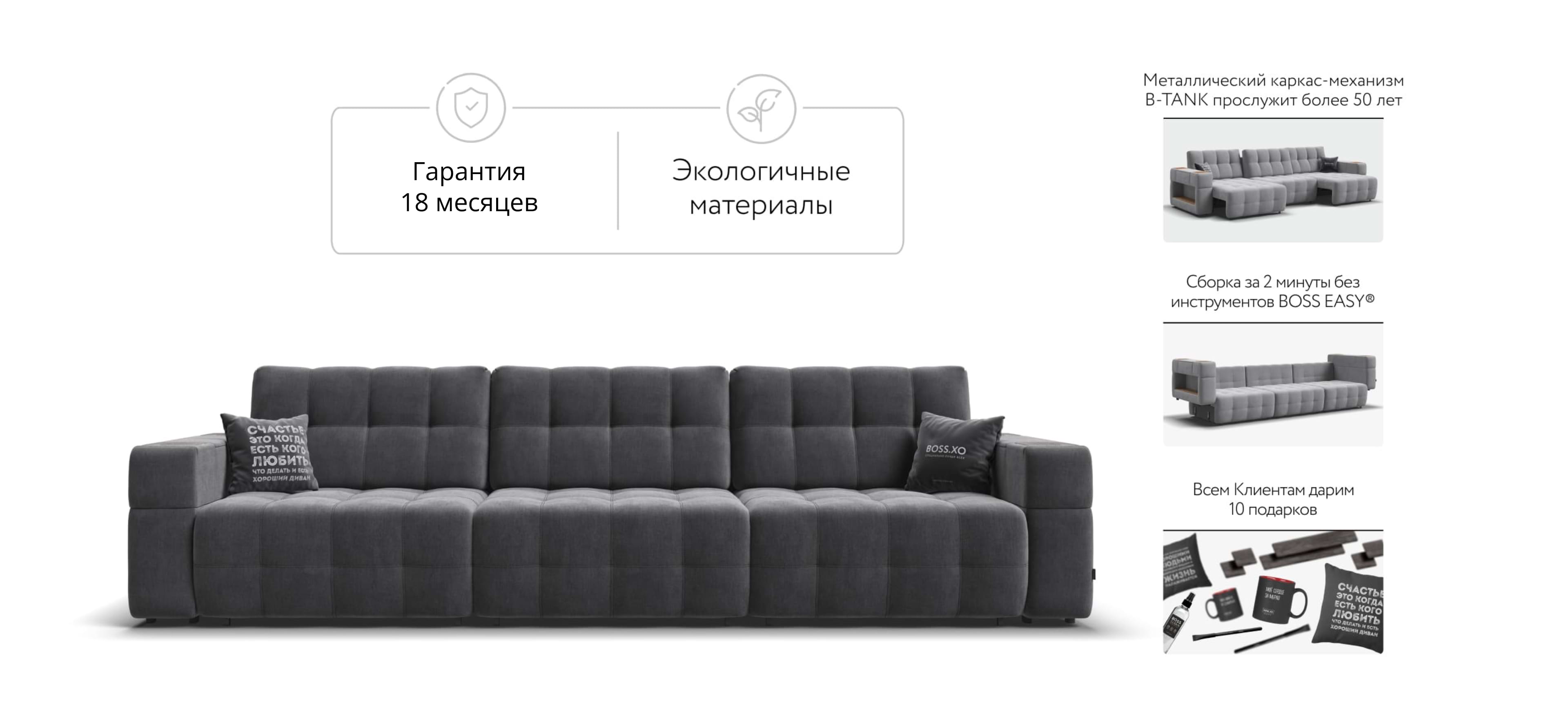 Покупая диван BOSS.XO MAX вы становитесь обладателем уникальных подарков: быстрая зарядка для смартфона, 2 стильных кружки, 2 удобных столика для ноутбука, 2 подушки, комплект запасных накладок на подлокотники B-HAPPY®️, экоручки и средство для чистки BOSS Clean.