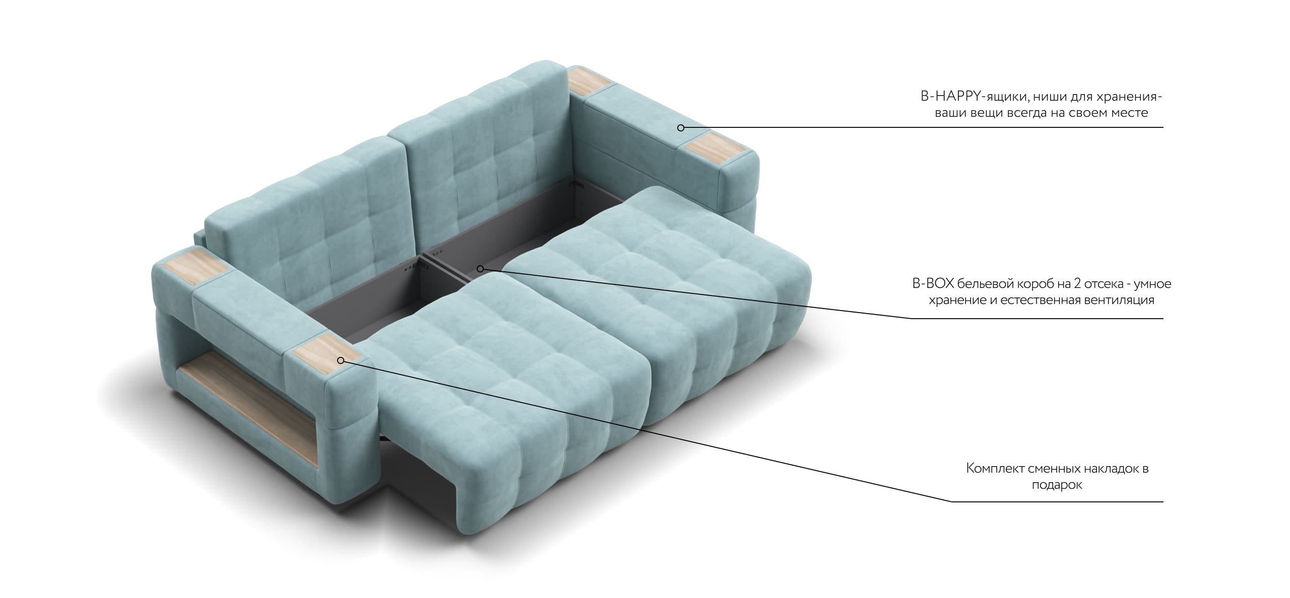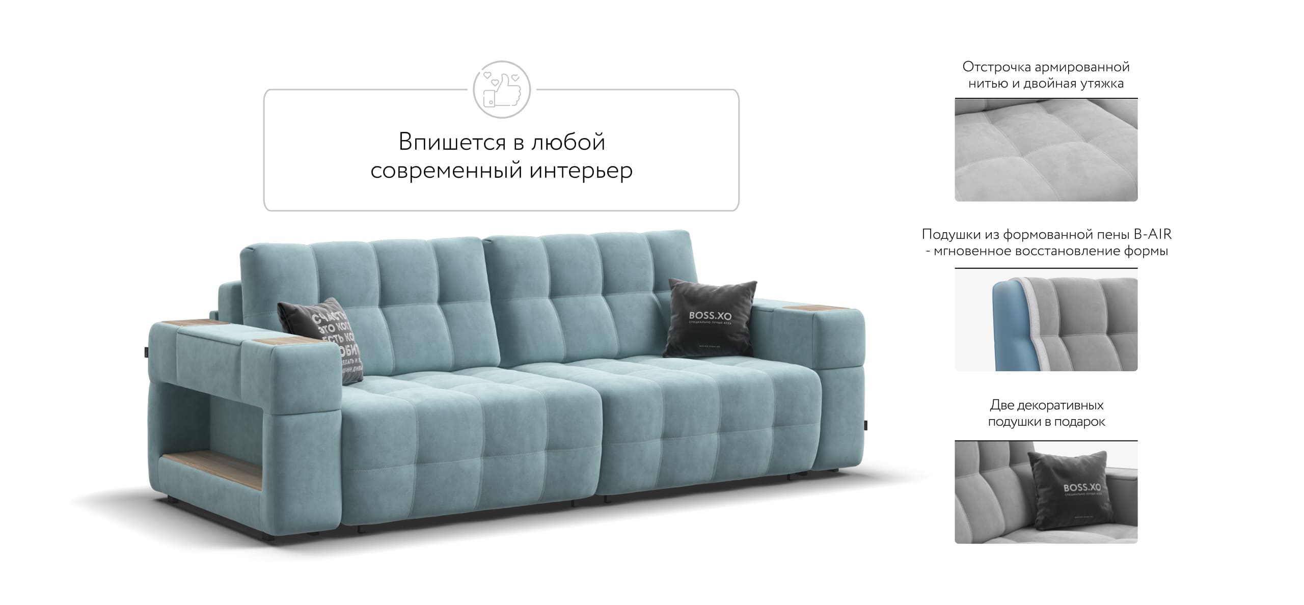 Покупая диван BOSS.XO вы становитесь обладателем уникальных подарков: быстрая зарядка для смартфона, 2 стильных кружки, 2 удобных столика для ноутбука, 2 подушки, комплект запасных накладок на подлокотники B-HAPPY®️, экоручки и средство для чистки BOSS Clean.Преимущества материала