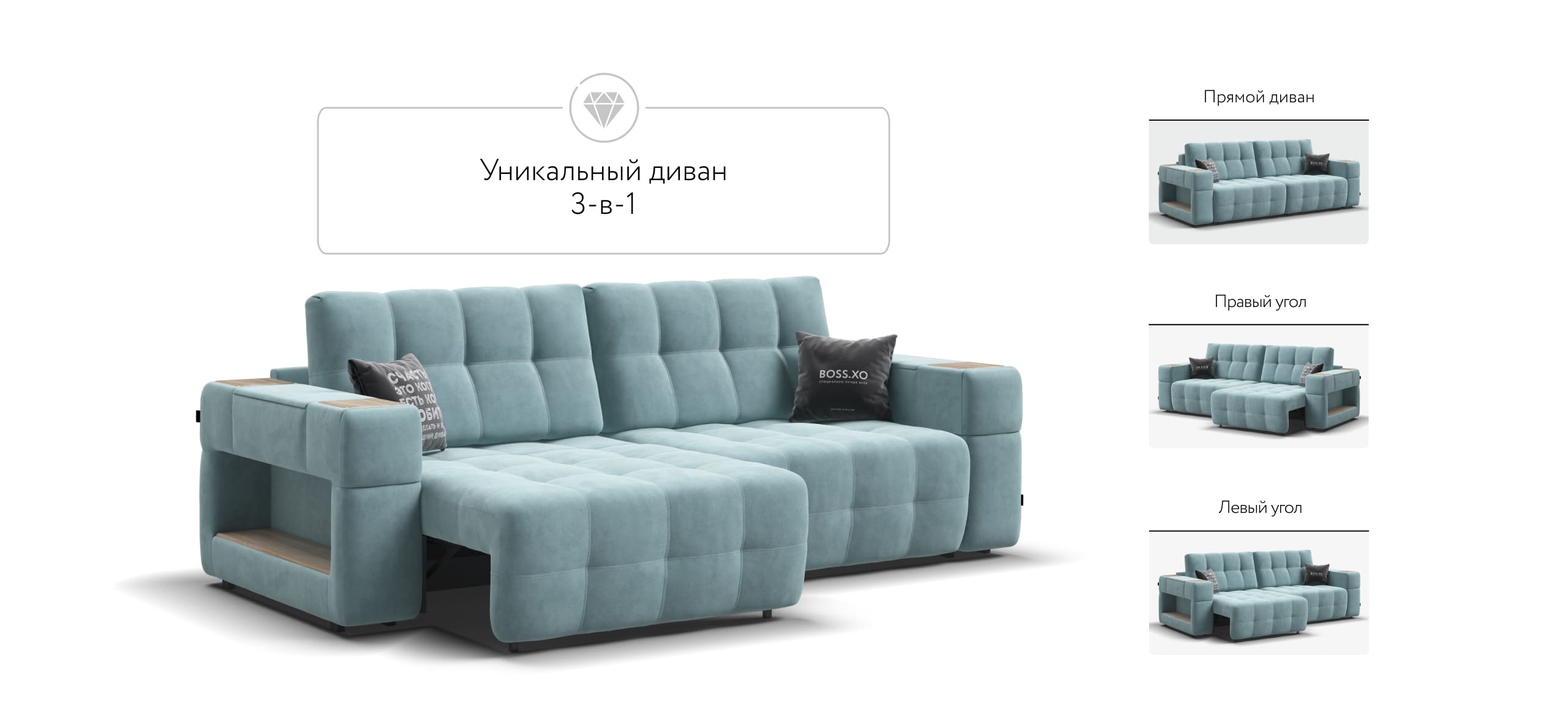 BOSS.XO - это и прямой и угловой диван сразу, за 10 секунд вы можете превратить его в правый или левый угол.
