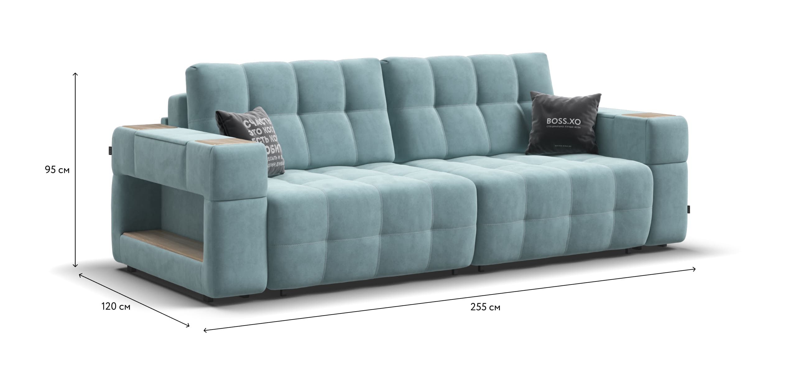 Покупая диван BOSS.XO вы становитесь обладателем уникальных подарков: быстрая зарядка для смартфона, 2 стильных кружки, 2 удобных столика для ноутбука, 2 подушки, комплект запасных накладок на подлокотники B-HAPPY®️, экоручки и средство для чистки BOSS Clean.Характеристики