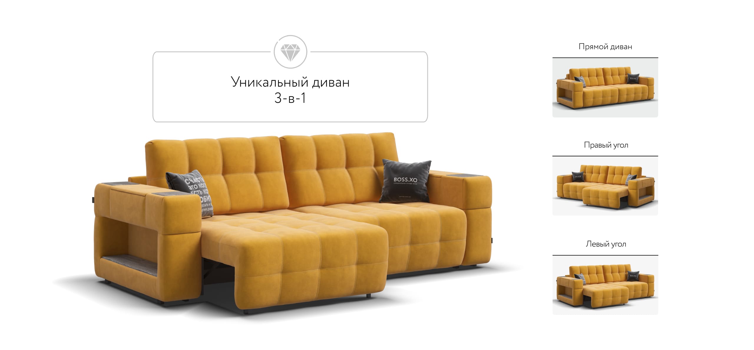 С гордостью представляем новый диван BOSS.XO, разработанный специально для красоты, комфорта и радости в Вашем доме. Это не просто диван - в нём десятки новых функций, которые сделали его центром притяжения для всей Семьи.