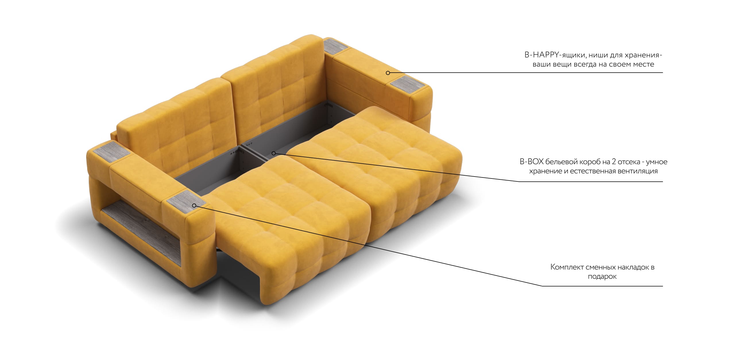 Функциональные подлокотники B-HAPPY: ящики и ниши для хранения, ваши вещи всегда на своем месте.