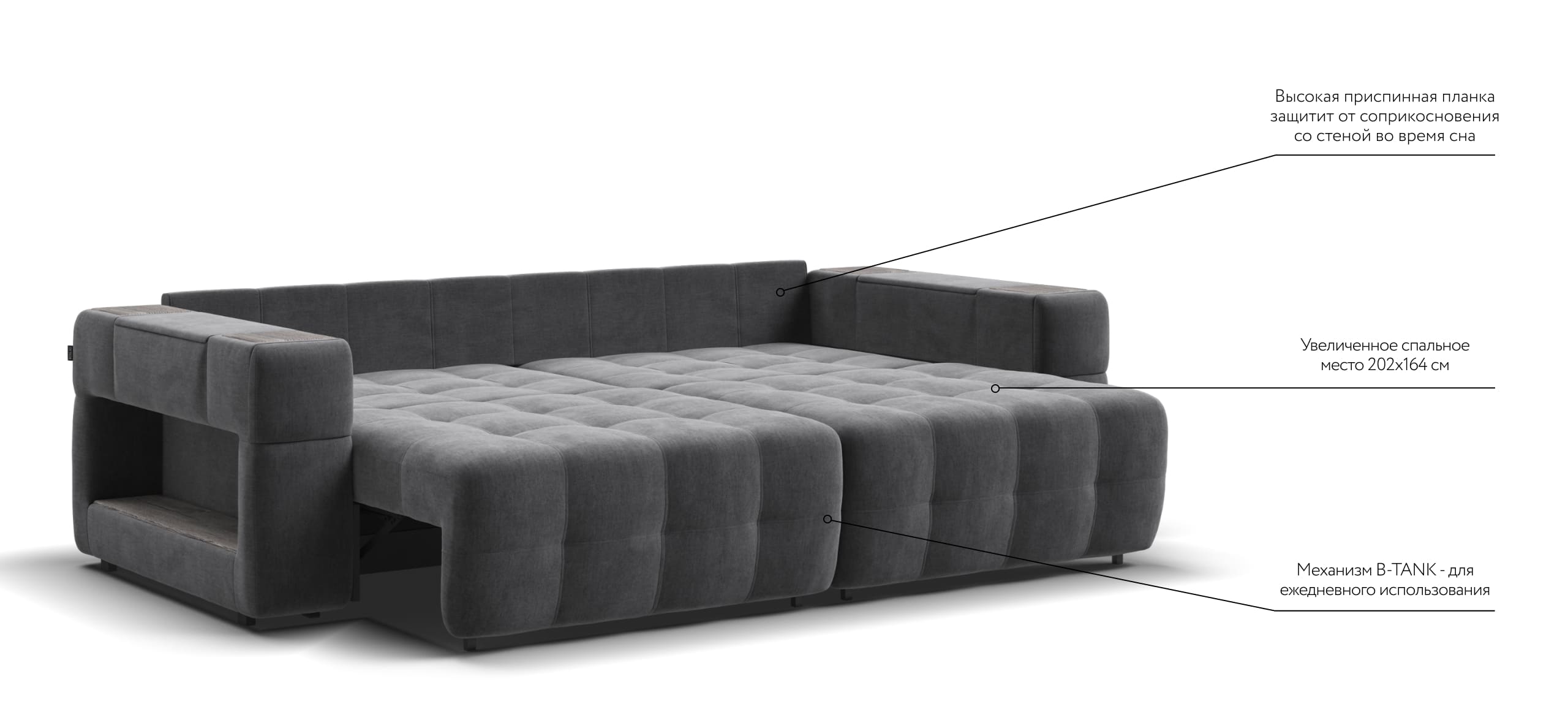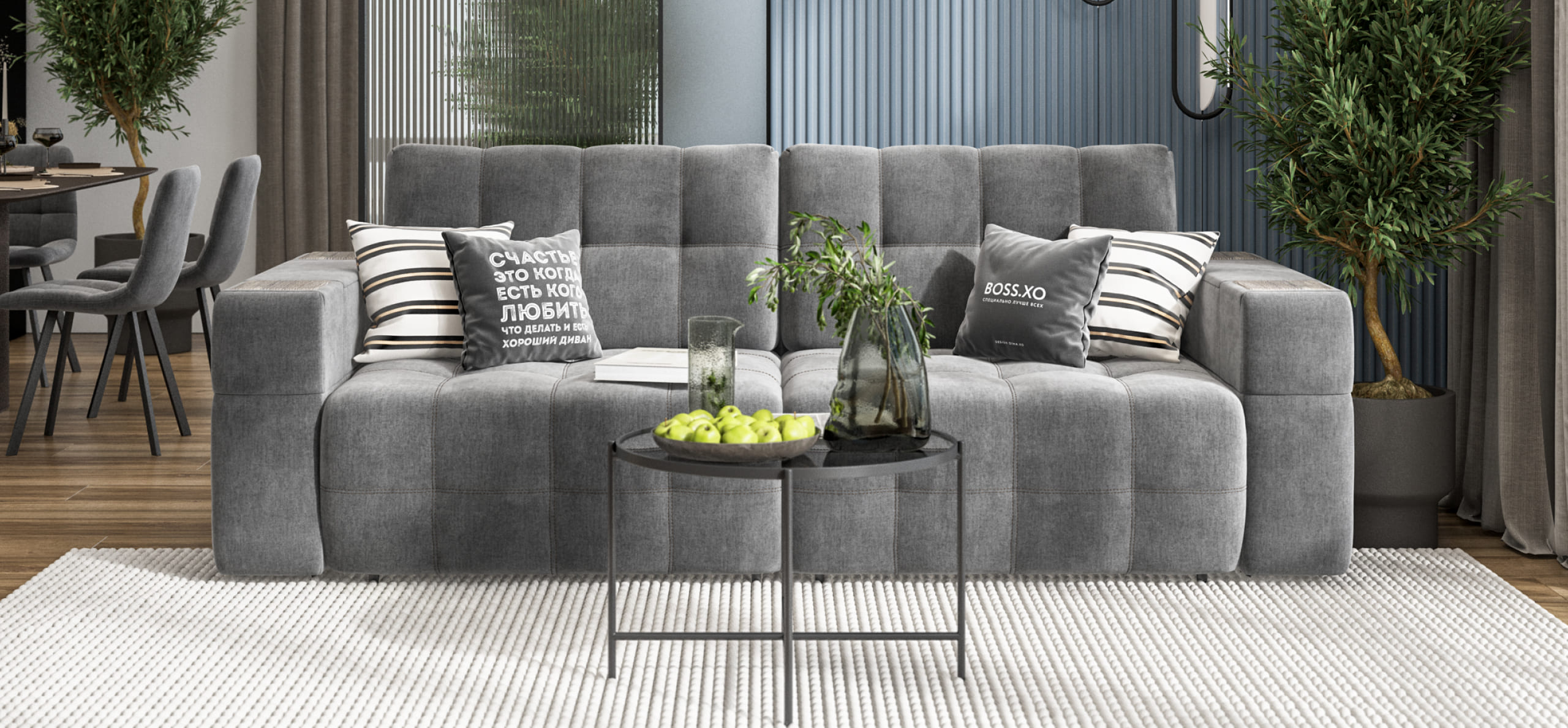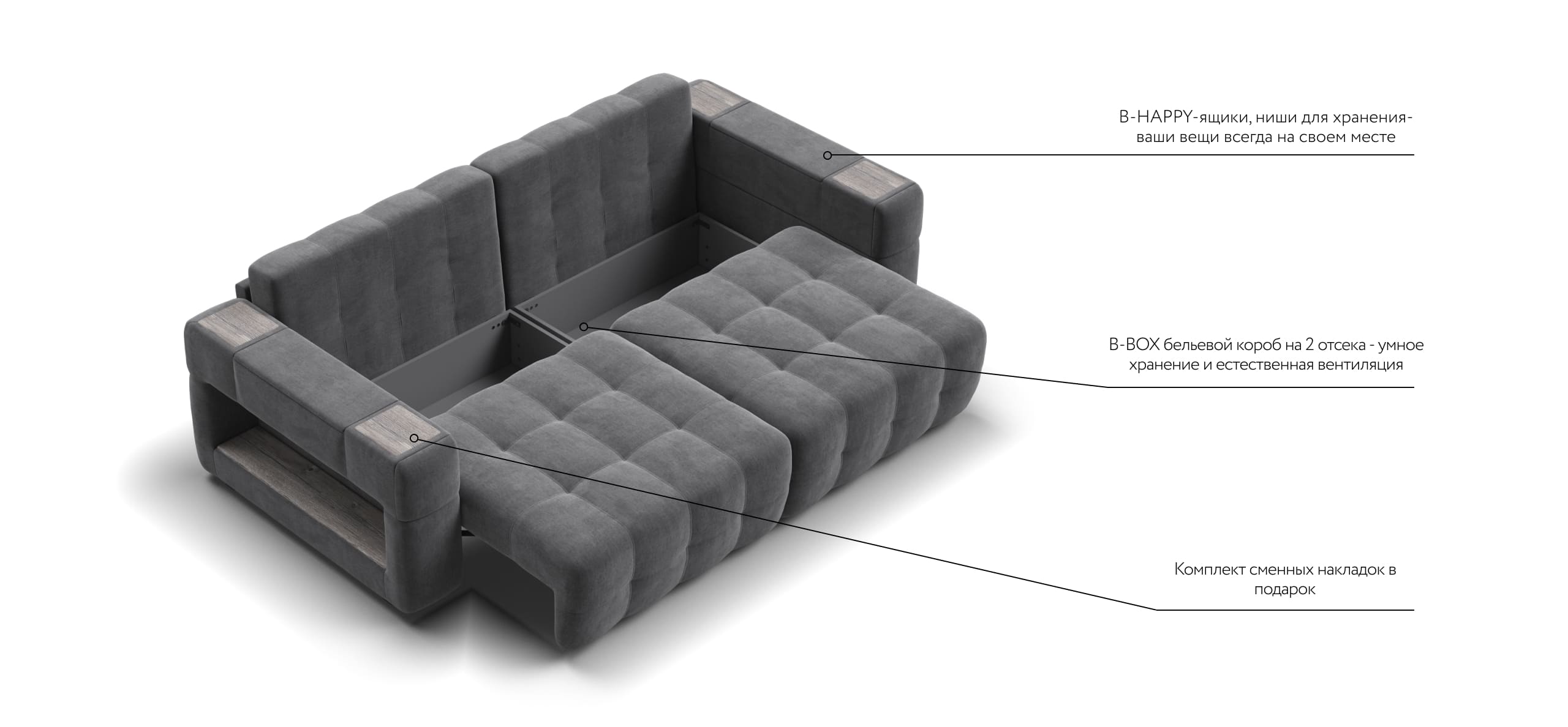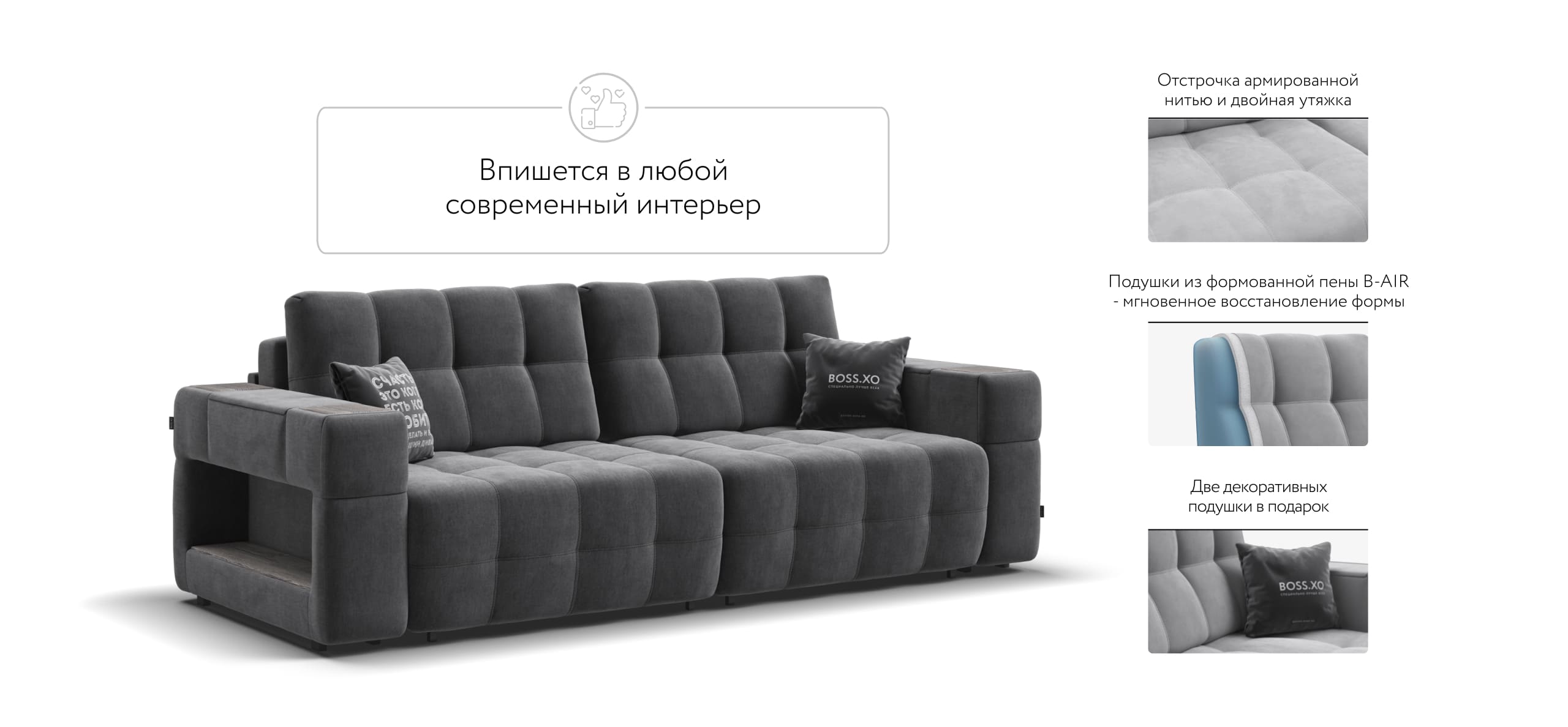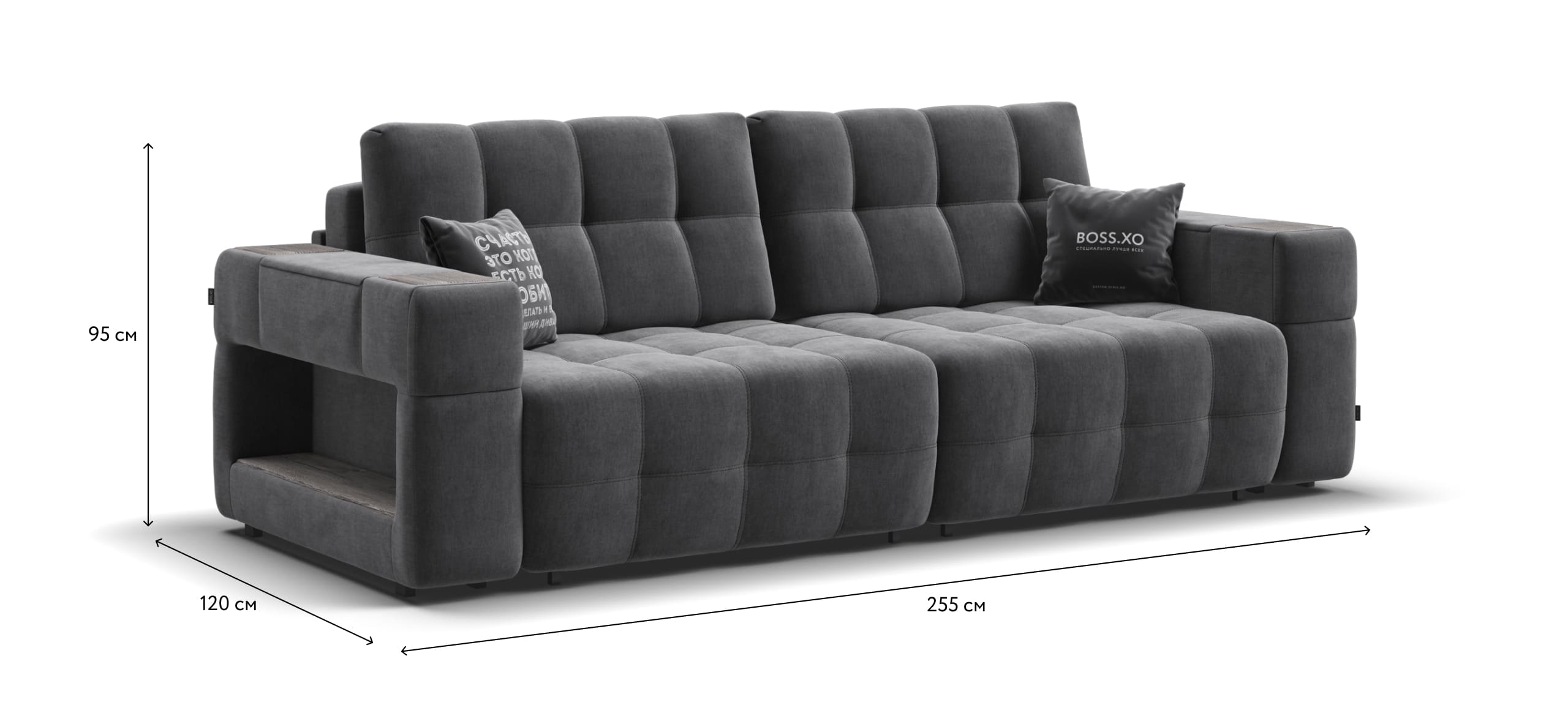 Покупая диван BOSS.XO вы становитесь обладателем уникальных подарков: быстрая зарядка для смартфона, 2 стильных кружки, 2 удобных столика для ноутбука, 2 подушки, комплект запасных накладок на подлокотники B-HAPPY®️, экоручки и средство для чистки BOSS Clean.Характеристики