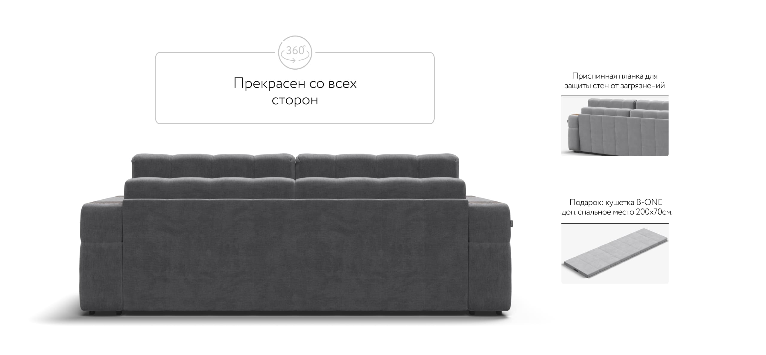 Покупая диван BOSS.XO вы становитесь обладателем уникальных подарков: быстрая зарядка для смартфона, 2 стильных кружки, 2 удобных столика для ноутбука, 2 подушки, комплект запасных накладок на подлокотники B-HAPPY®️, экоручки и средство для чистки BOSS Clean.Преимущества материала