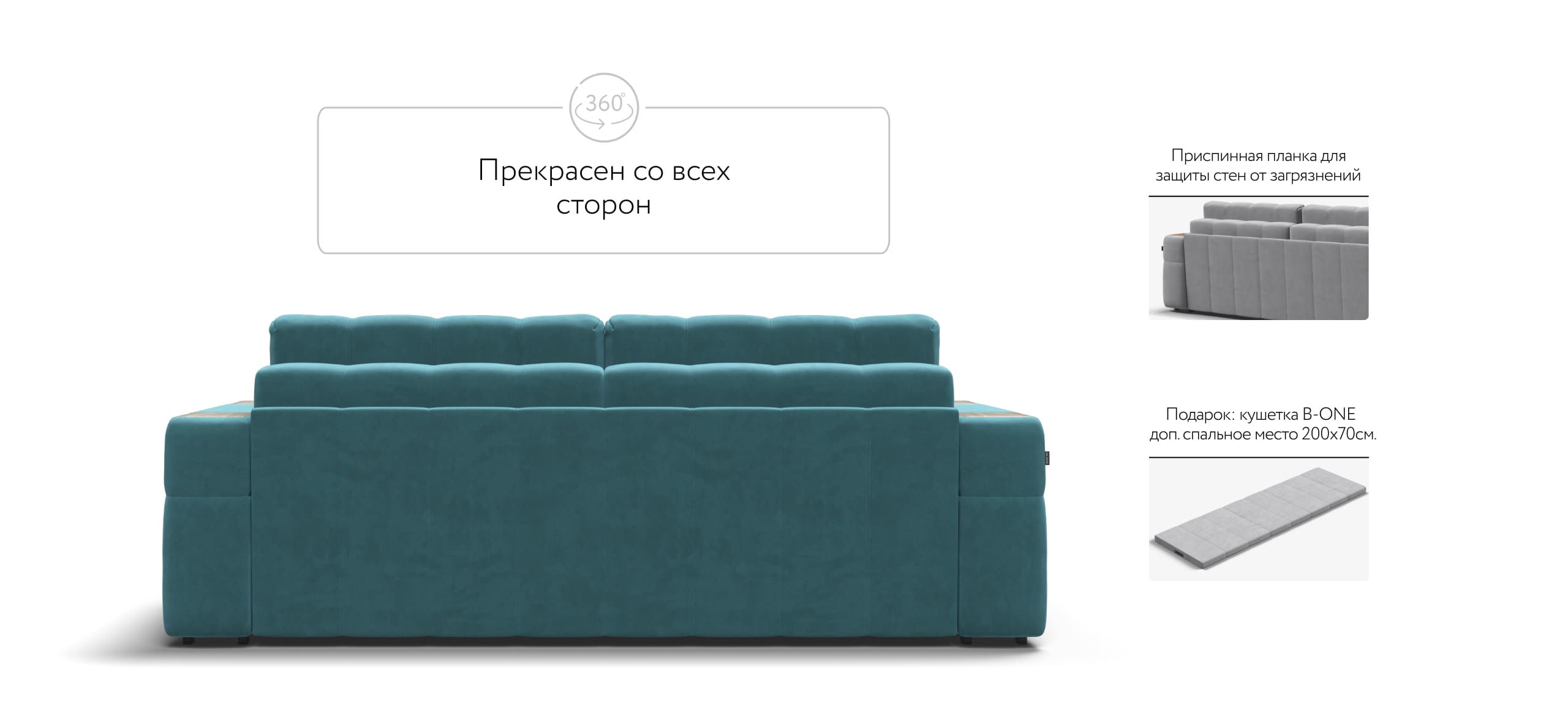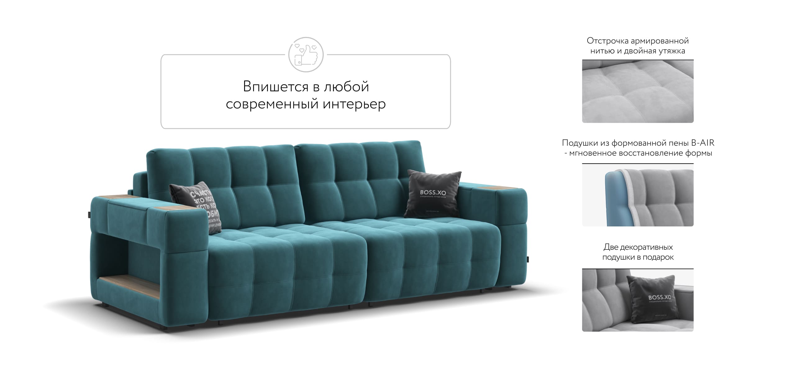 Покупая диван BOSS.XO вы становитесь обладателем уникальных подарков: быстрая зарядка для смартфона, 2 стильных кружки, 2 удобных столика для ноутбука, 2 подушки, комплект запасных накладок на подлокотники B-HAPPY®️, экоручки и средство для чистки BOSS Clean.Преимущества материала