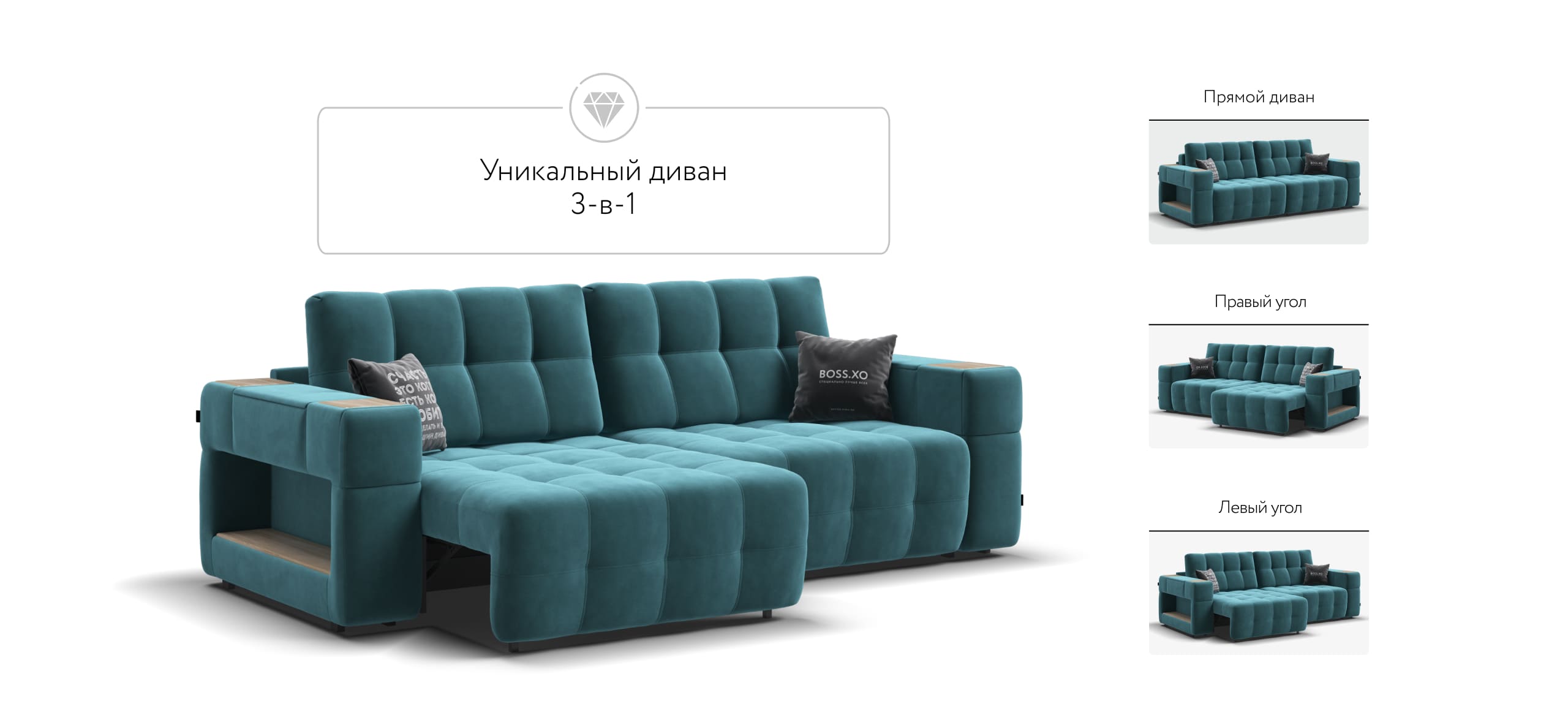 BOSS.XO - это и прямой и угловой диван сразу, за 10 секунд вы можете превратить его в правый или левый угол.