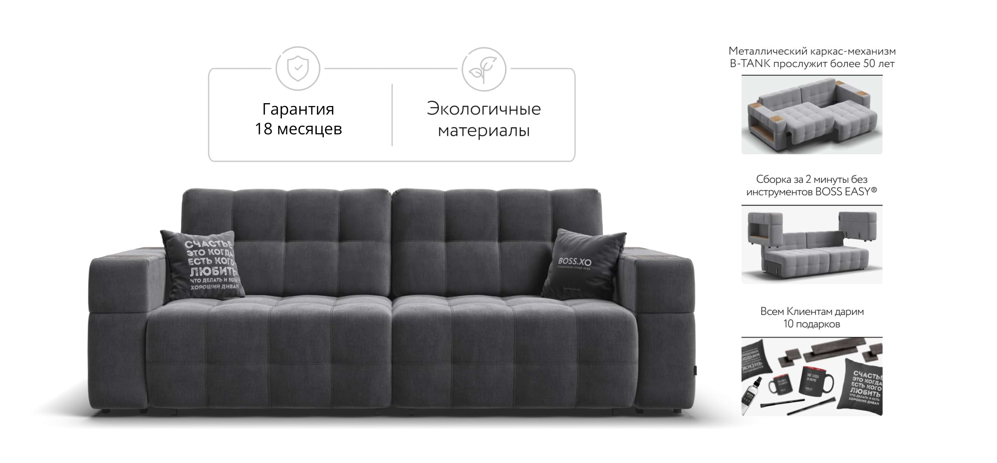 Покупая диван BOSS.XO вы становитесь обладателем уникальных подарков: быстрая зарядка для смартфона, 2 стильных кружки, 2 удобных столика для ноутбука, 2 подушки, комплект запасных накладок на подлокотники B-HAPPY®️, экоручки и средство для чистки BOSS Clean.Характеристики