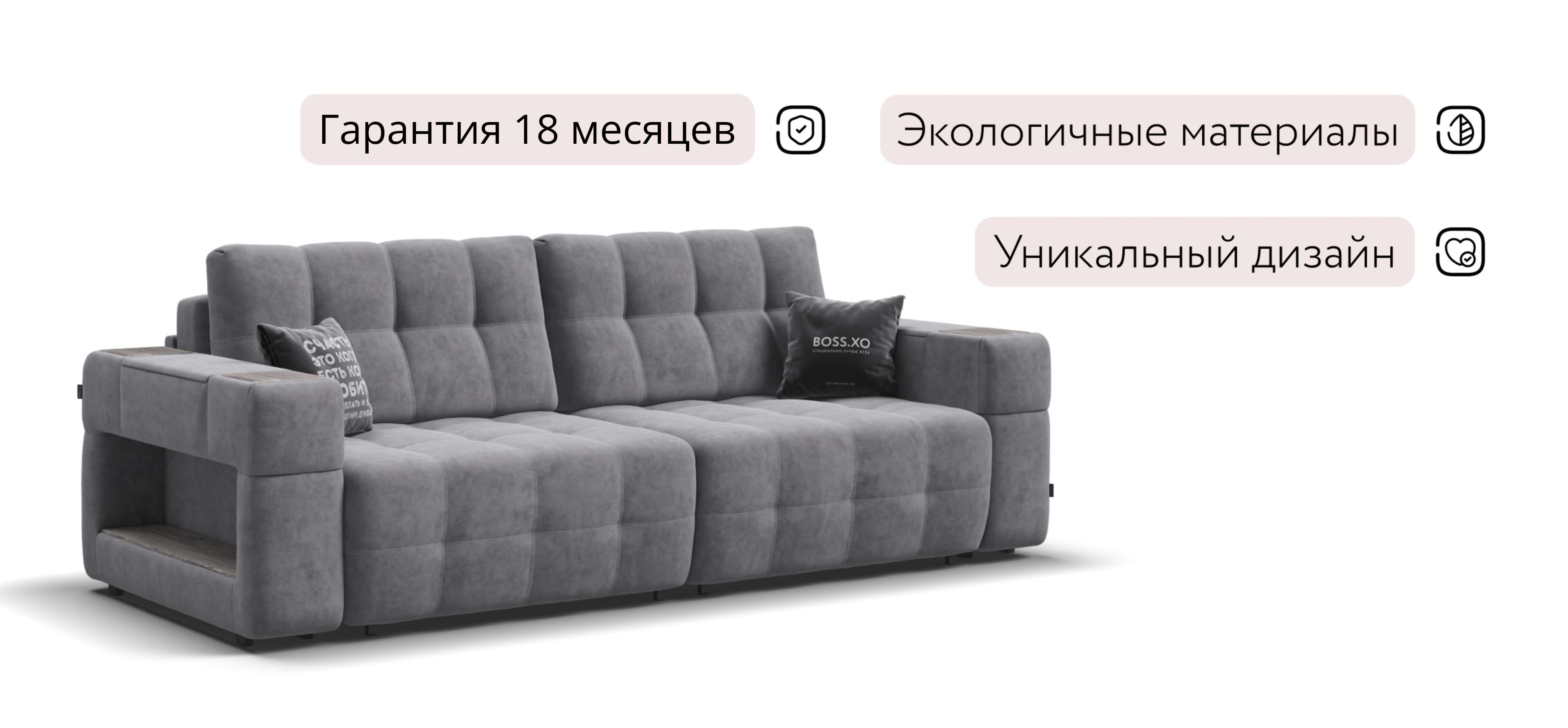 Покупая диван BOSS.XO вы становитесь обладателем уникальных подарков: быстрая зарядка для смартфона, 2 стильных кружки, 2 удобных столика для ноутбука, 2 подушки, комплект запасных накладок на подлокотники B-HAPPY®️, экоручки и средство для чистки BOSS Clean.Характеристики