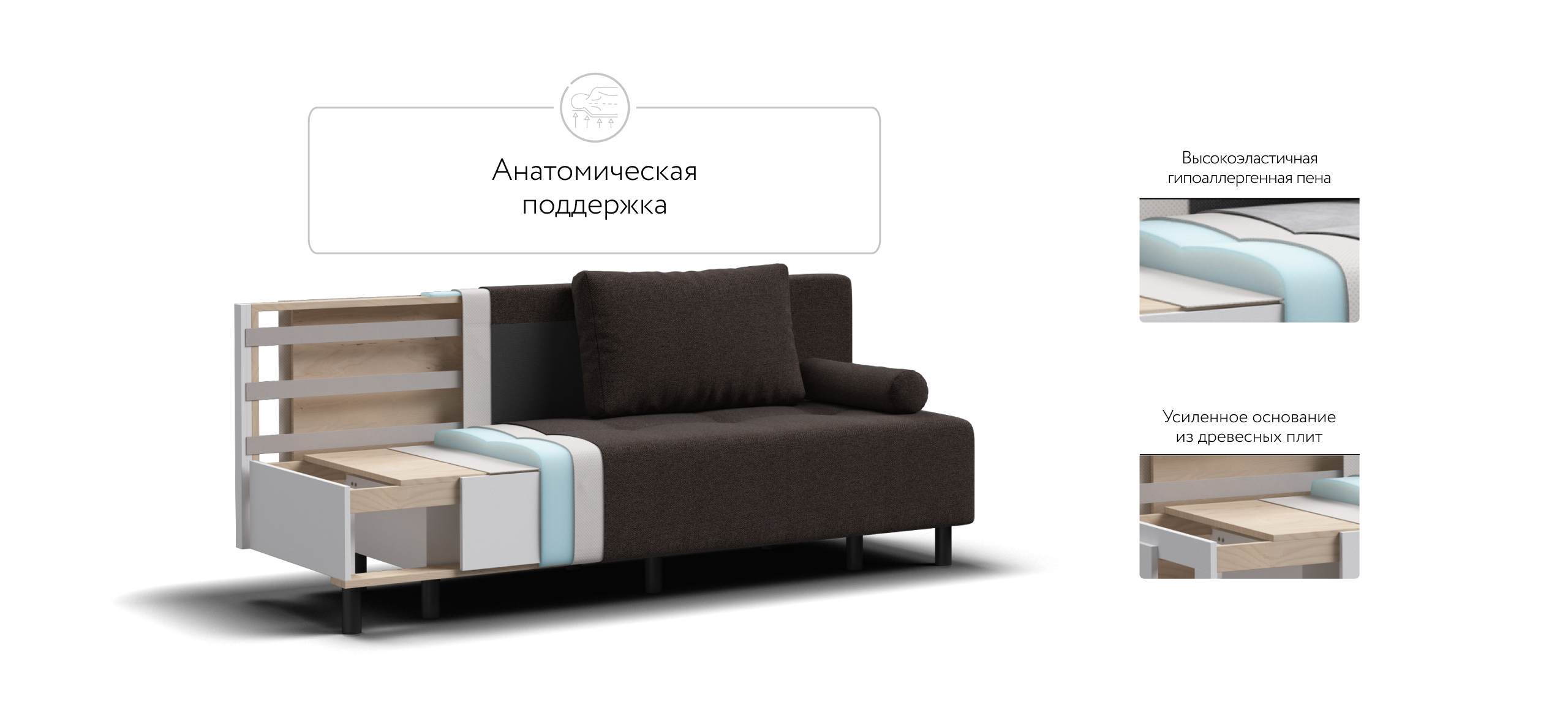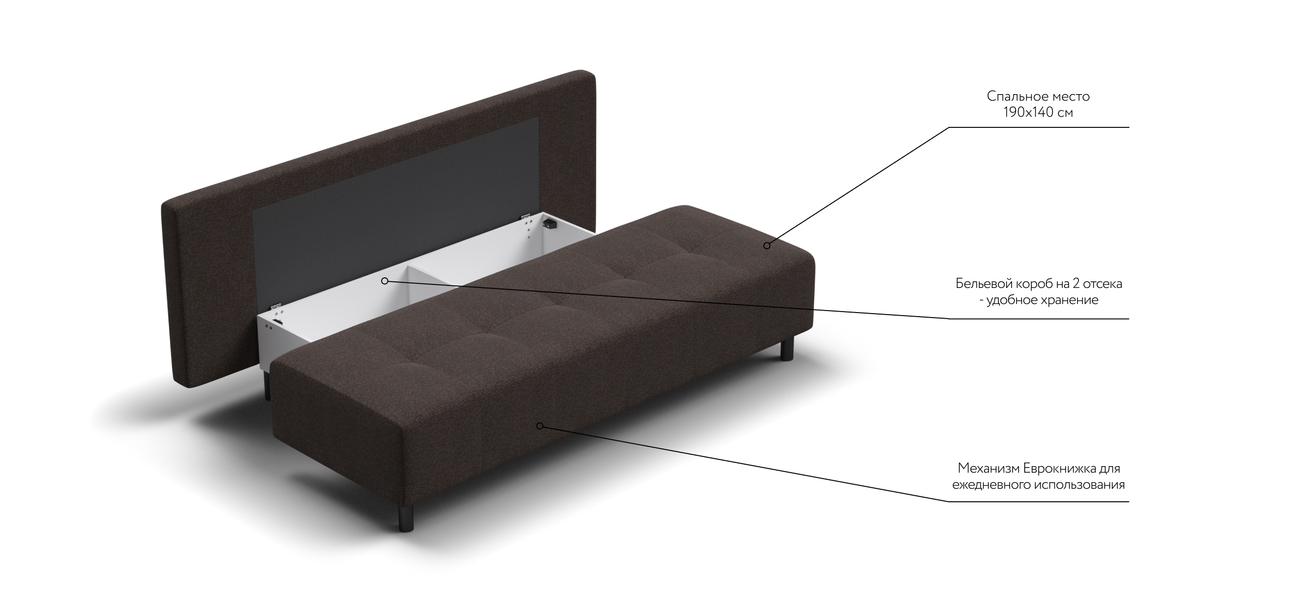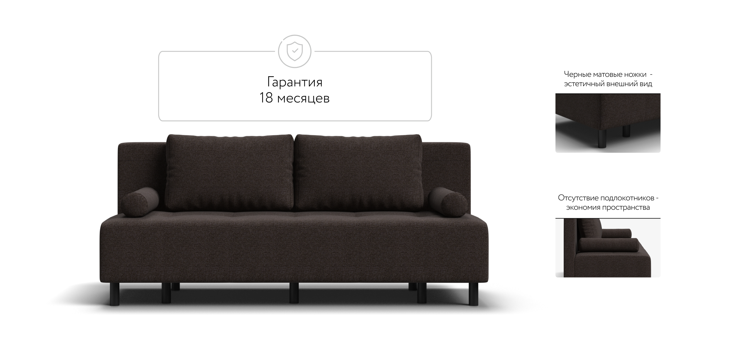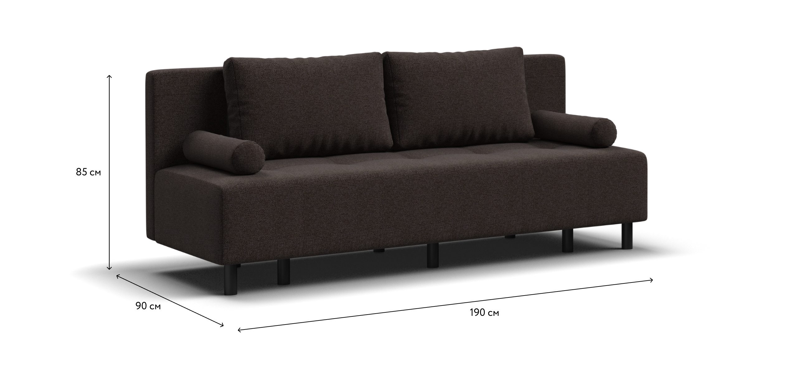 Модель оснащена надёжным механизмом трансформации еврокнижка, который за пару движений превращает диван в полноценное спальное место. Дополнительные декоративные подушки в комплекте добавляют мягкости и завершают образ.