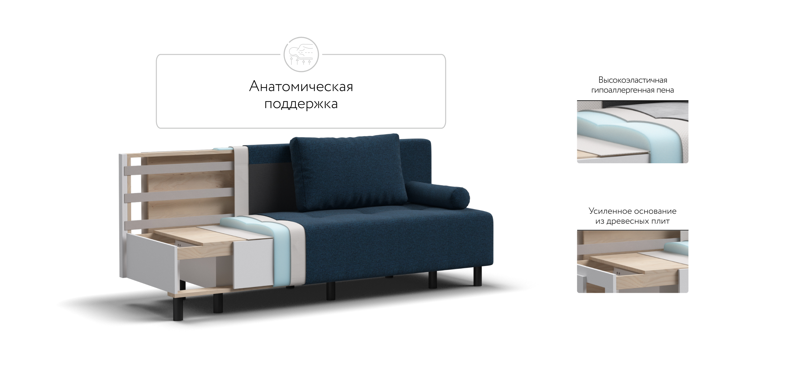 Наполнитель дивана – высокоэластичная гипоаллергенная пена на ДСП основании идеально подойдет для тех, кто любит более жесткие матрасы
