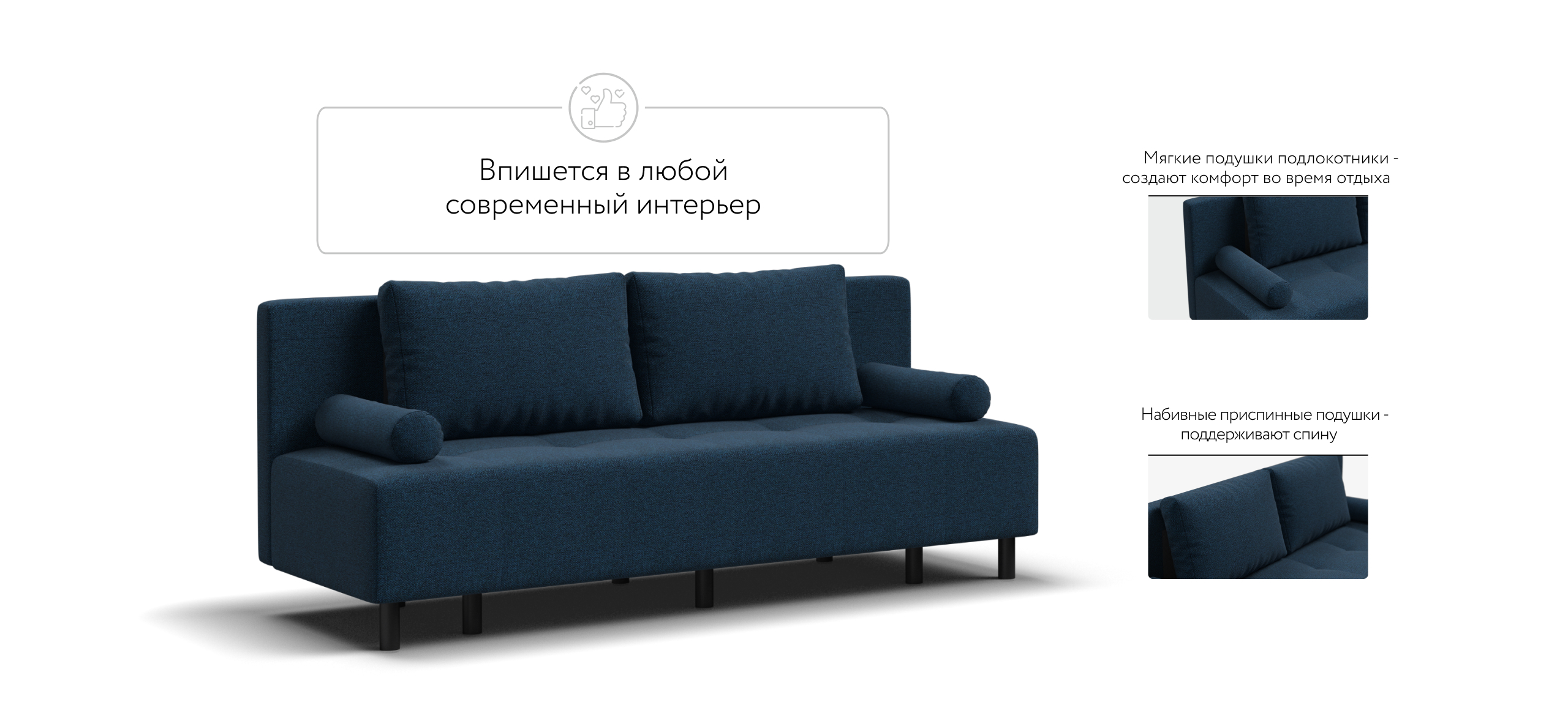 Модель оснащена надёжным механизмом трансформации еврокнижка, который за пару движений превращает диван в полноценное спальное место. Дополнительные декоративные подушки в комплекте добавляют мягкости и завершают образ.
