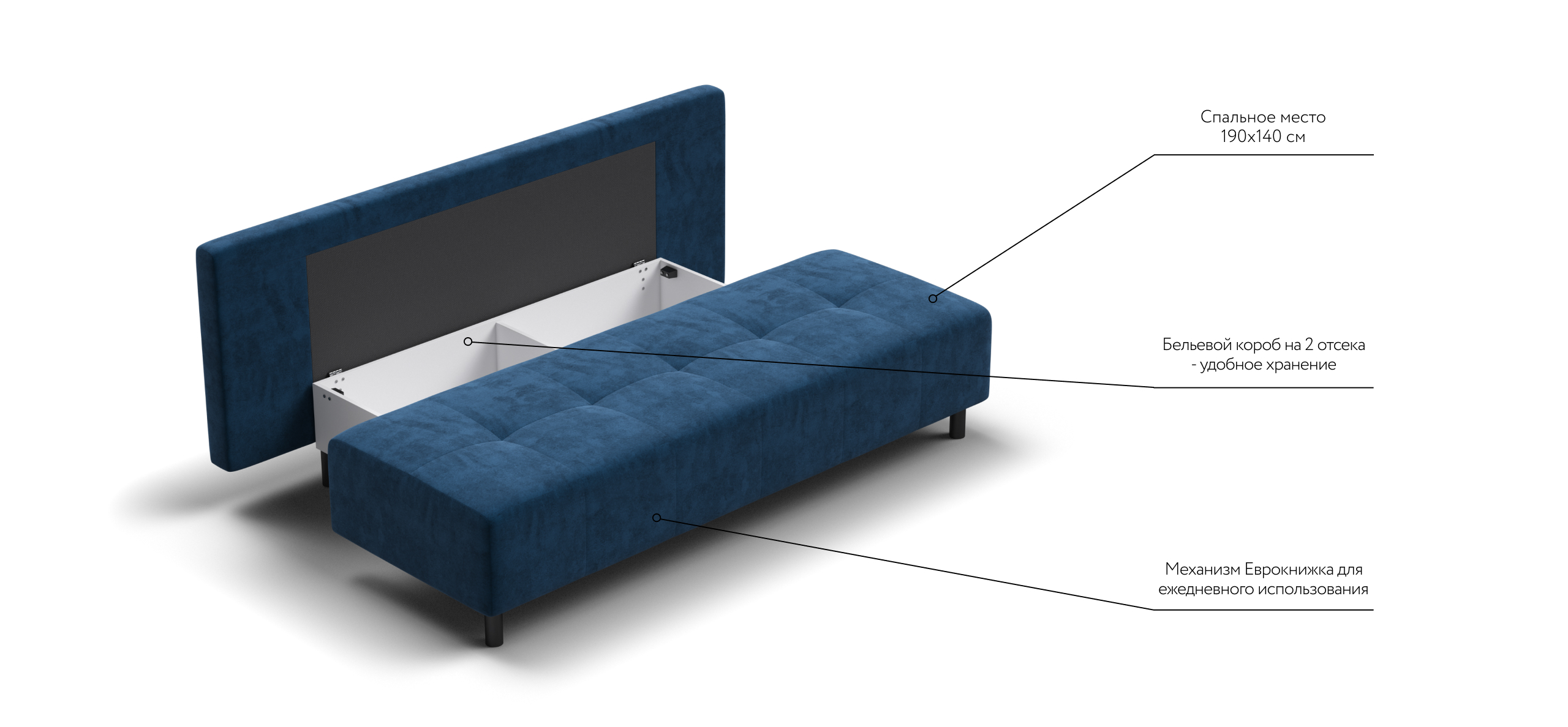 Бельевой короб под посадочной частью разделен на два отсека для удобства хранения постельного белья