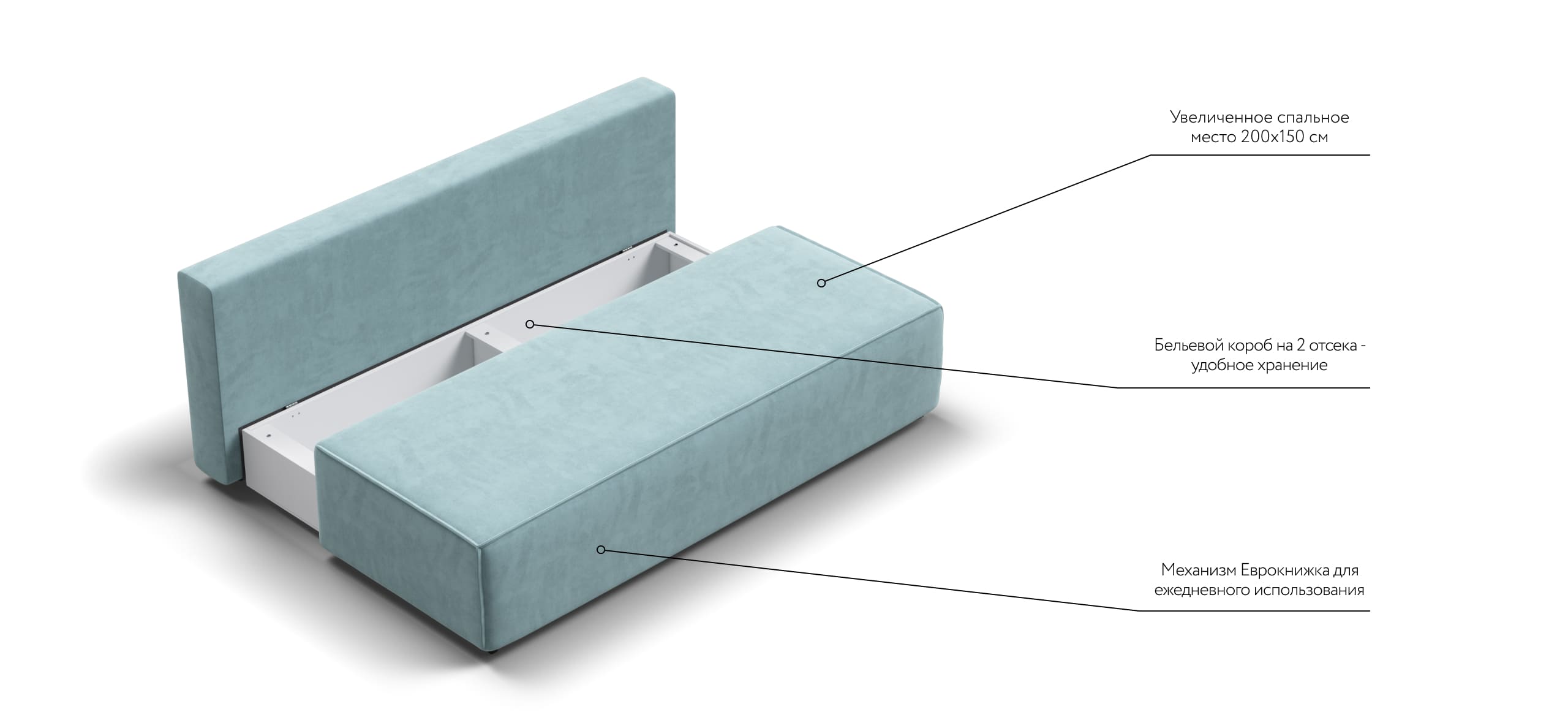 Днем вы с комфортом сможете провести время за просмотром любимого фильма, а ночью трансформировать диван в идеально ровное спальное место без стыков, благодаря анатомическому матрасу и надежному механизму еврокнижка.