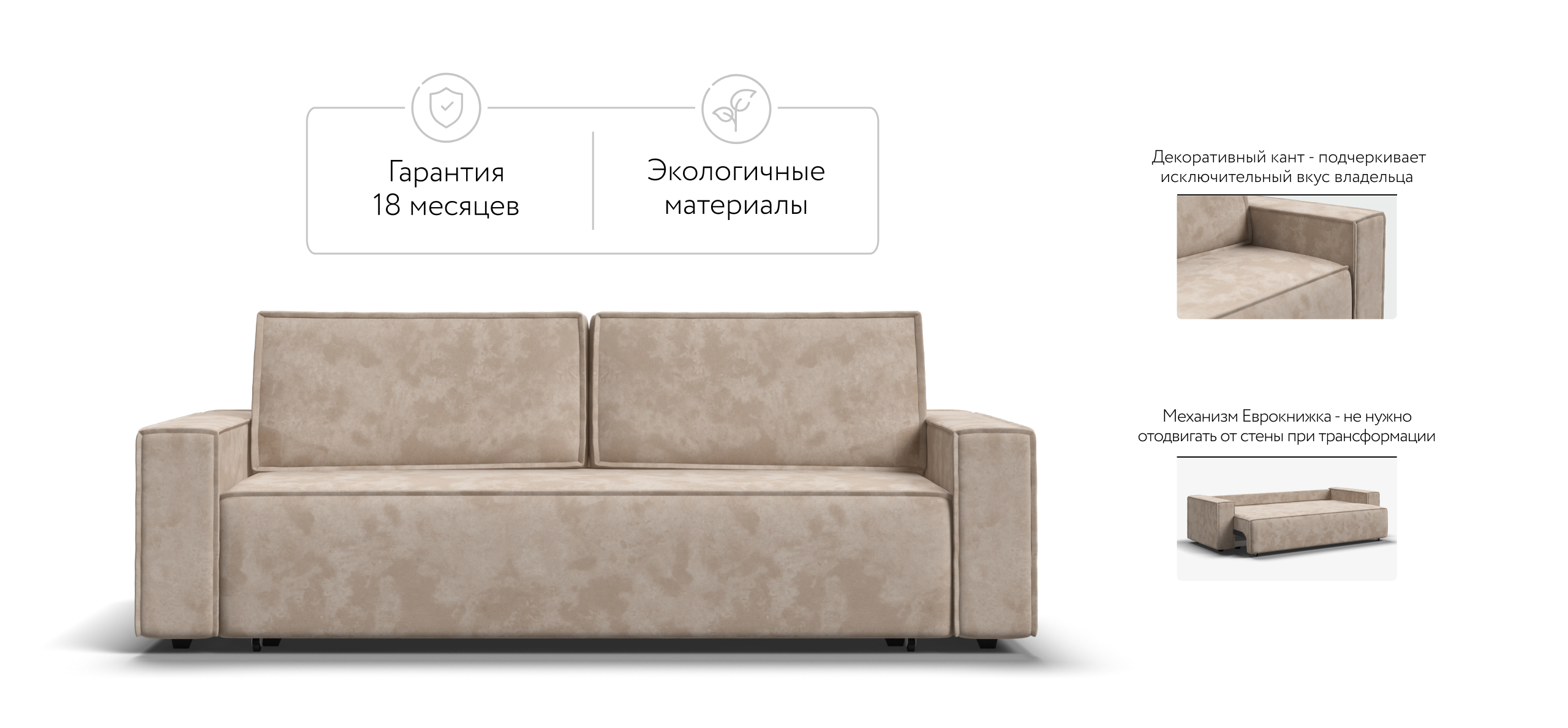 Днем вы с комфортом сможете провести время за просмотром любимого фильма, а ночью трансформировать диван в идеально ровное спальное место без стыков, благодаря анатомическому матрасу и надежному механизму еврокнижка.
