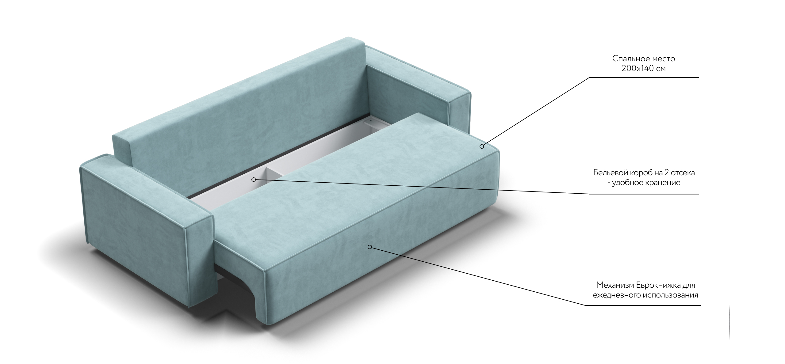 Днем вы с комфортом сможете провести время за просмотром любимого фильма, а ночью трансформировать диван в идеально ровное спальное место без стыков, благодаря анатомическому матрасу и надежному механизму еврокнижка.
