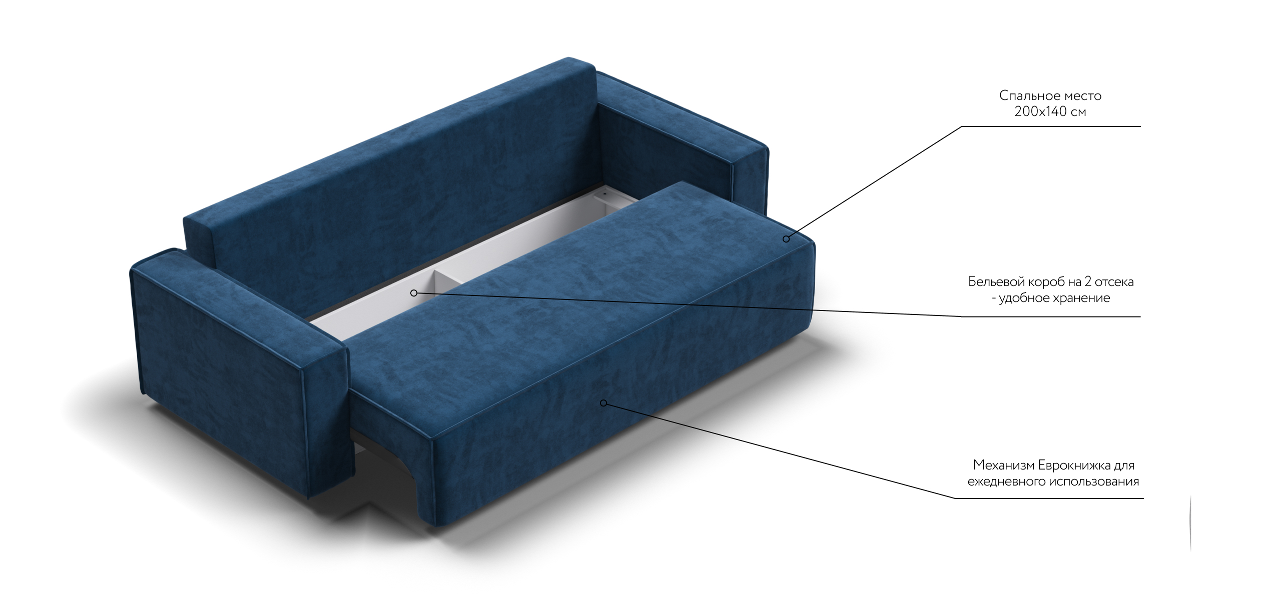 Днем вы с комфортом сможете провести время за просмотром любимого фильма, а ночью трансформировать диван в идеально ровное спальное место без стыков, благодаря анатомическому матрасу и надежному механизму еврокнижка.
