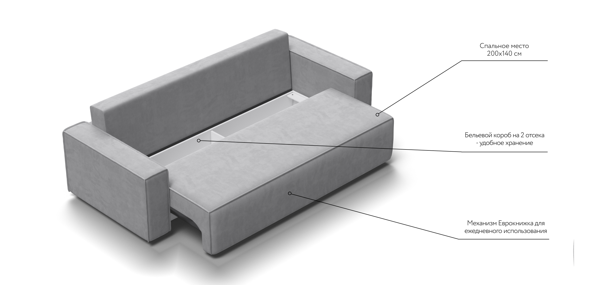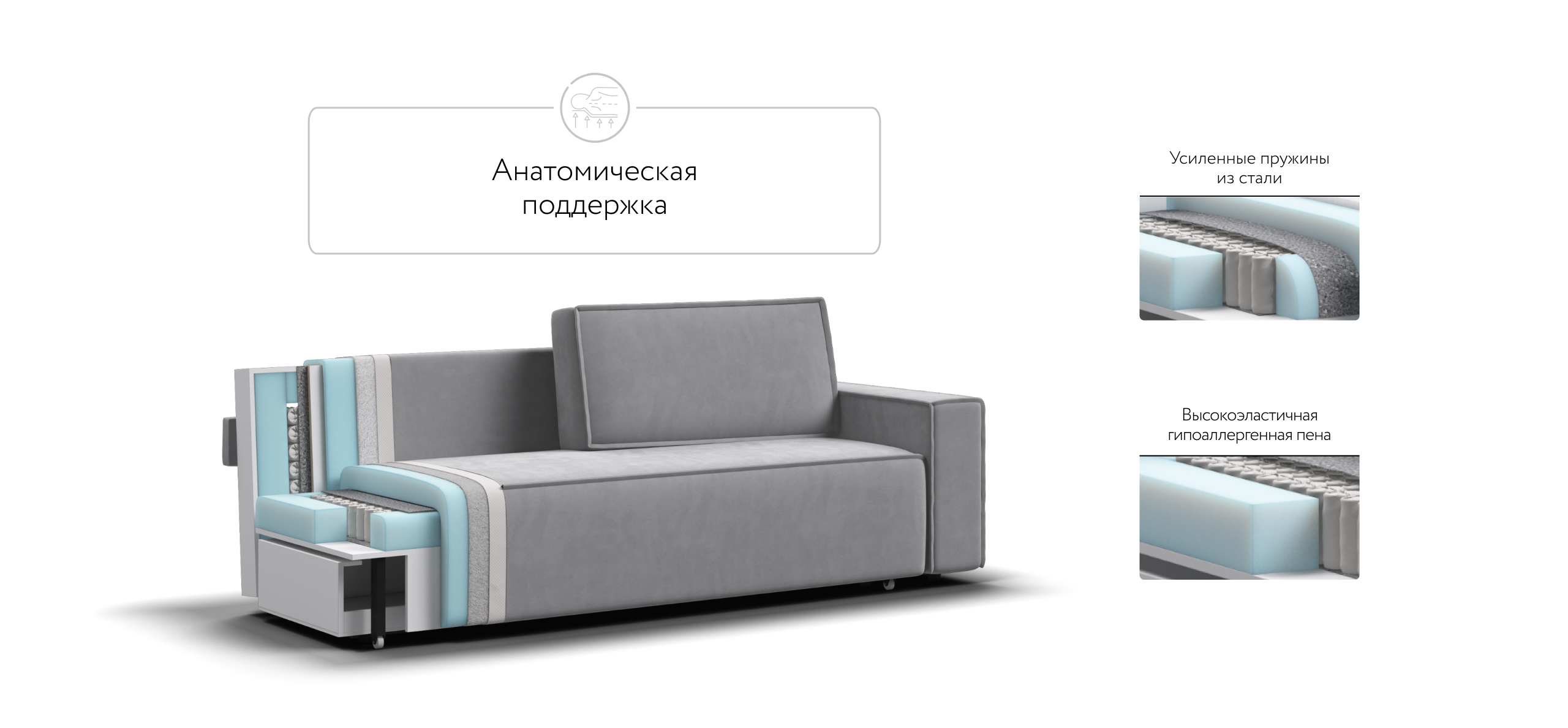 Днем вы с комфортом сможете провести время за просмотром любимого фильма, а ночью трансформировать диван в идеально ровное спальное место без стыков, благодаря анатомическому матрасу и надежному механизму еврокнижка.