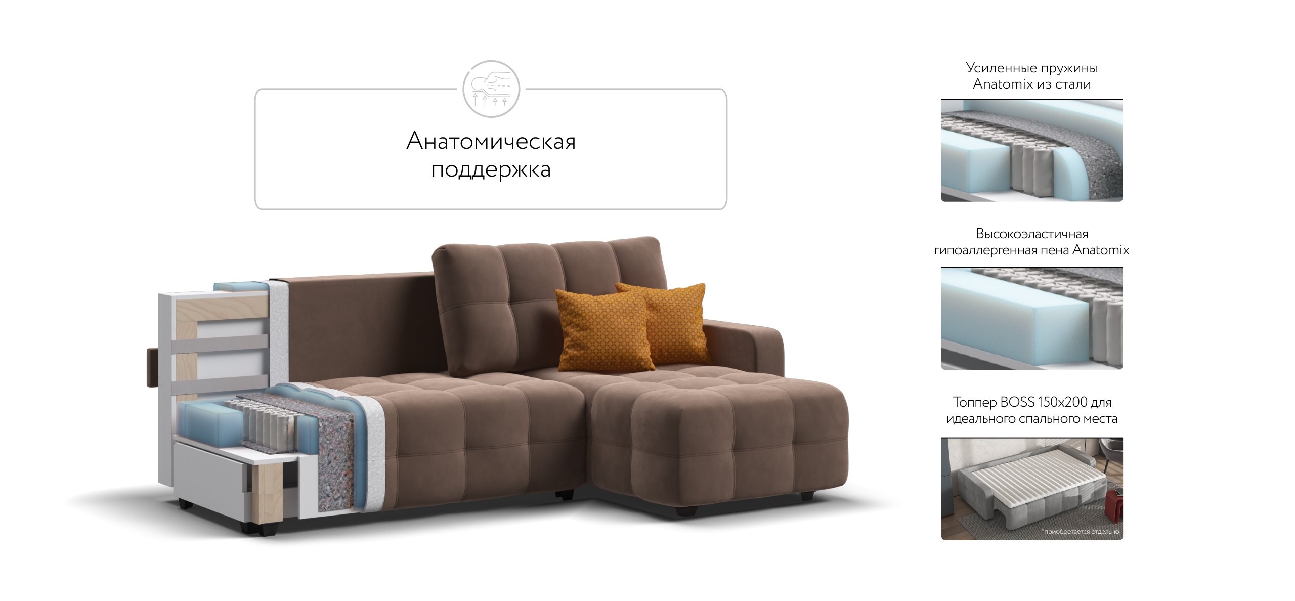 Простой и надежный механизм трансформации еврокнижка позволяет с легкостью раскладывать диван в удобную, полноценную, двуспальную кровать.