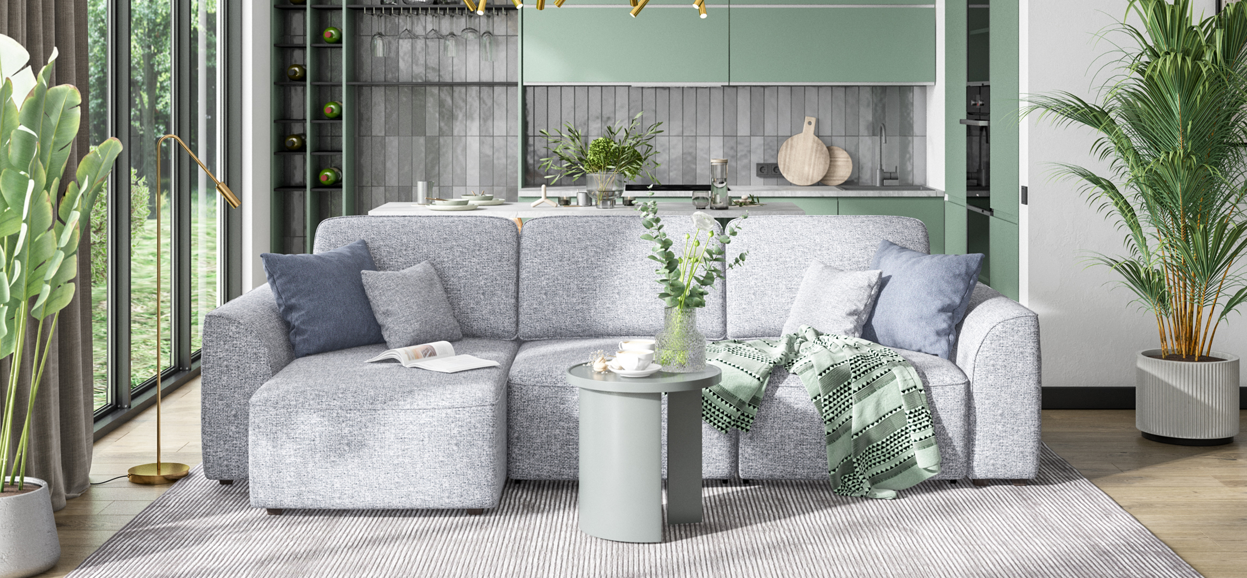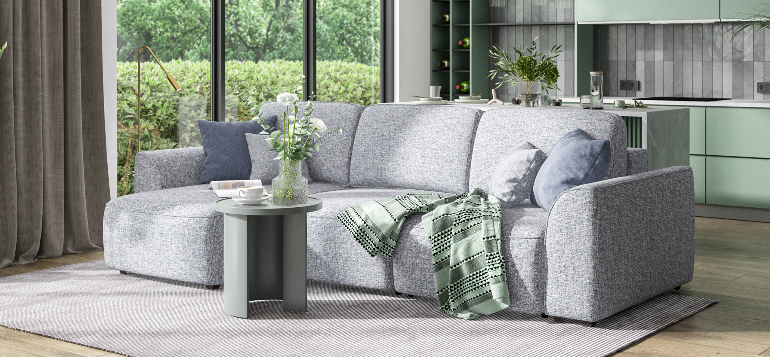 Комфортная посадка, скругленные линии, объемные подушки - диван, который наполнит ваш дом уютом и комфортом. Универсальный угол позволит Вам самостоятельно выбрать его положение при сборке, а каждое посадочное место можно выдвинуть вперед и получить П-образную форму дивана, на котором с комфортом разместится большая компания. А в разложенном виде диван превращается в комфортное спальное место.