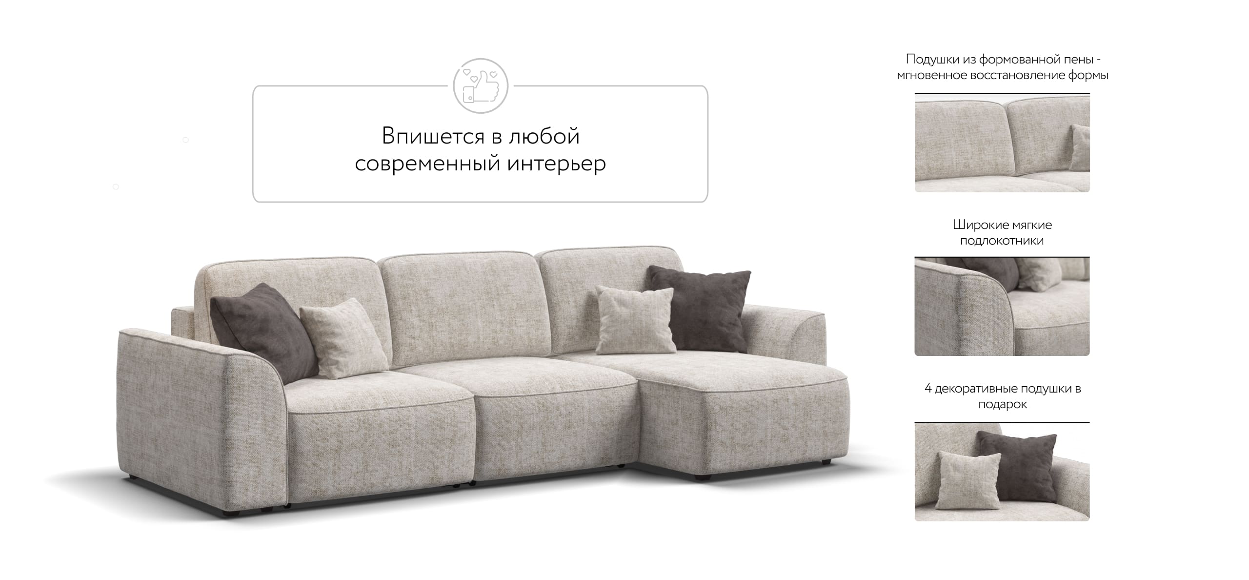 Комфортная посадка, скругленные линии, объемные подушки - диван, который наполнит ваш дом уютом и комфортом. Универсальный угол позволит Вам самостоятельно выбрать его положение при сборке, а каждое посадочное место можно выдвинуть вперед и получить П-образную форму дивана, на котором с комфортом разместится большая компания. А в разложенном виде диван превращается в комфортное спальное место.