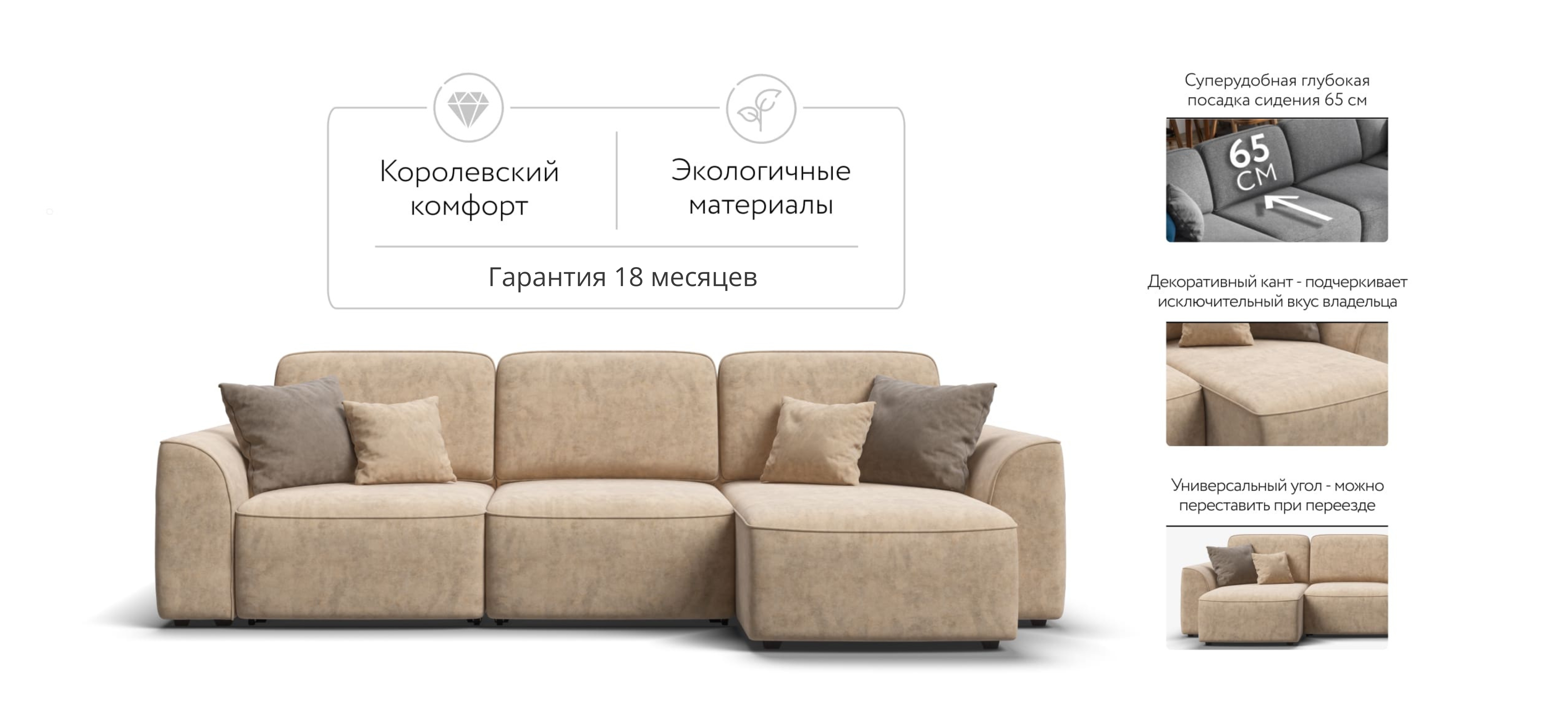 Комфортная посадка, скругленные линии, объемные подушки - диван, который наполнит ваш дом уютом и комфортом. Универсальный угол позволит Вам самостоятельно выбрать его положение при сборке, а каждое посадочное место можно выдвинуть вперед и получить П-образную форму дивана, на котором с комфортом разместится большая компания. А в разложенном виде диван превращается в комфортное спальное место.