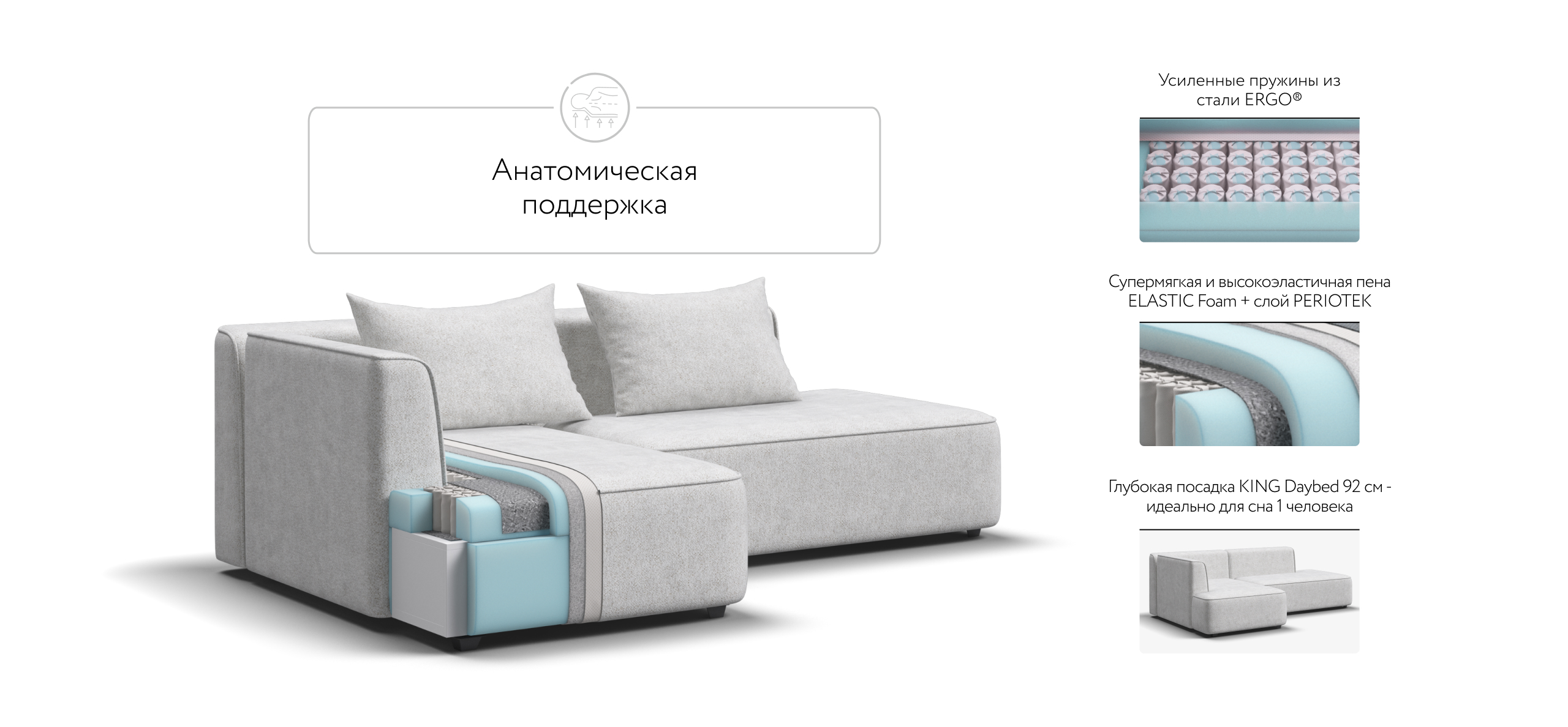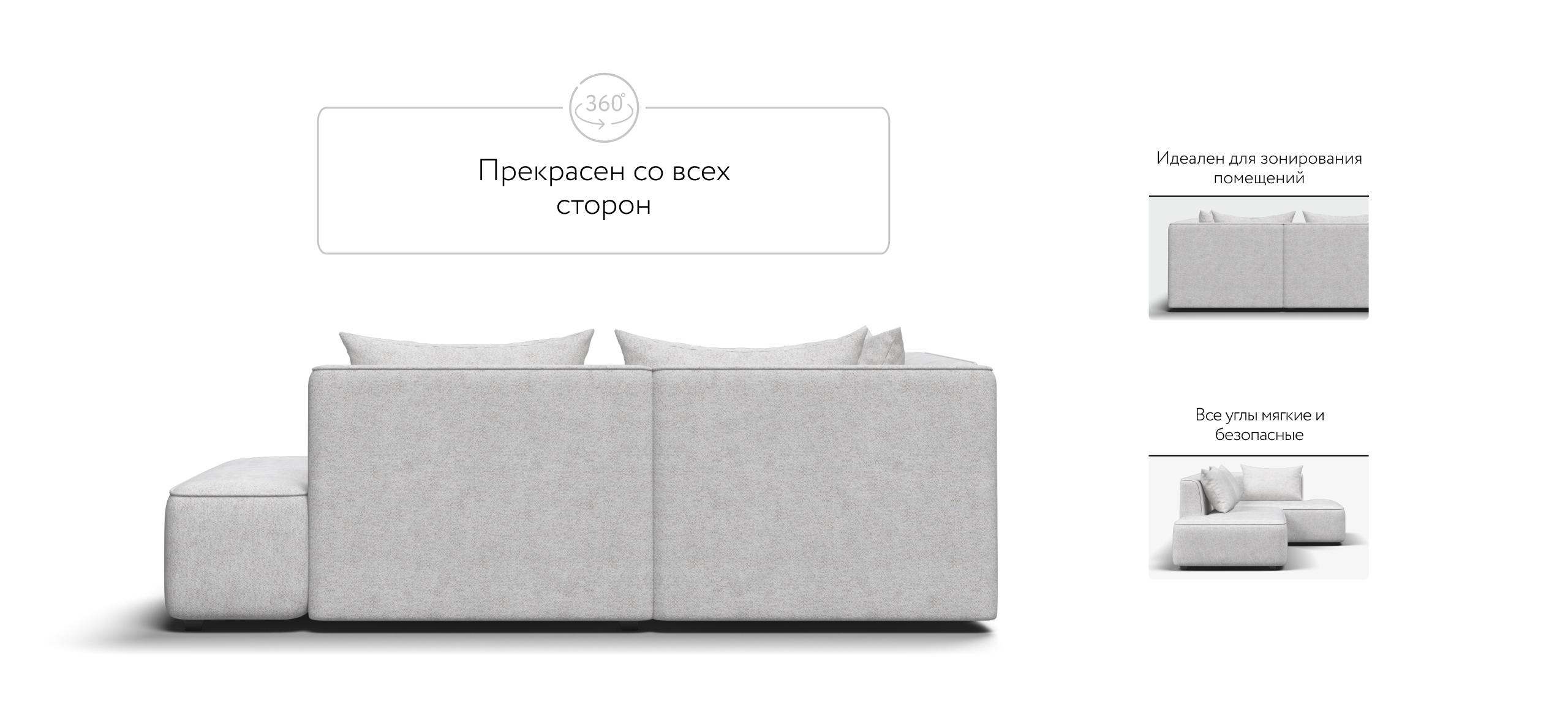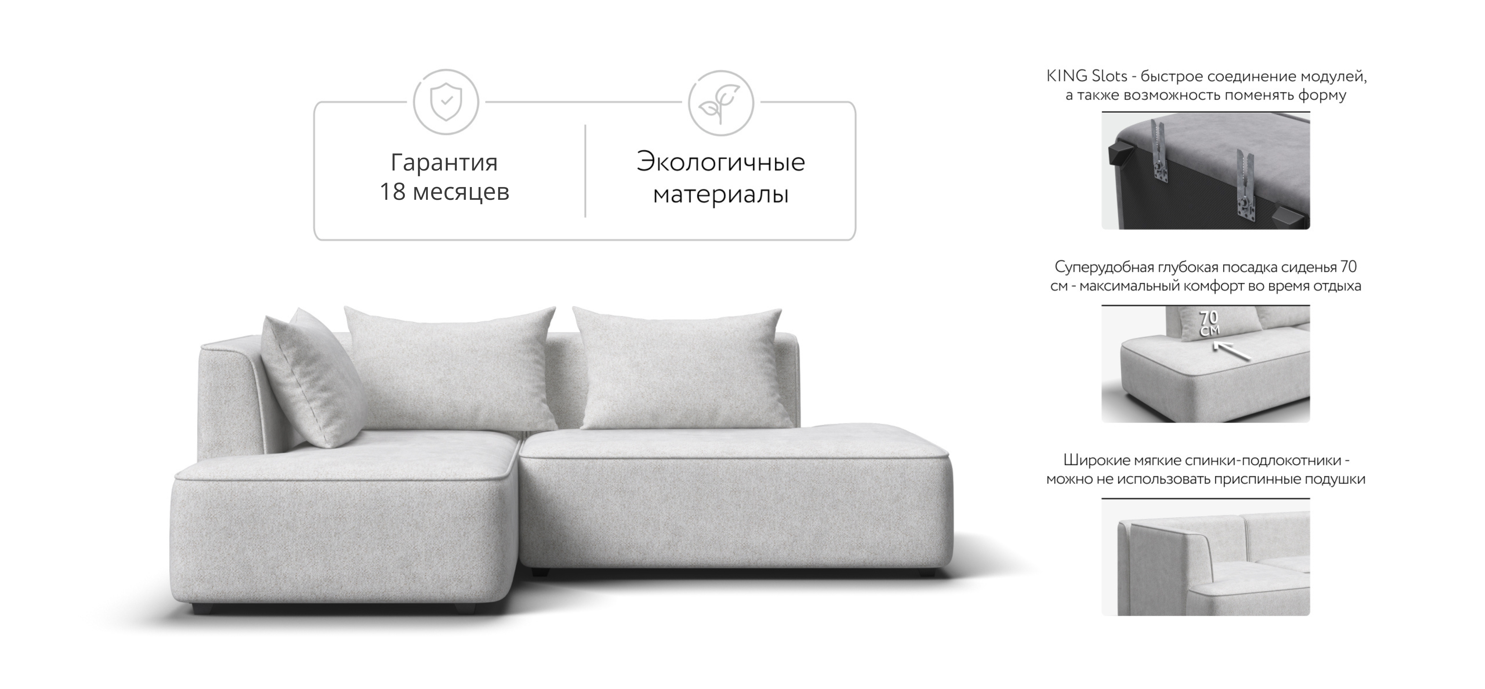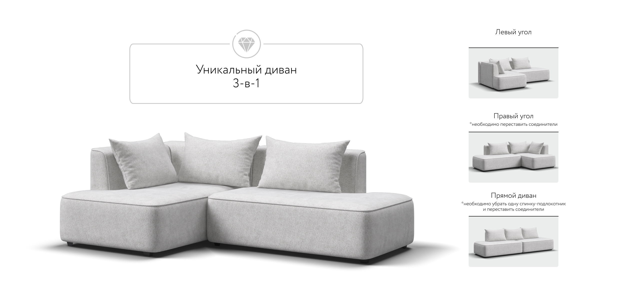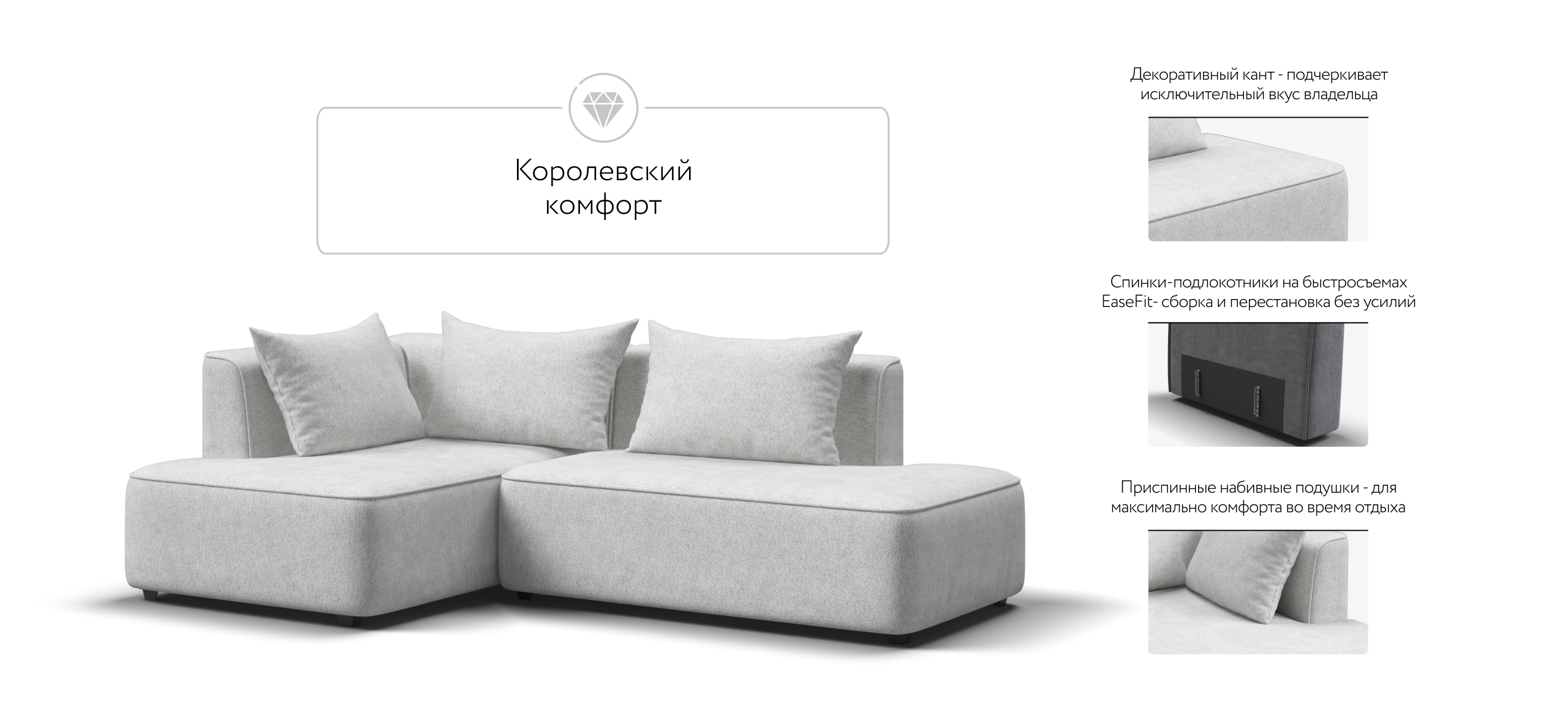 Благодаря инновационной системе креплений и быстросъёмным элементам Вы с лёгкостью можете поменять конфигурацию и адаптировать диван под новое пространство.