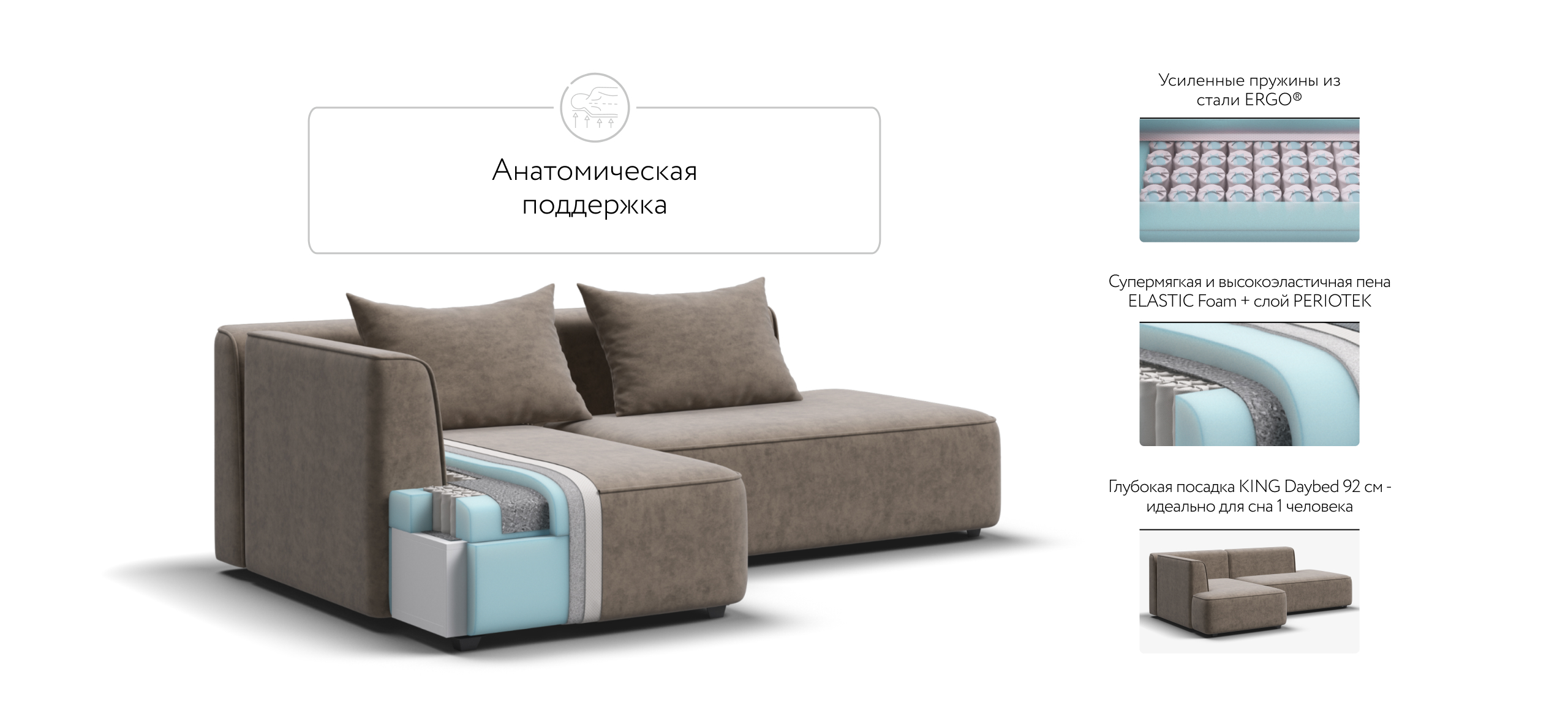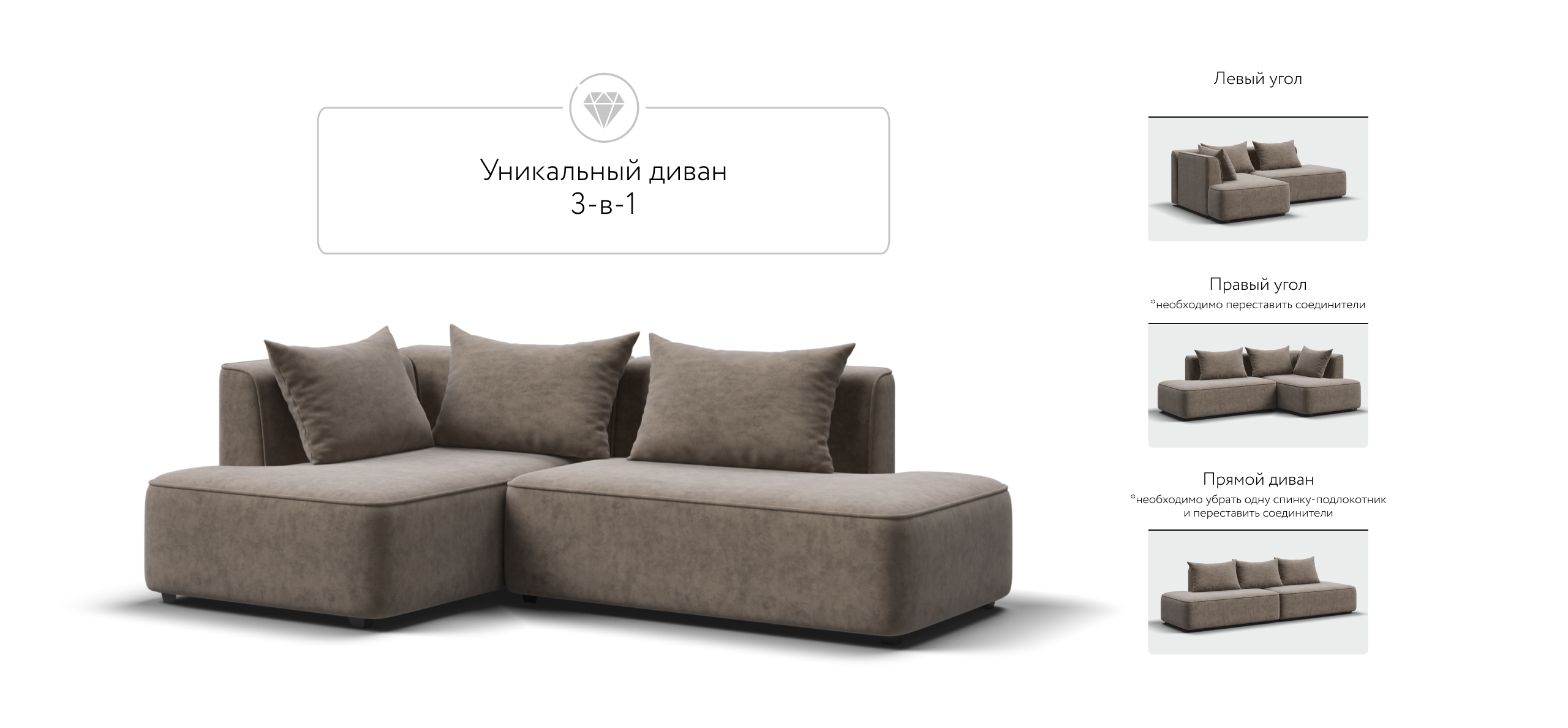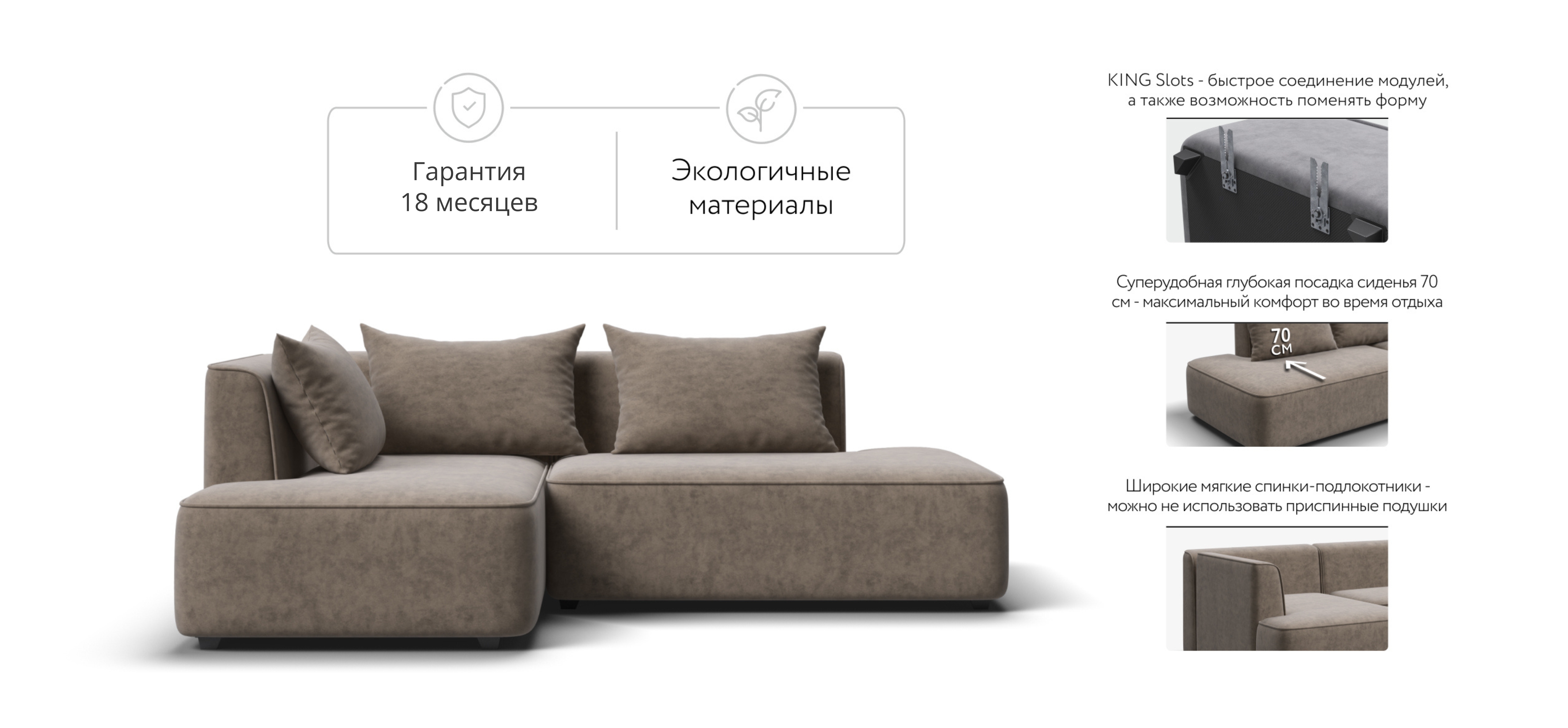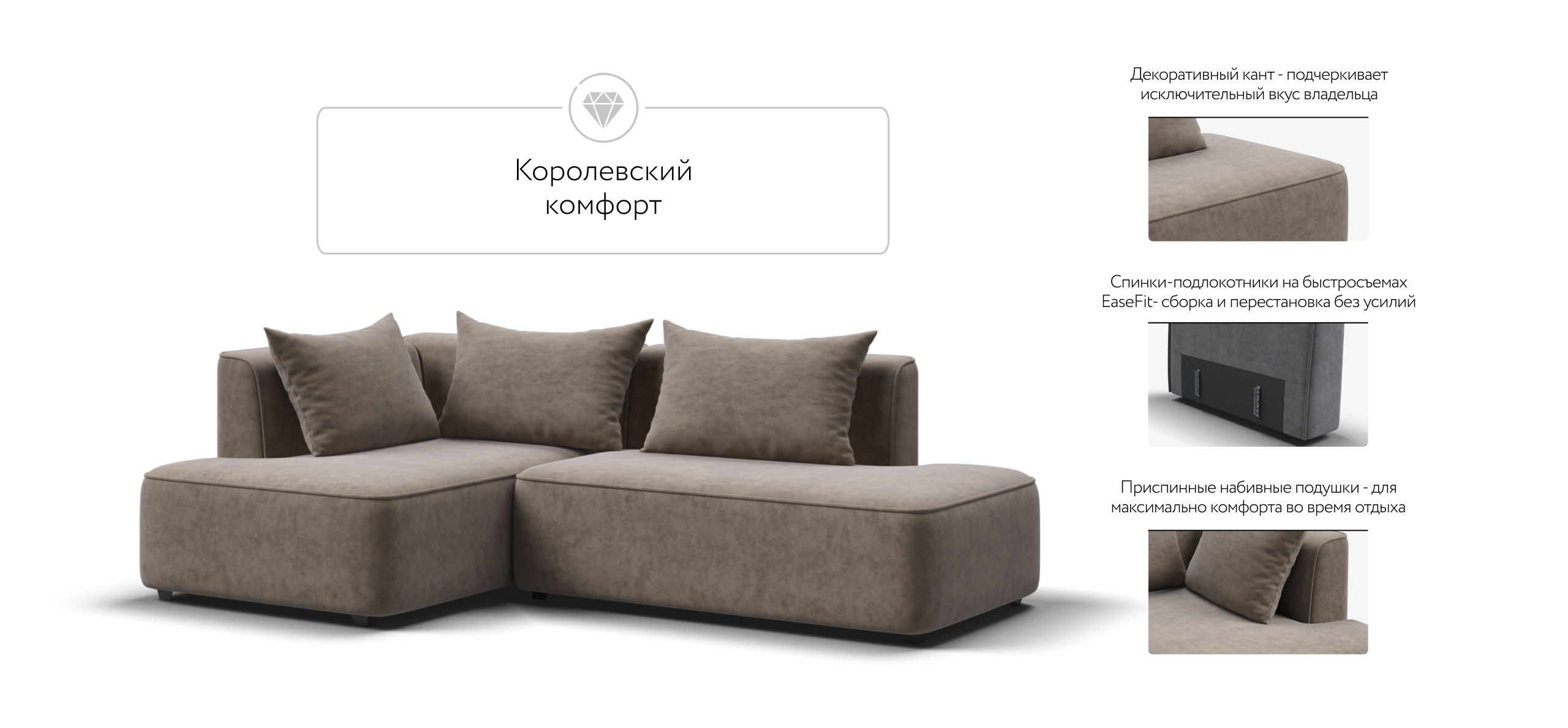 Благодаря инновационной системе креплений и быстросъёмным элементам Вы с лёгкостью можете поменять конфигурацию и адаптировать диван под новое пространство.