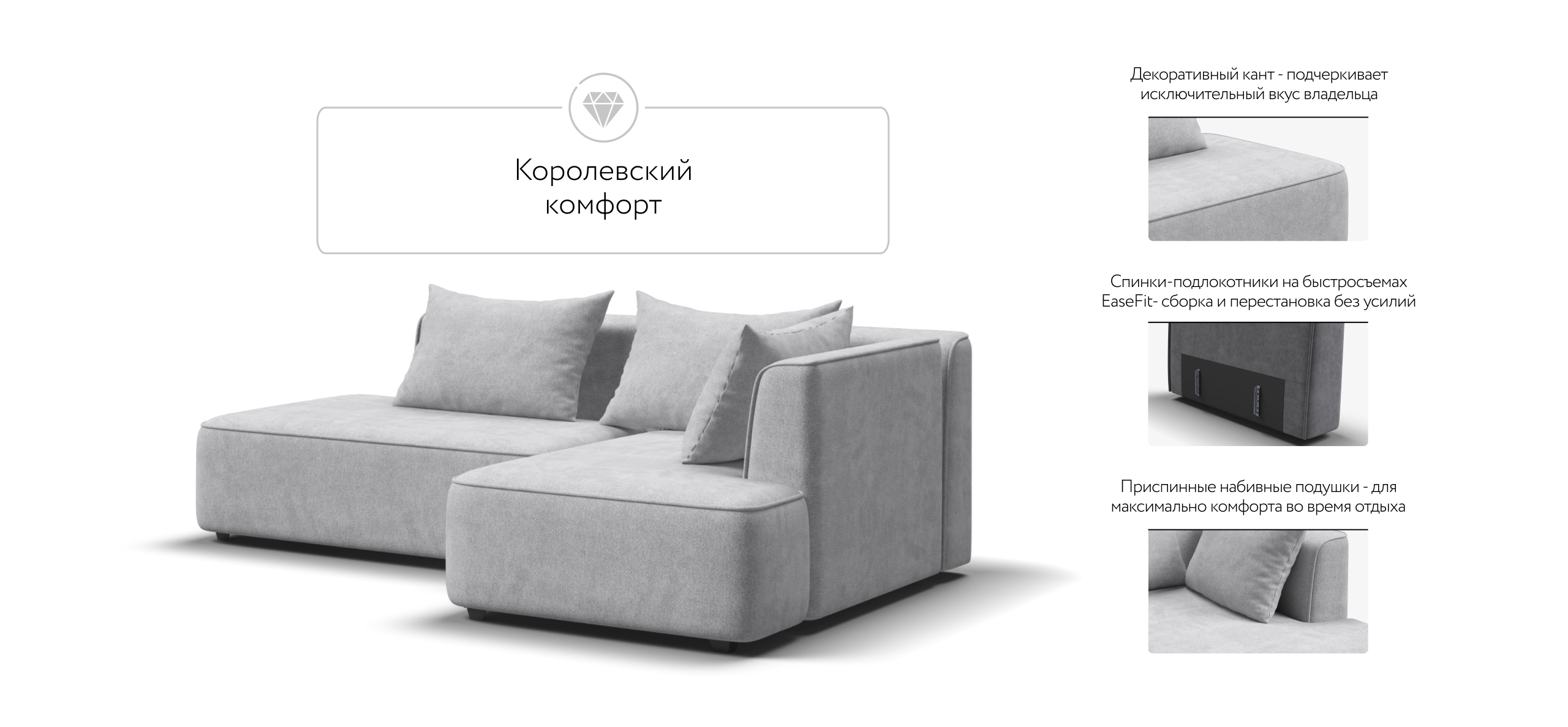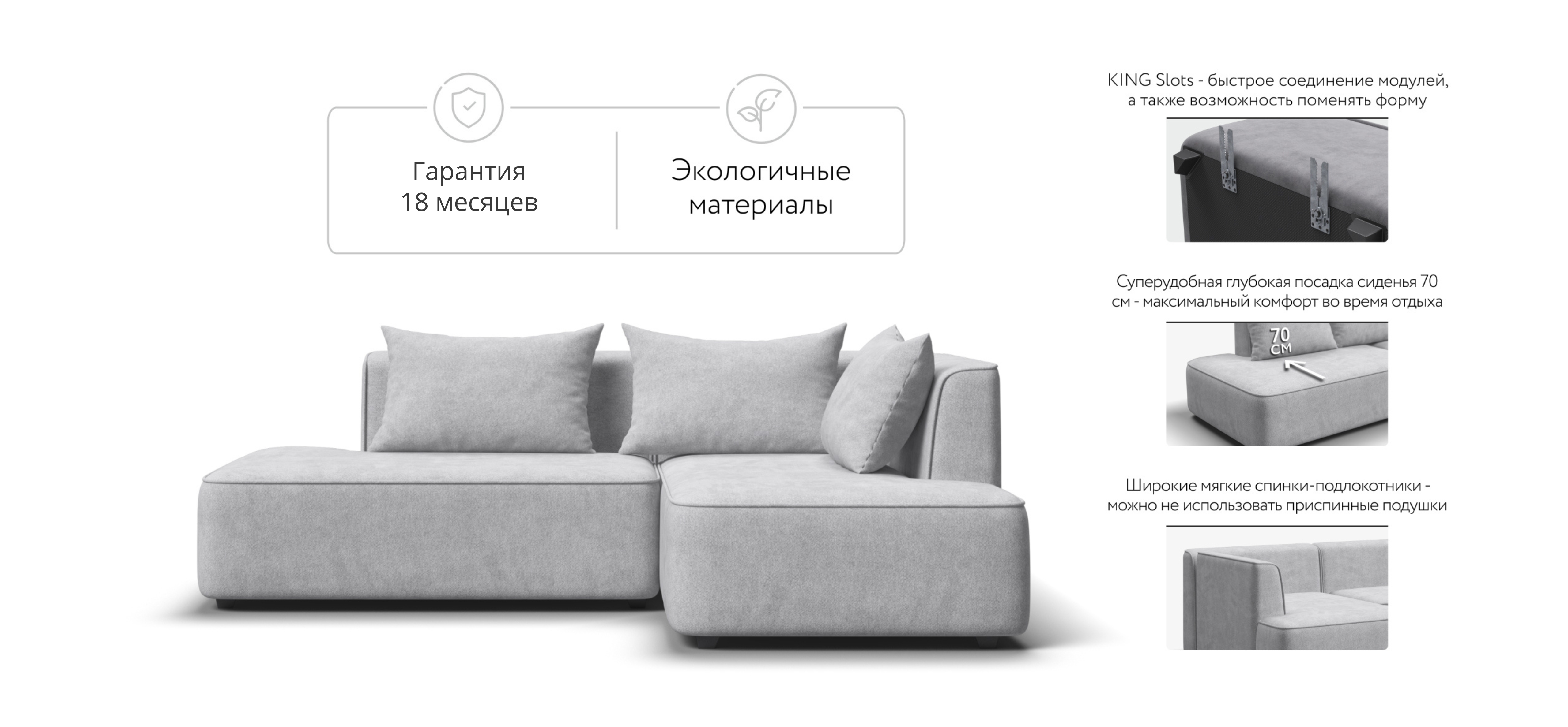 Благодаря инновационной системе креплений и быстросъёмным элементам Вы с лёгкостью можете поменять конфигурацию и адаптировать диван под новое пространство.