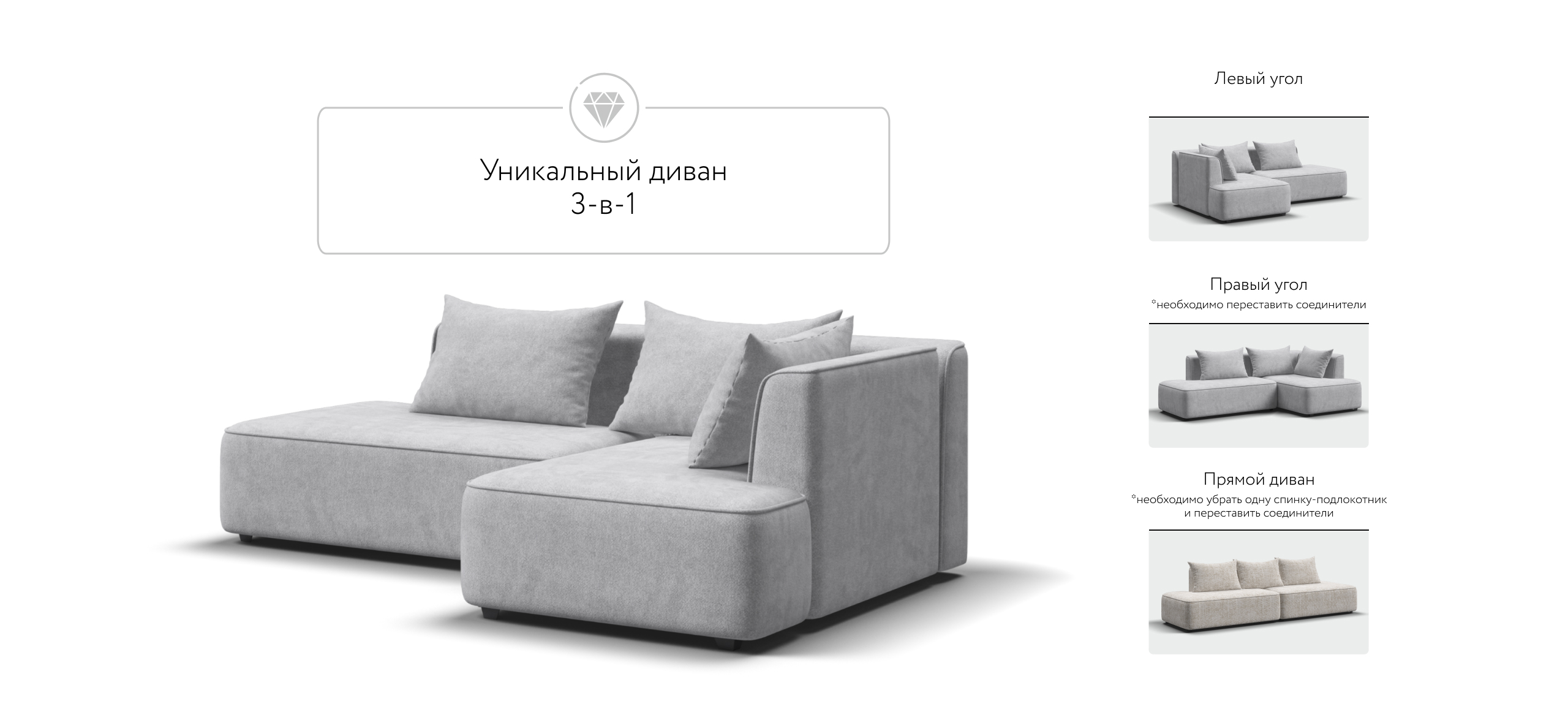 Уникальный диван 3-в-1: прямой, левый угол, правый угол
