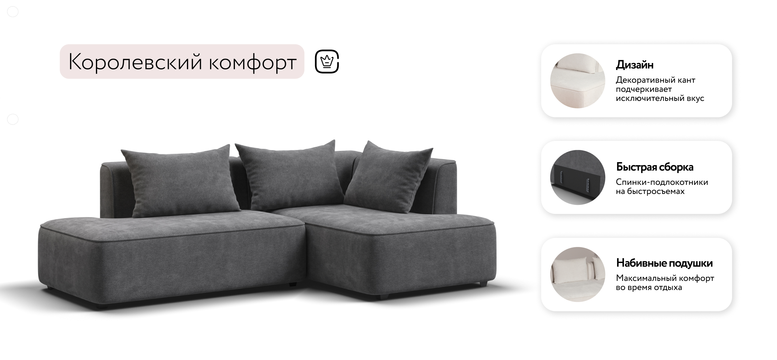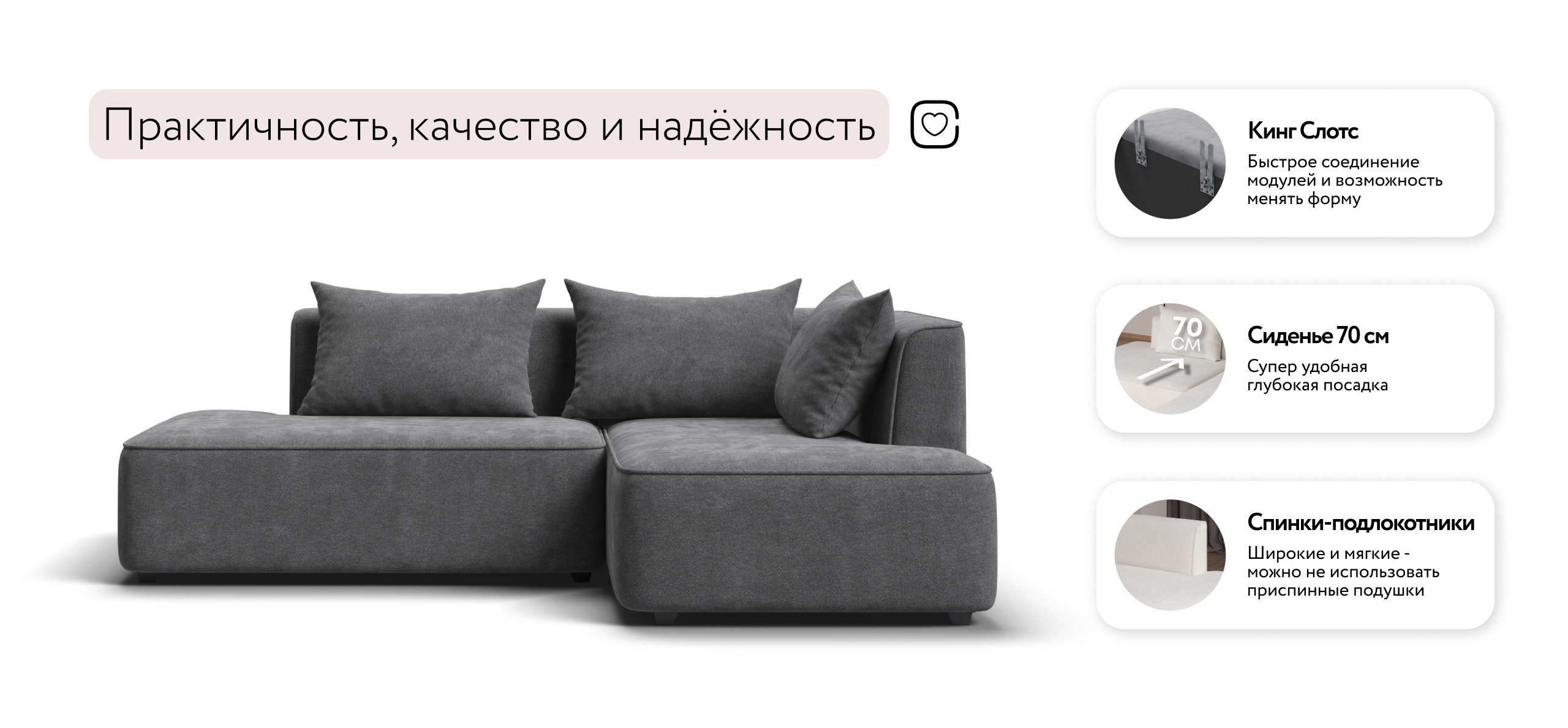 Благодаря инновационной системе креплений и быстросъёмным элементам Вы с лёгкостью можете поменять конфигурацию и адаптировать диван под новое пространство.