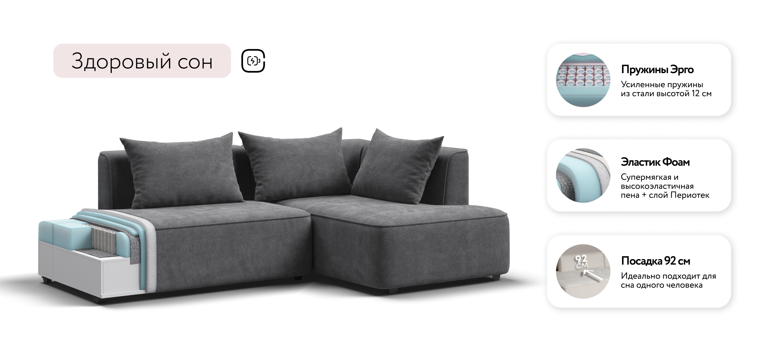 Глубокое сиденье и независимые пружины в основании словно созданы для полного расслабления, а мягкие спинки обеспечивают комфорт без лишних подушек.