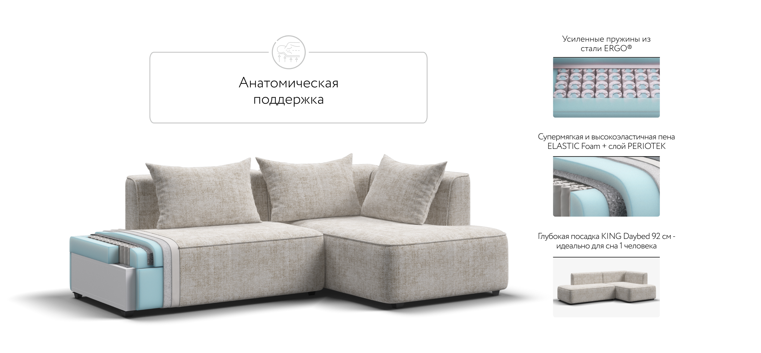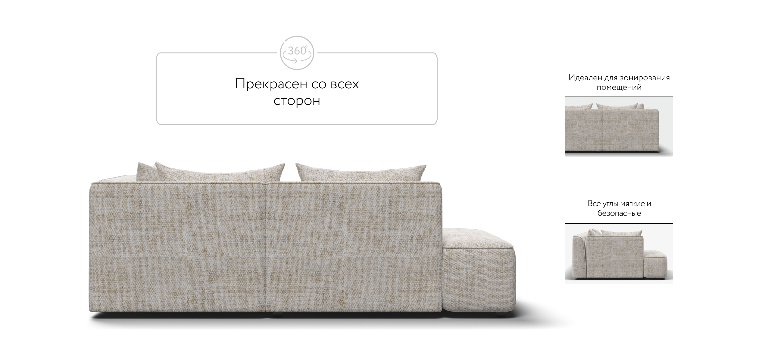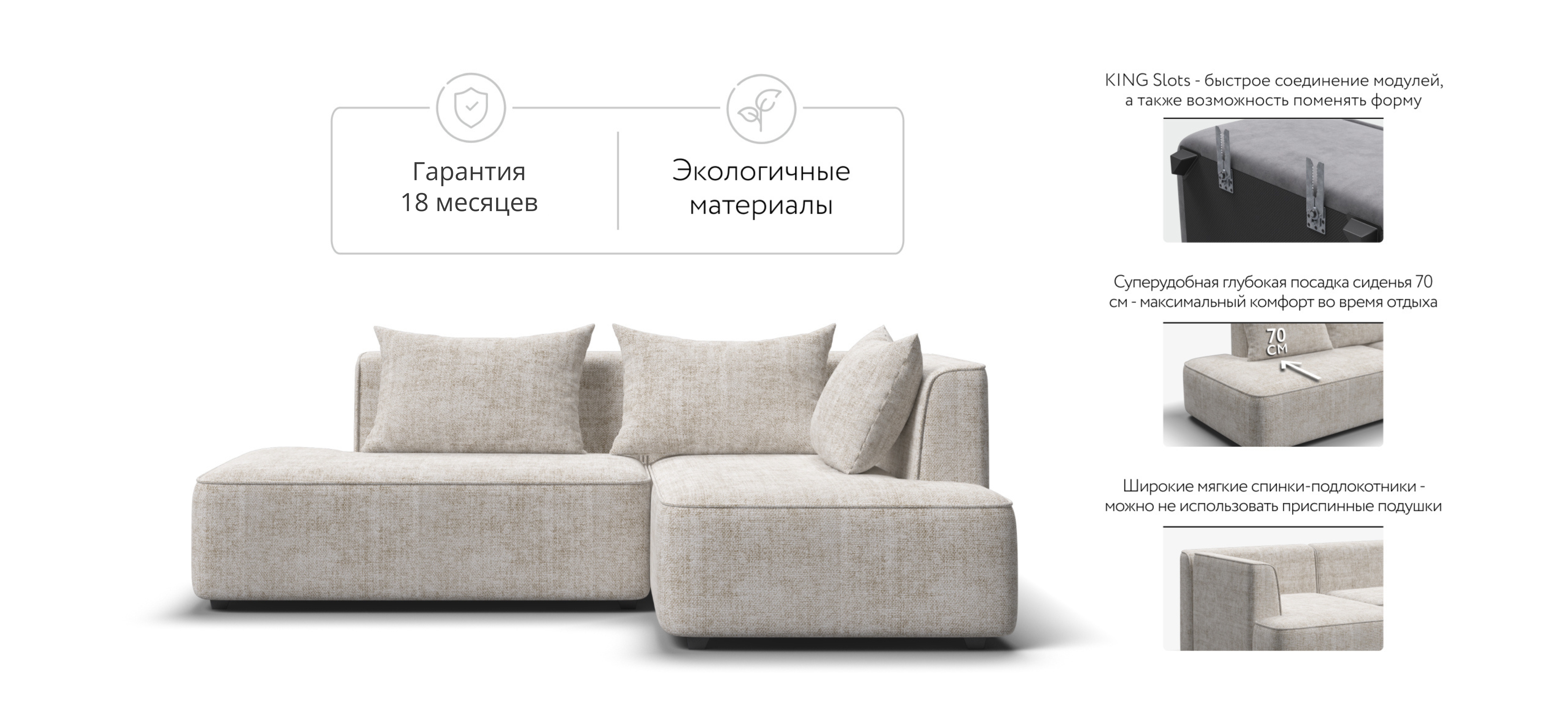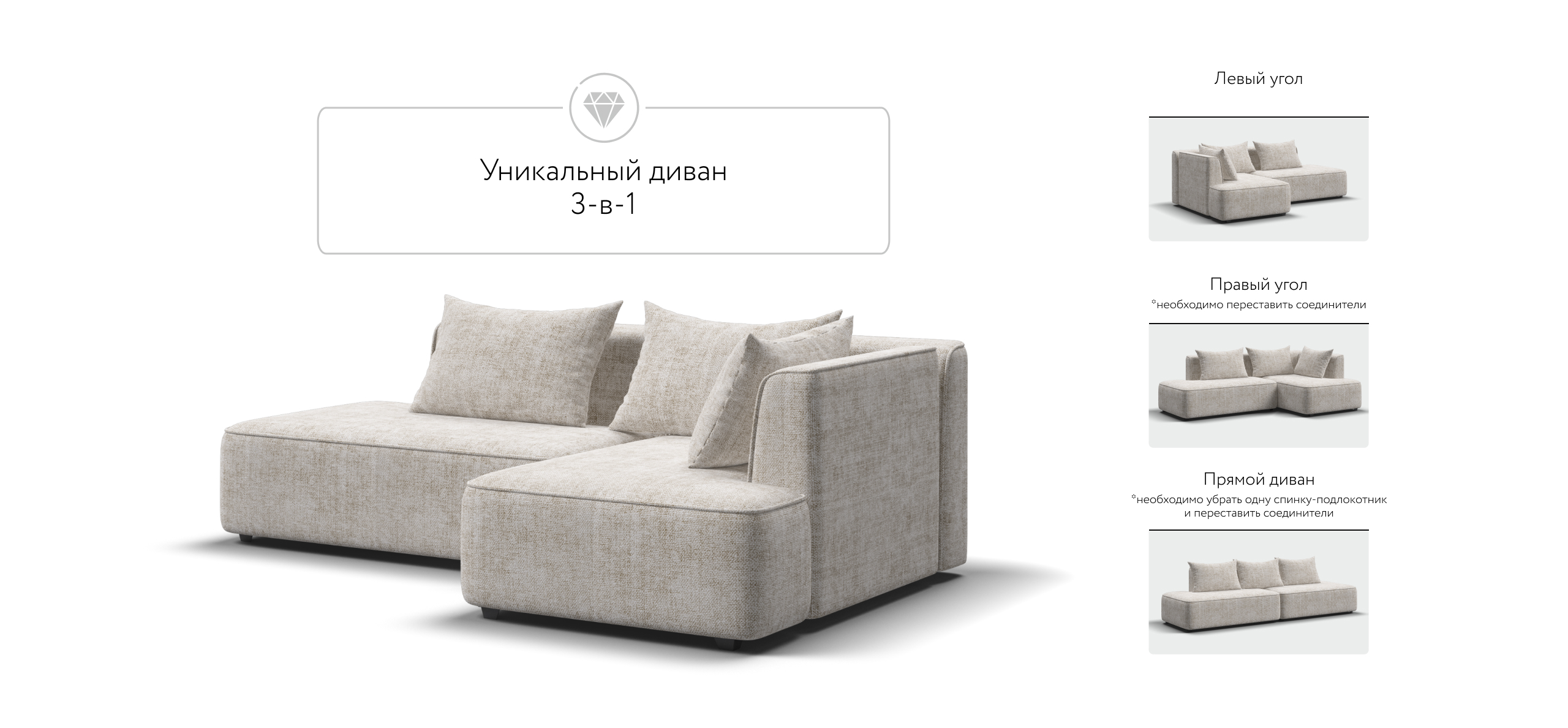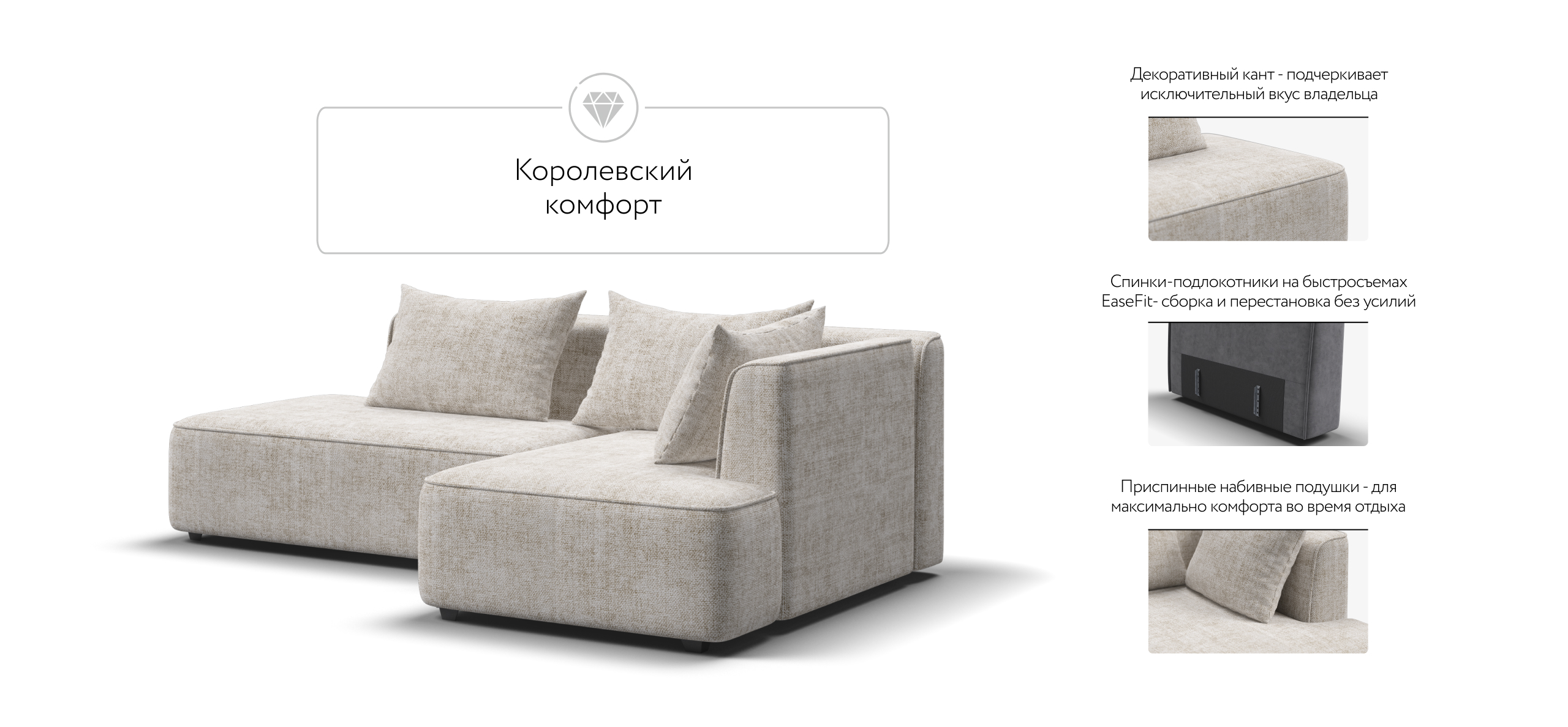 Благодаря инновационной системе креплений и быстросъёмным элементам Вы с лёгкостью можете поменять конфигурацию и адаптировать диван под новое пространство.