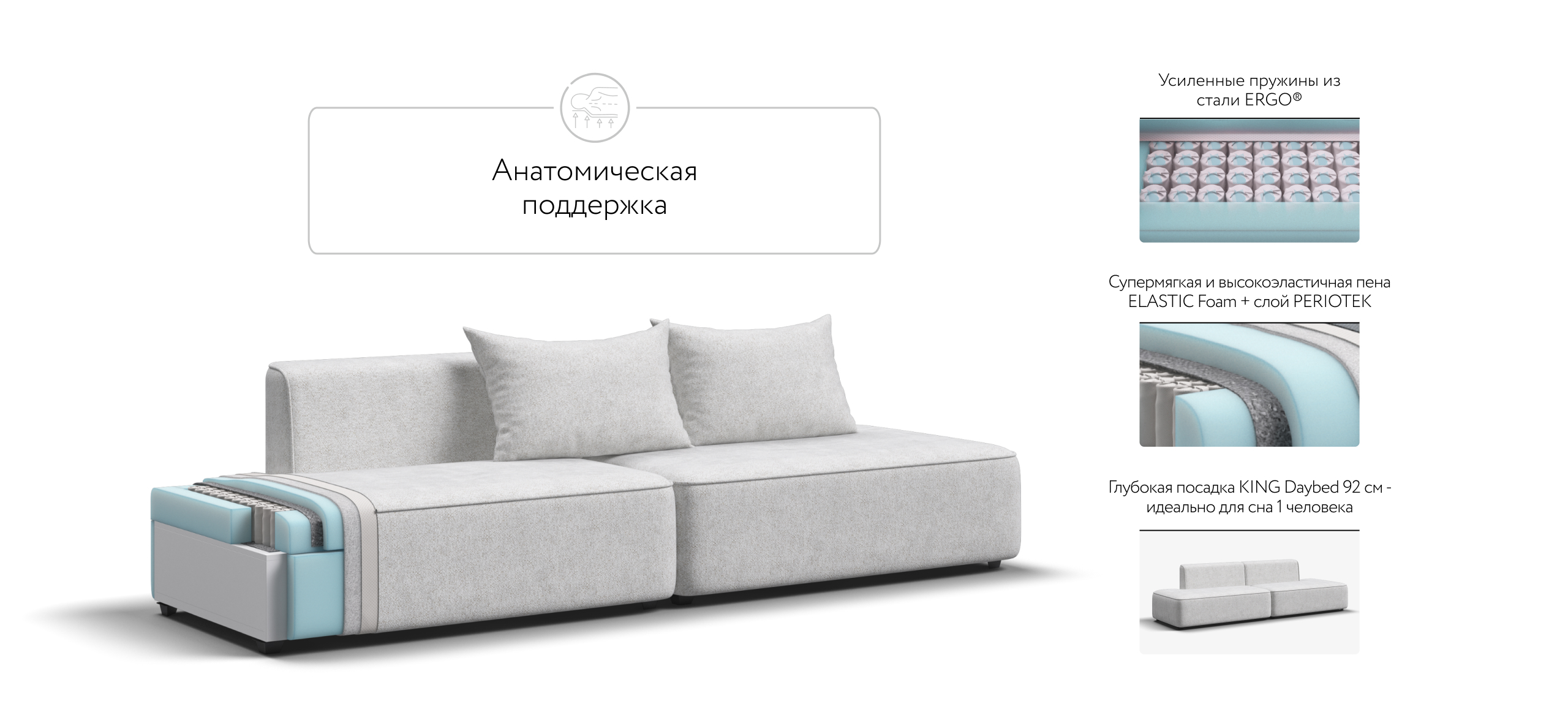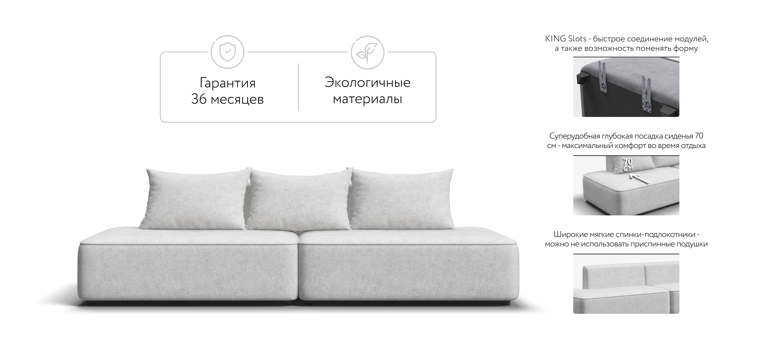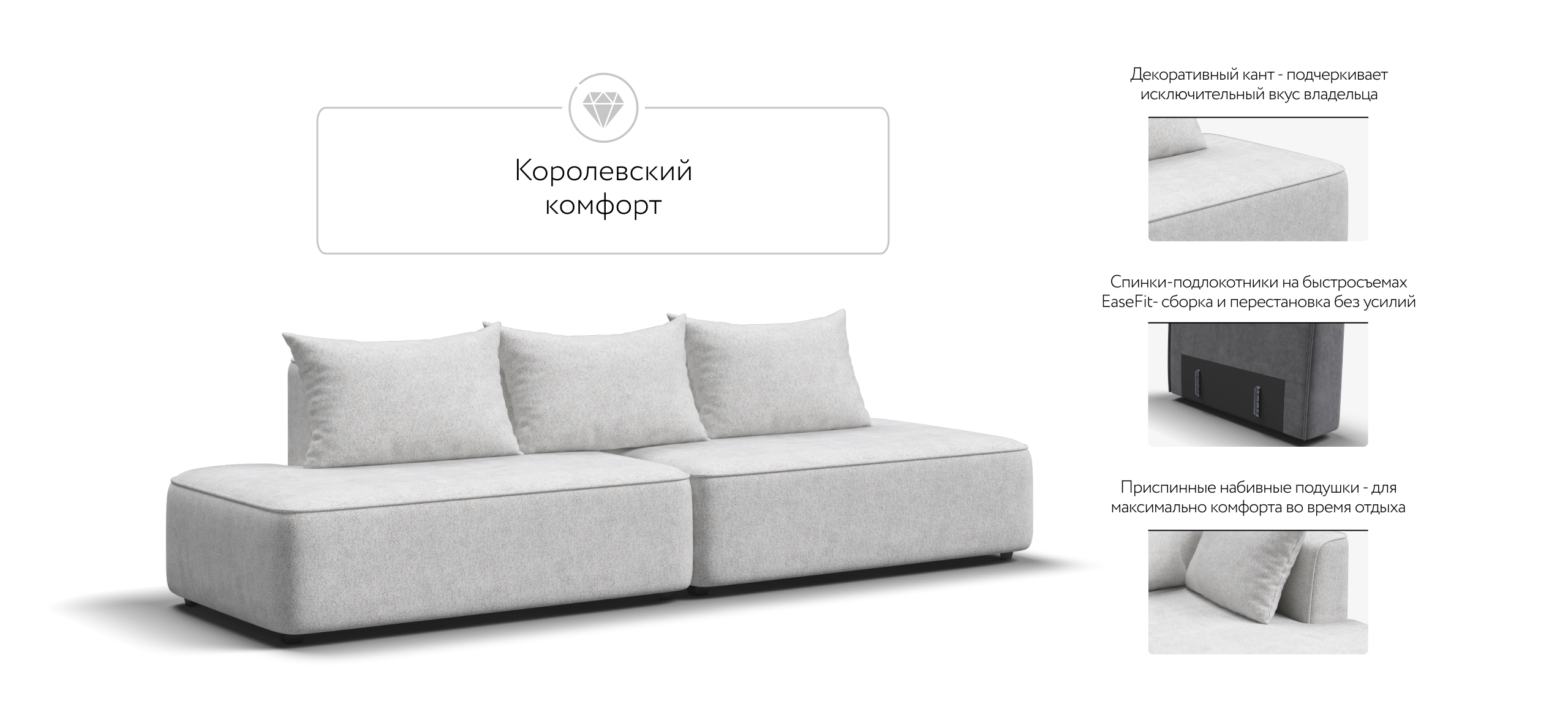 Благодаря инновационной системе креплений и быстросъёмным элементам Вы с лёгкостью можете поменять конфигурацию и адаптировать диван под новое пространство.