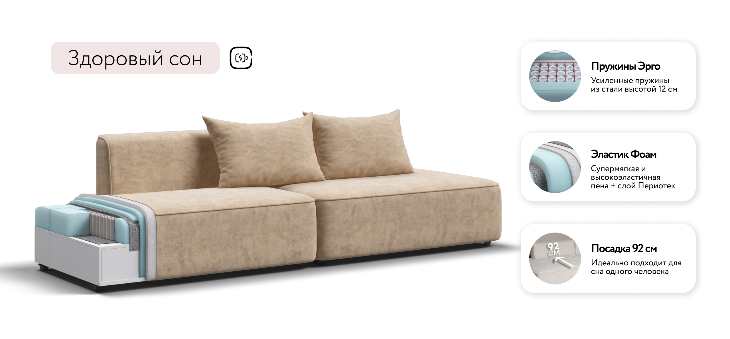 Глубокое сиденье и независимые пружины в основании словно созданы для полного расслабления, а мягкие спинки обеспечивают комфорт без лишних подушек.