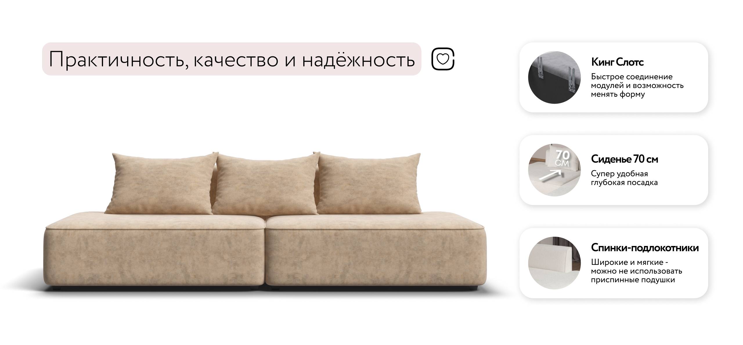 Благодаря инновационной системе креплений и быстросъёмным элементам Вы с лёгкостью можете поменять конфигурацию и адаптировать диван под новое пространство.