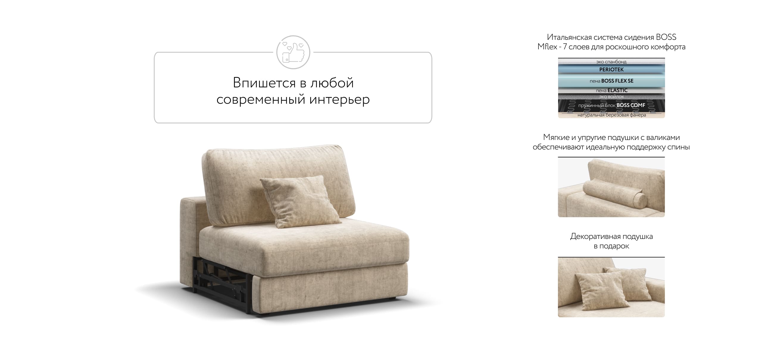 Испанская система сидения BOSS Mflex работает вместе со стальным каркасом, обеспечивая максимальную поддержку вашего тела и сохраняя внешний вид дивана на протяжении многих лет. Подушки с валиками обеспечивают идеальную поддержку спины для полноценного отдыха.