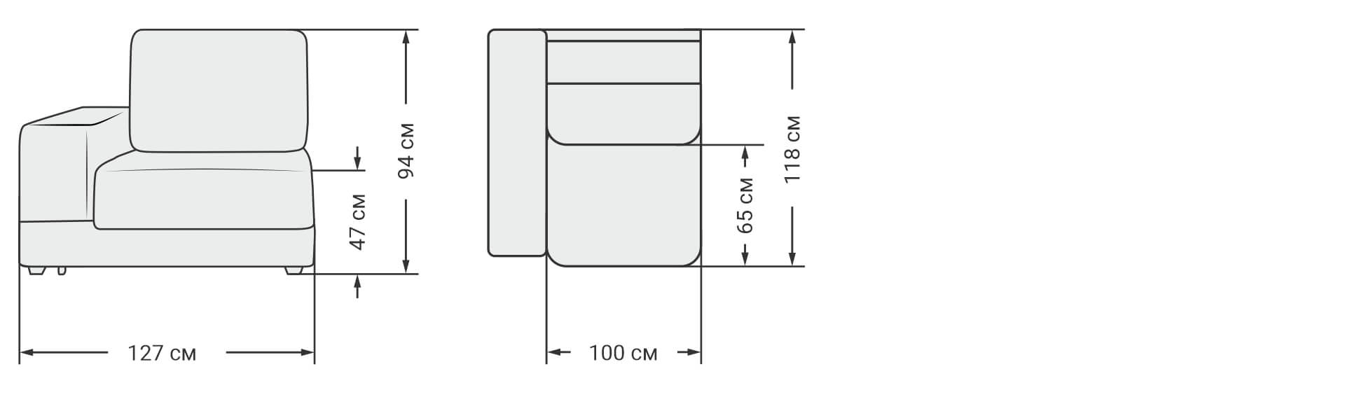 Дополните модуль мягким подлокотником, либо подлокотником полкой из ЛДСП. Модуль не универсальный, он может быть установлен только на правую сторону модульной системы.Характеристики