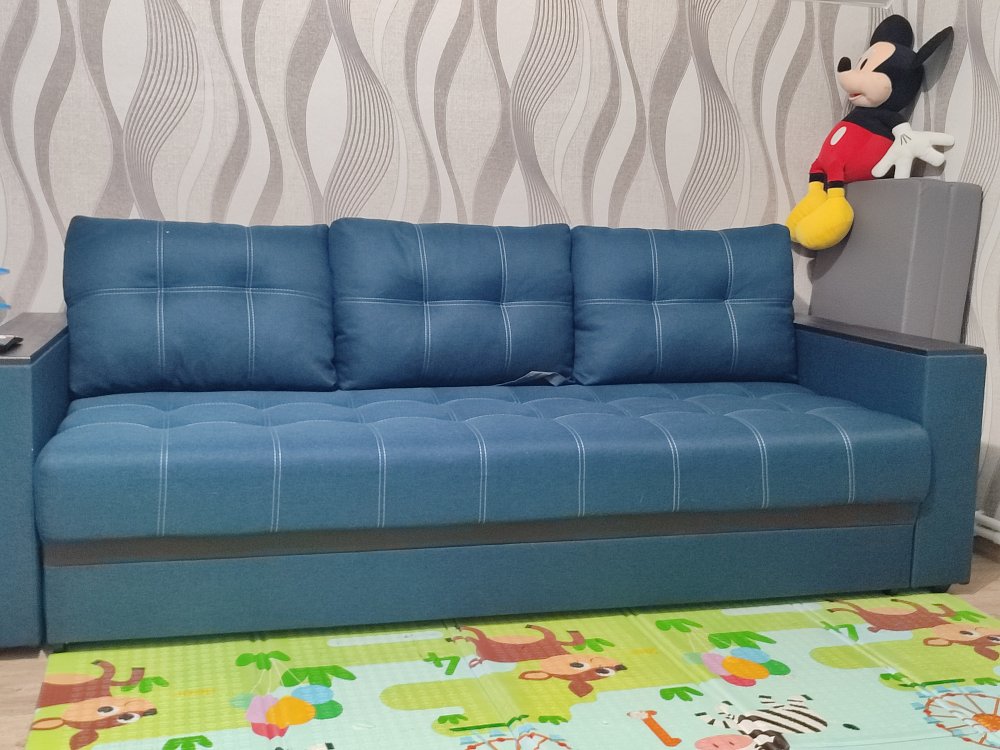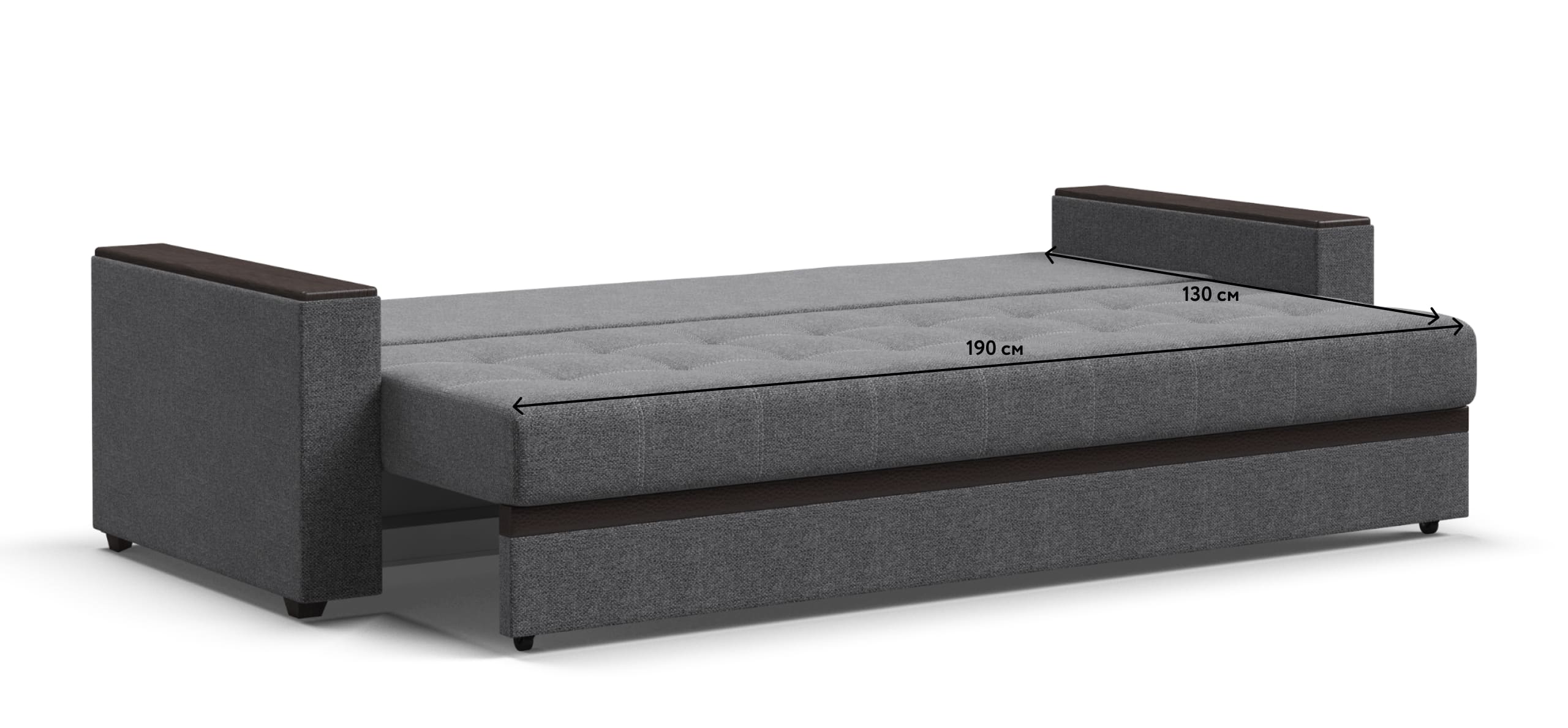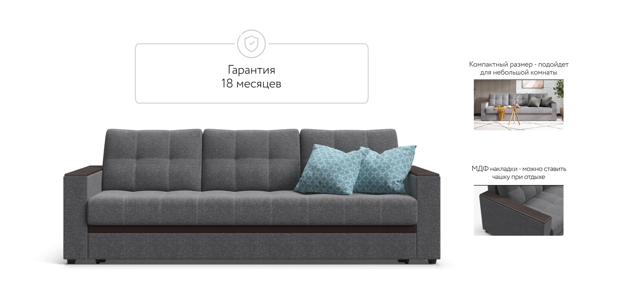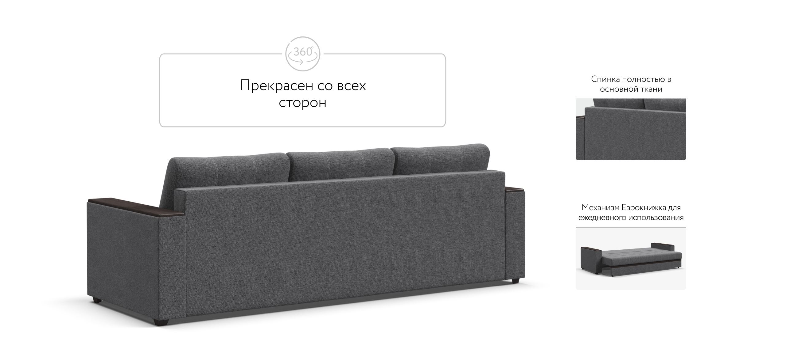 Оптимальный для ежедневного использования механизм трансформации Еврокнижка, за считанные секунды, без малейших усилий поможет превратить диван в полноценную кровать с высоким и ровным спальным местом. Диван имеет удобные подлокотники из МДФ, которые можно использовать в качестве столика.