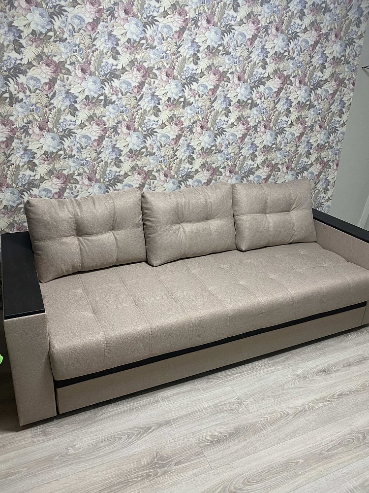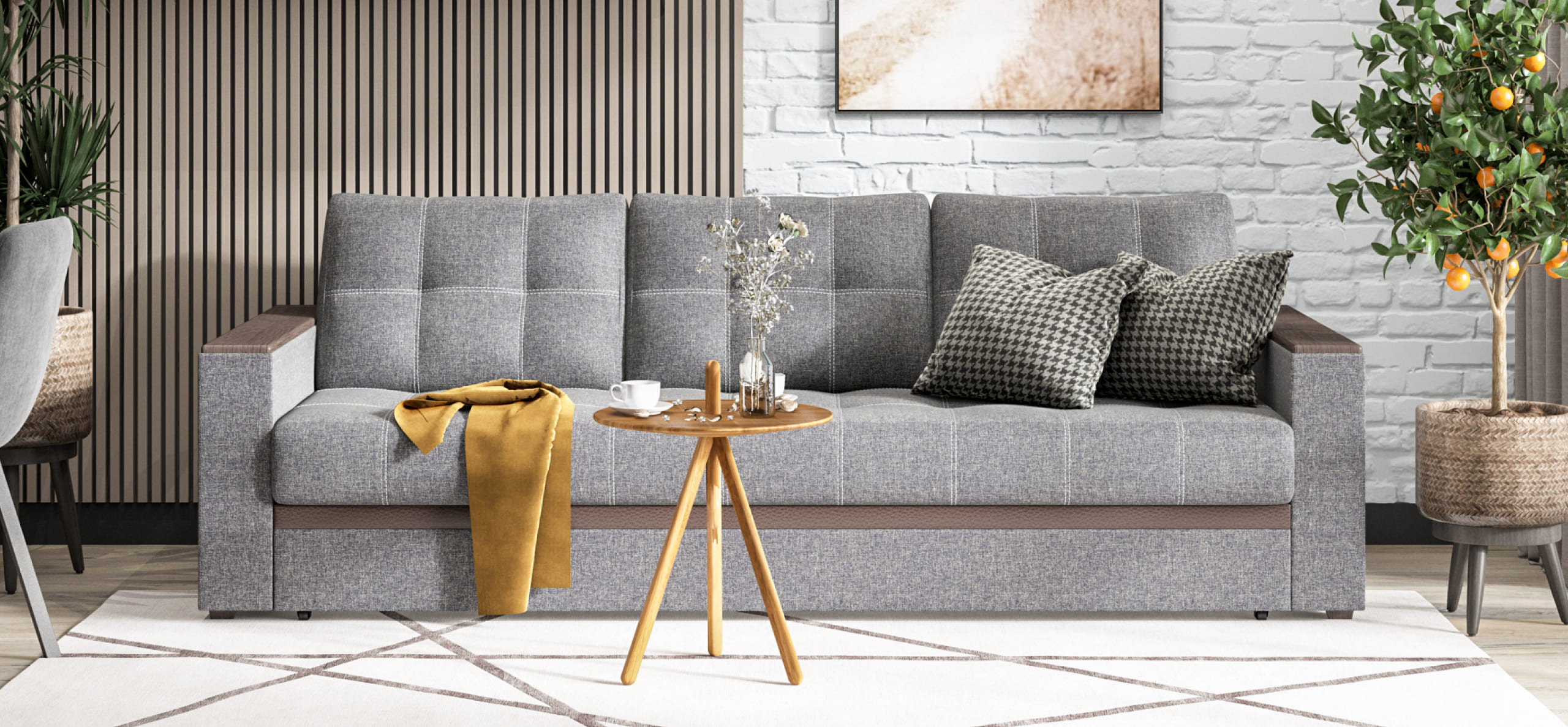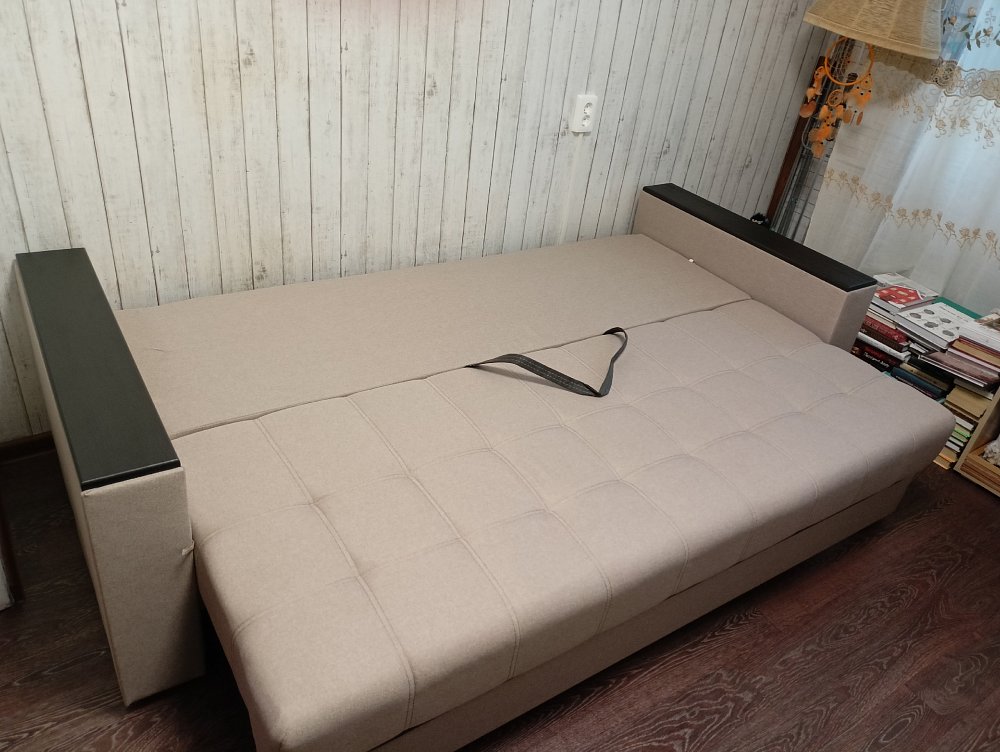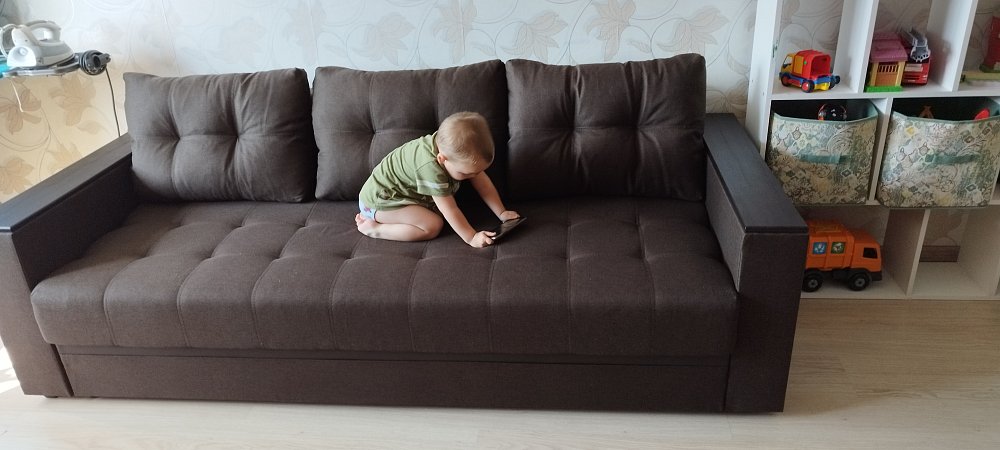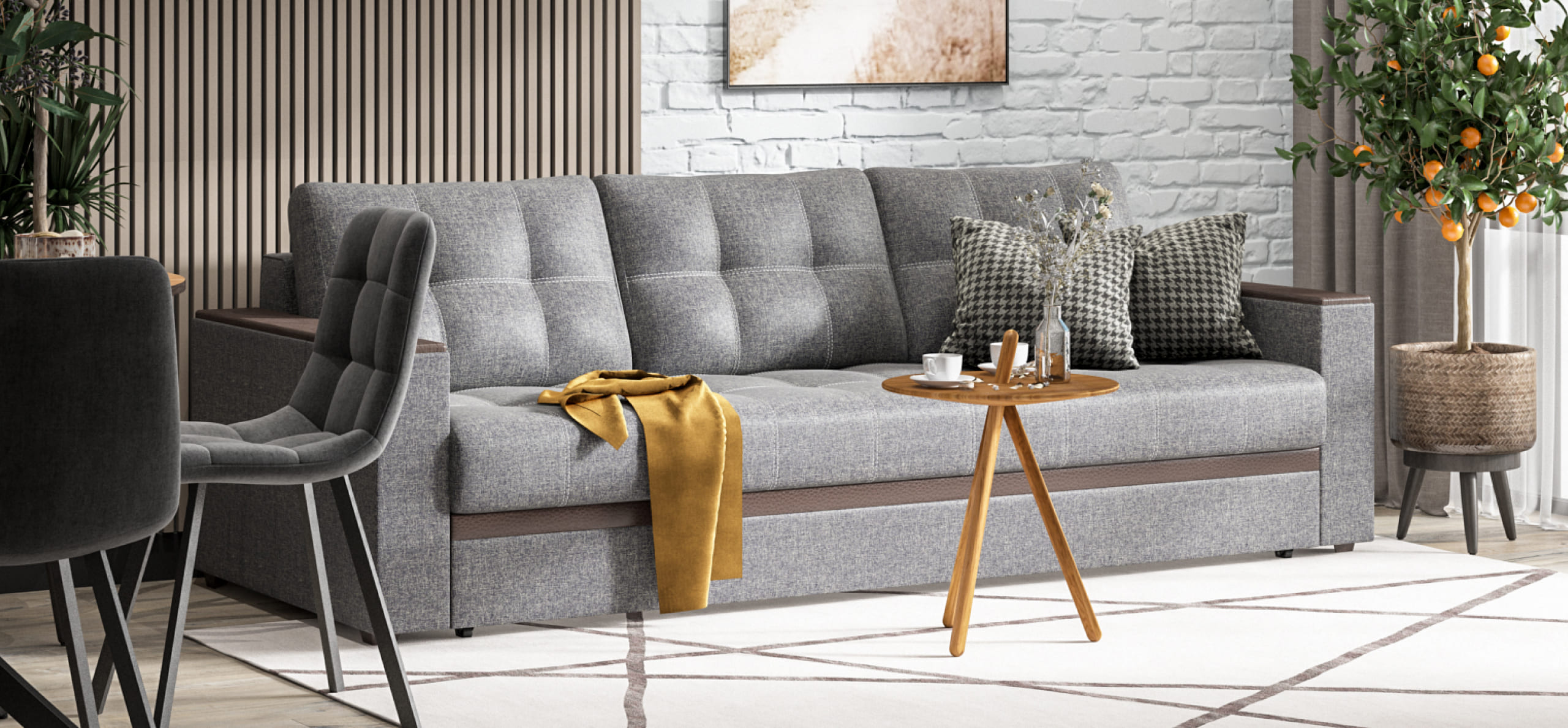 Оптимальный для ежедневного использования механизм трансформации Еврокнижка, за считанные секунды, без малейших усилий поможет превратить диван в полноценную кровать с высоким и ровным спальным местом. Диван имеет удобные подлокотники из МДФ, которые можно использовать в качестве столика.