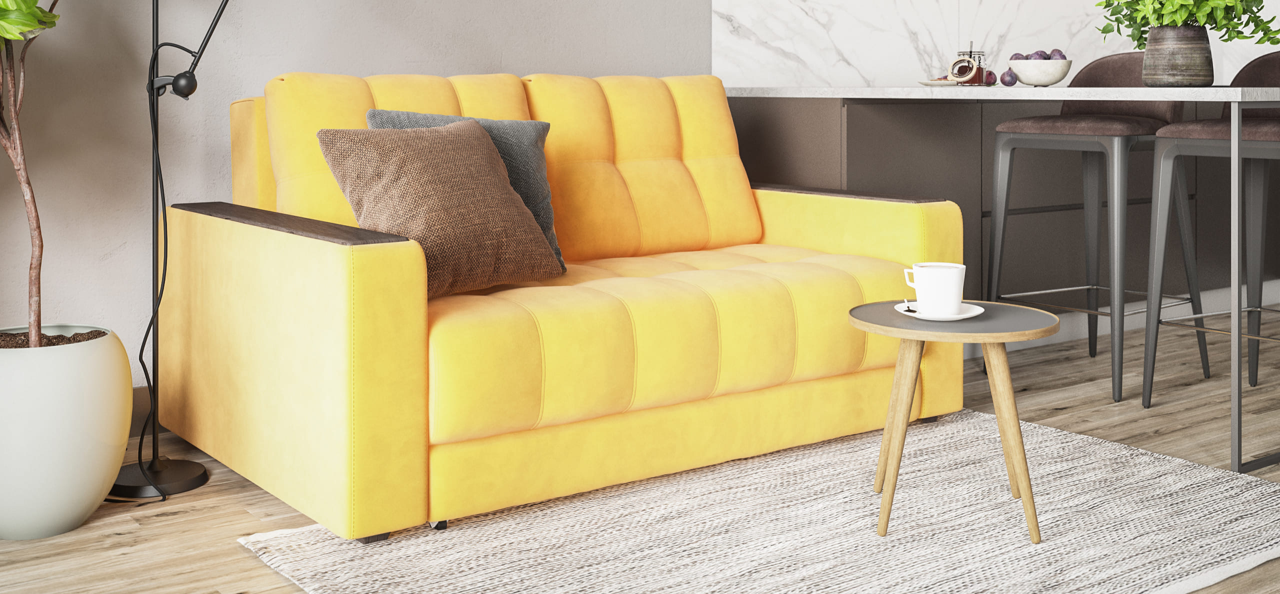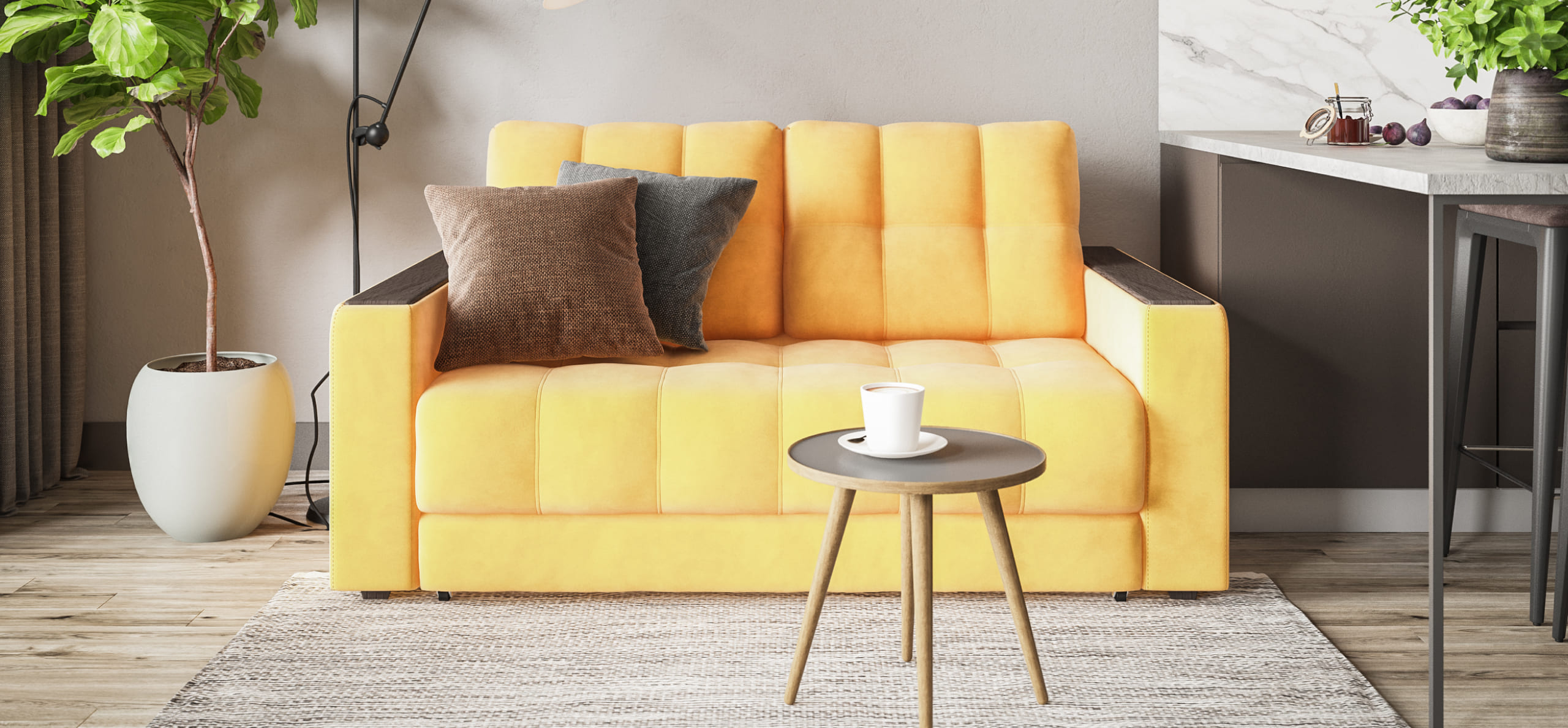 В свою однушку с диваном угадала, модель не громоздкая, выглядит достойно, цвет взяла пепел, вписался в интерьер хорошо, спасибо!