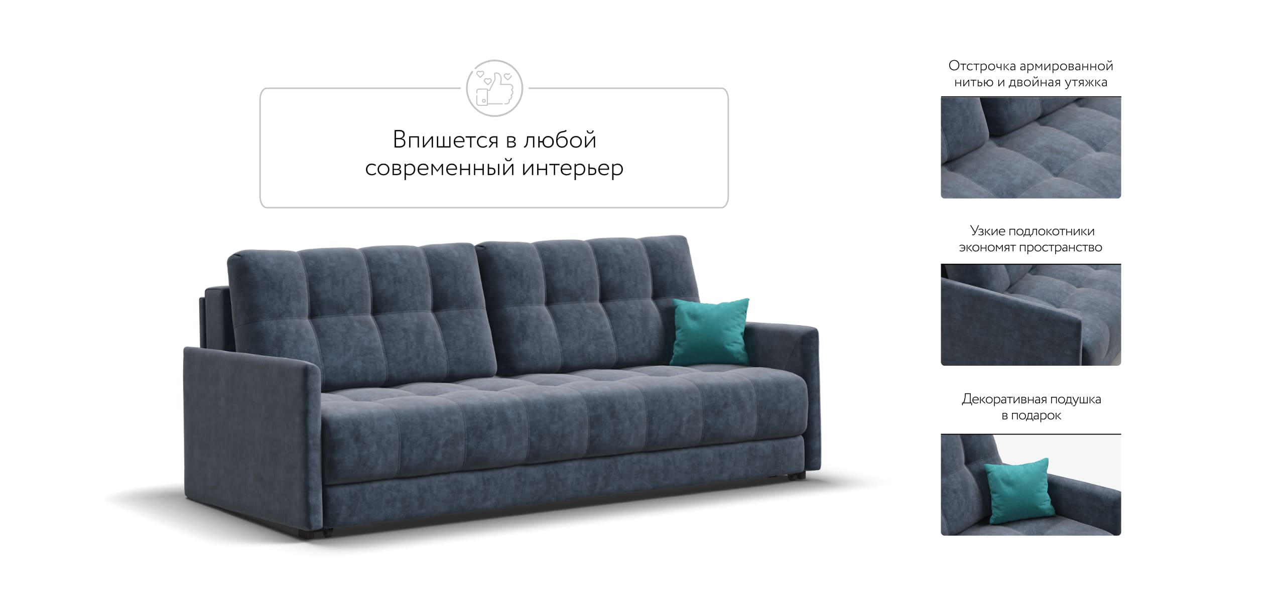 Легкая трансформация в три положения создаст для Вас максимально комфортный отдых, а улучшенное анатомическое основание в диване обеспечит Вам здоровый сон.