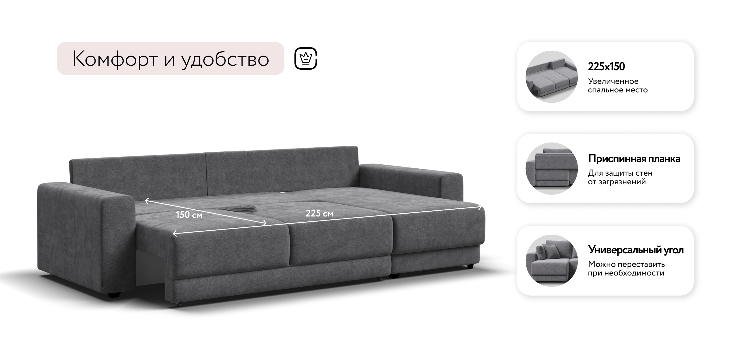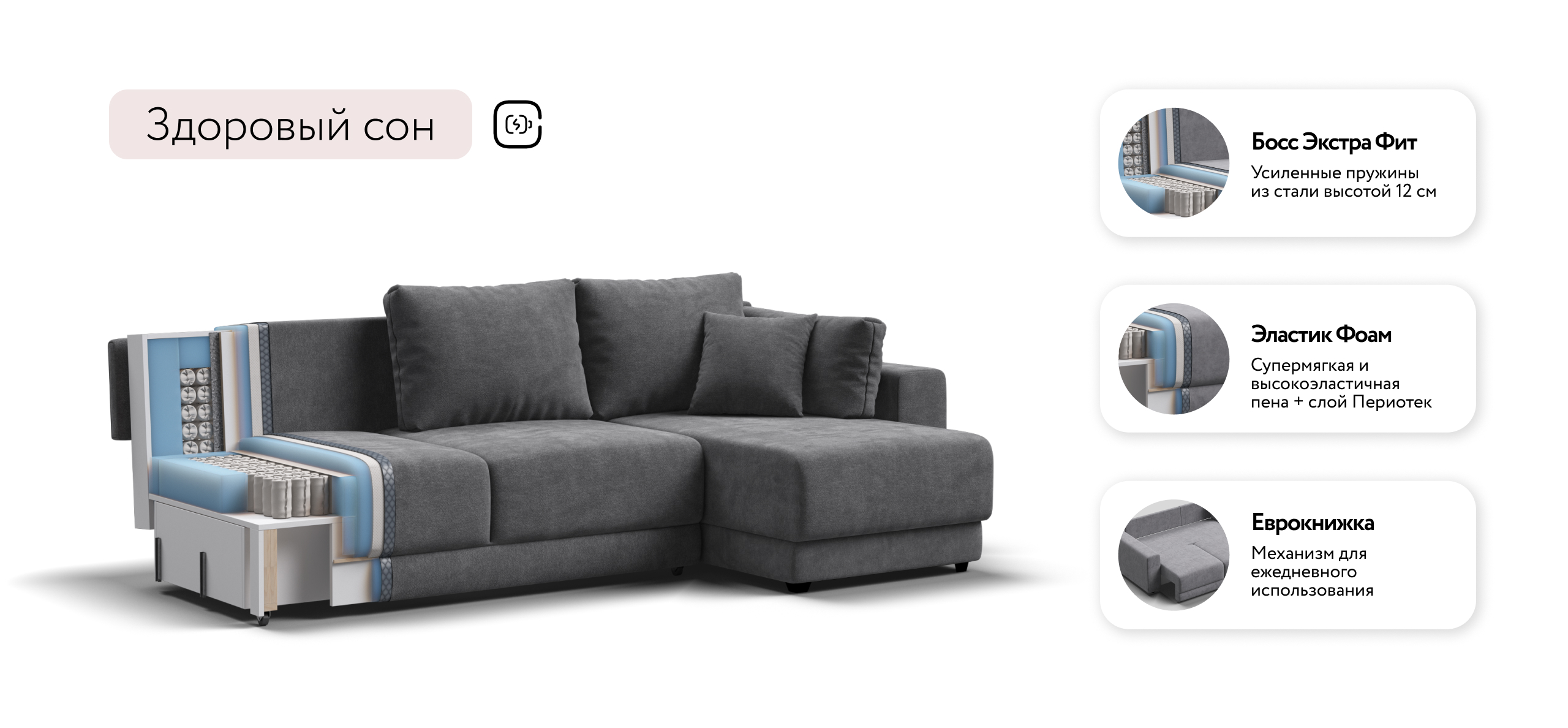 Оснащённый независимым пружинным блоком и высокоэластичной пеной Эластик Фоам с дополнительным слоем периотека, диван гарантирует анатомическую поддержку и комфортный сон. Простой и надёжный механизм трансформации «еврокнижка» позволяет легко преобразовать диван в просторное спальное место. Универсальный угол позволит Вам переставить оттоманку и поменять положение угла при необходимости.