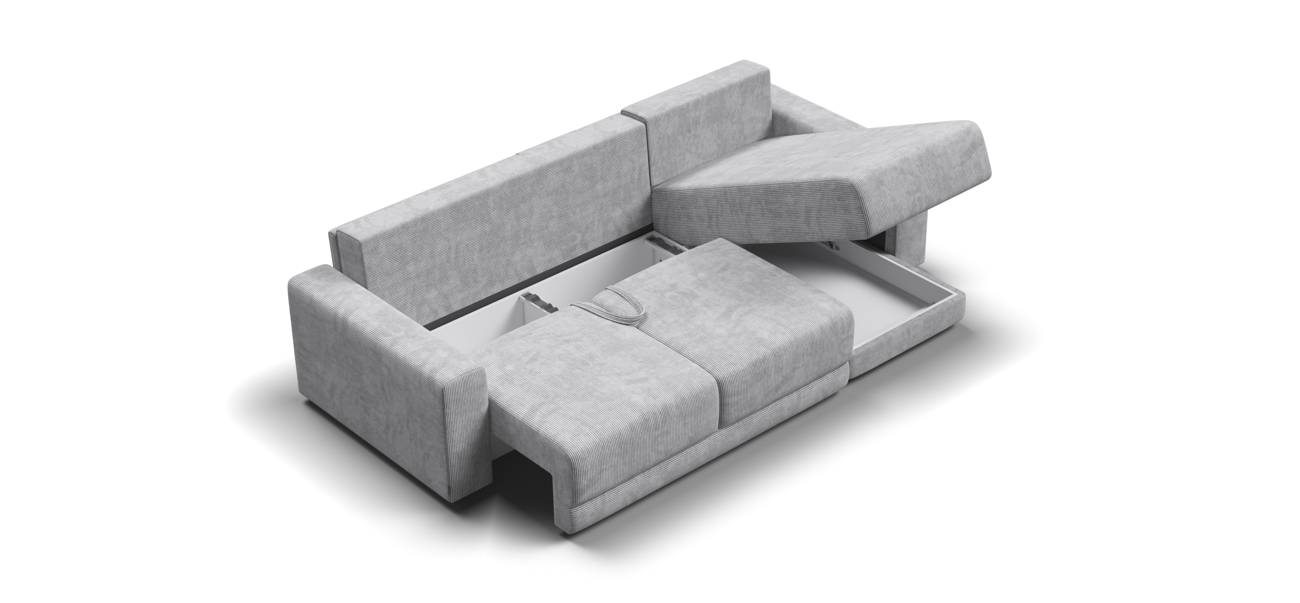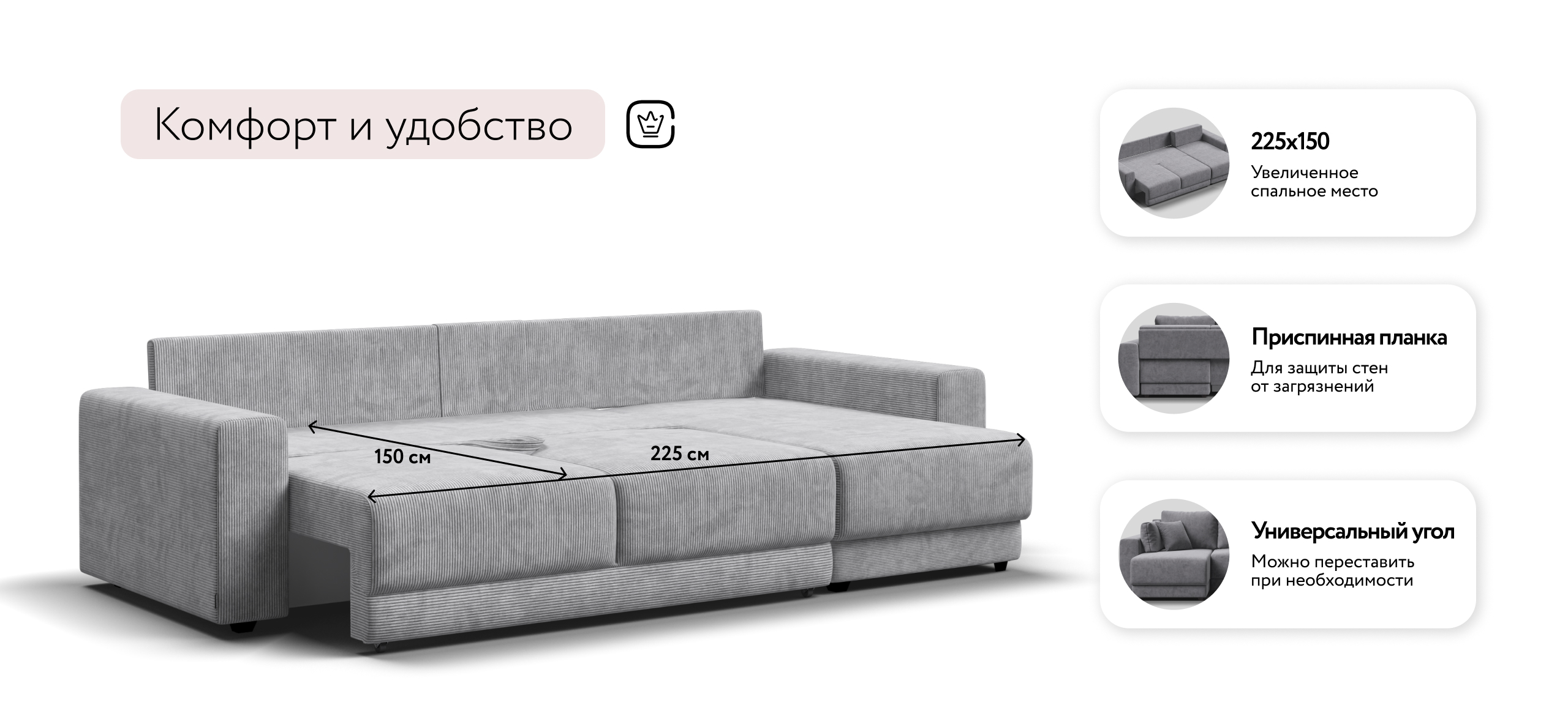 Оснащённый независимым пружинным блоком и высокоэластичной пеной Эластик Фоам с дополнительным слоем периотека, диван гарантирует анатомическую поддержку и комфортный сон. Простой и надёжный механизм трансформации «еврокнижка» позволяет легко преобразовать диван в просторное спальное место. Универсальный угол позволит Вам переставить оттоманку и поменять положение угла при необходимости.